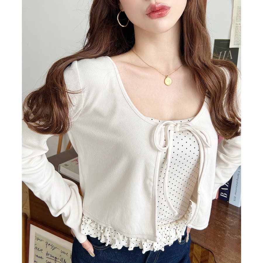フロントリボンカーディガン+ドットフリルキャミアンサンブル