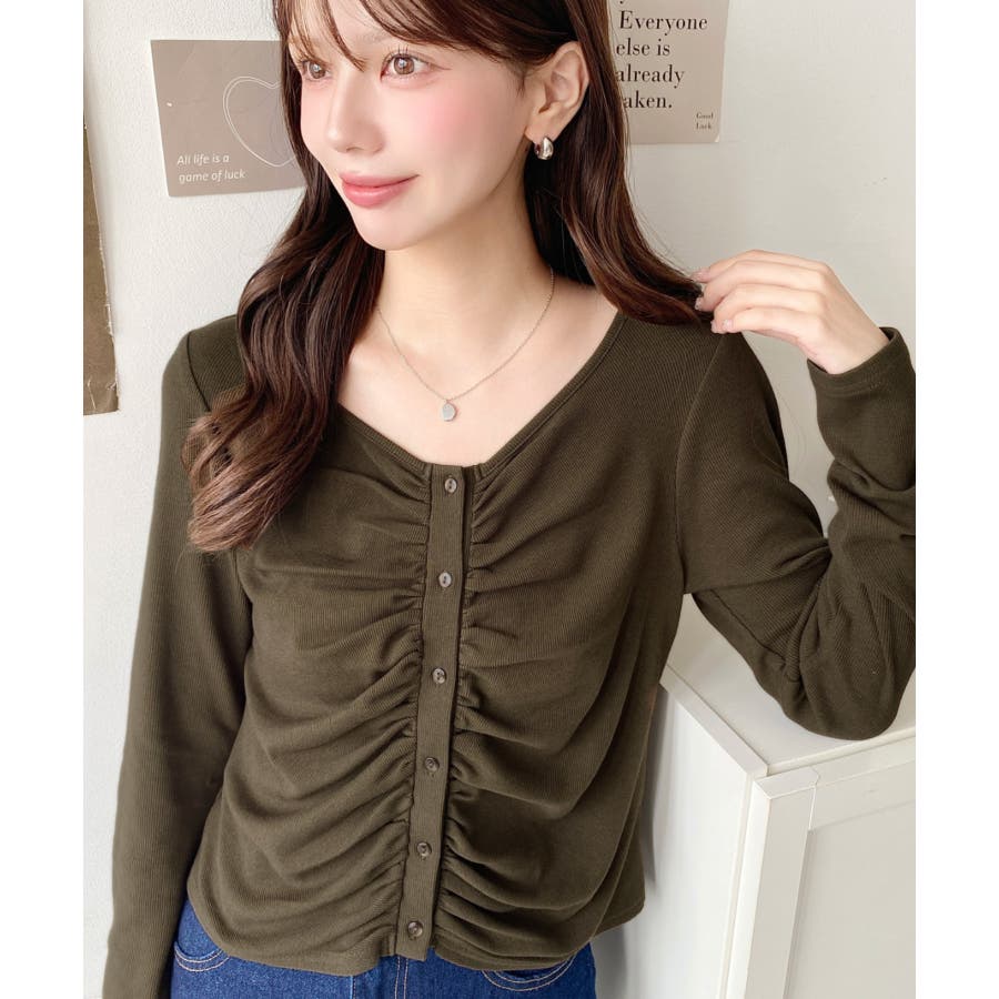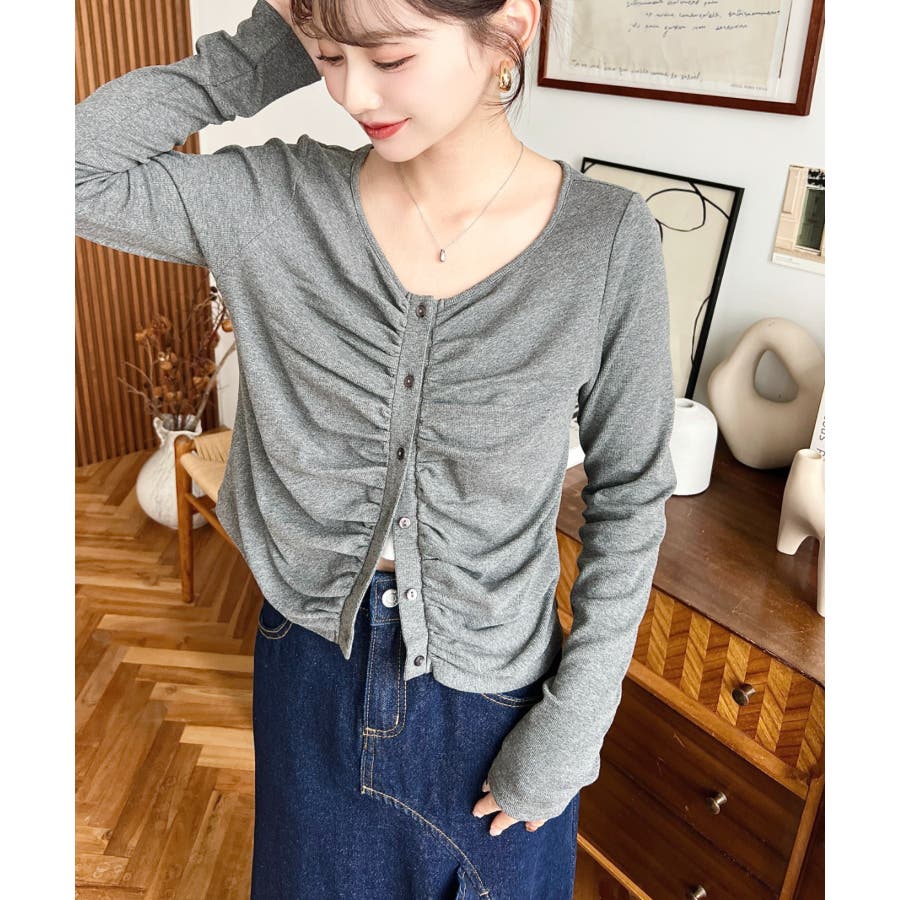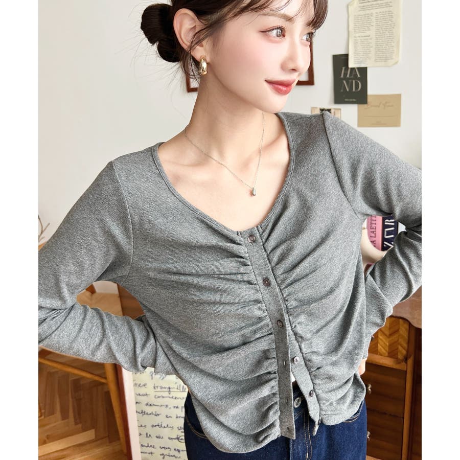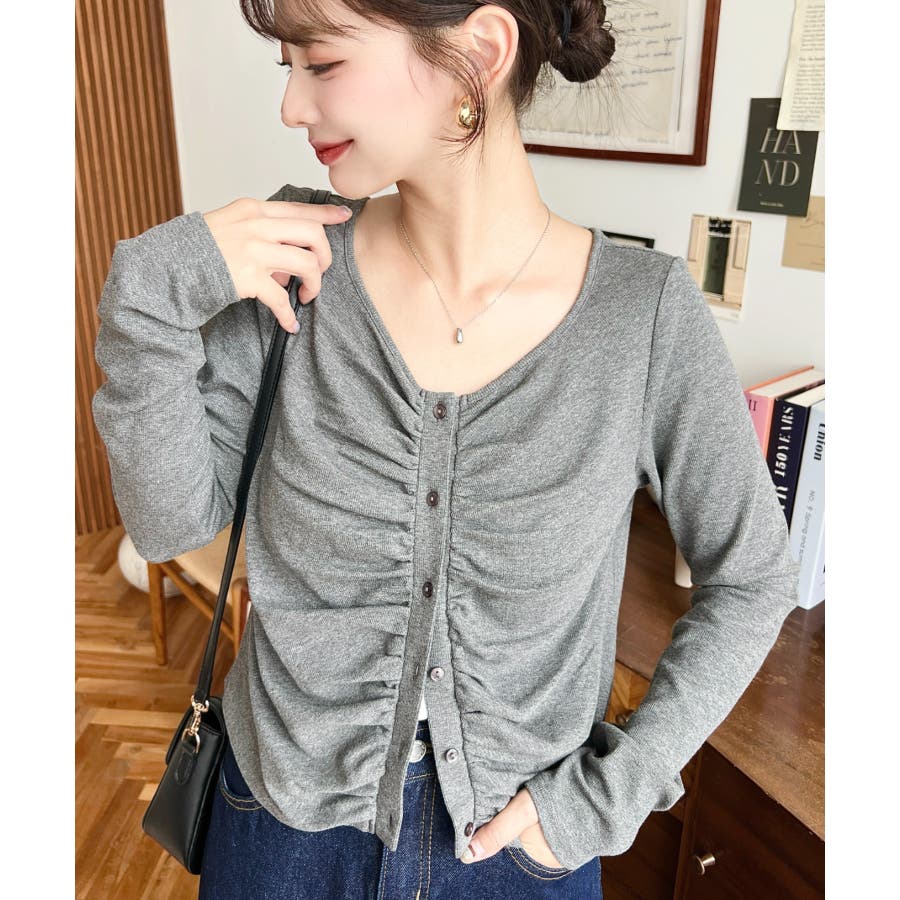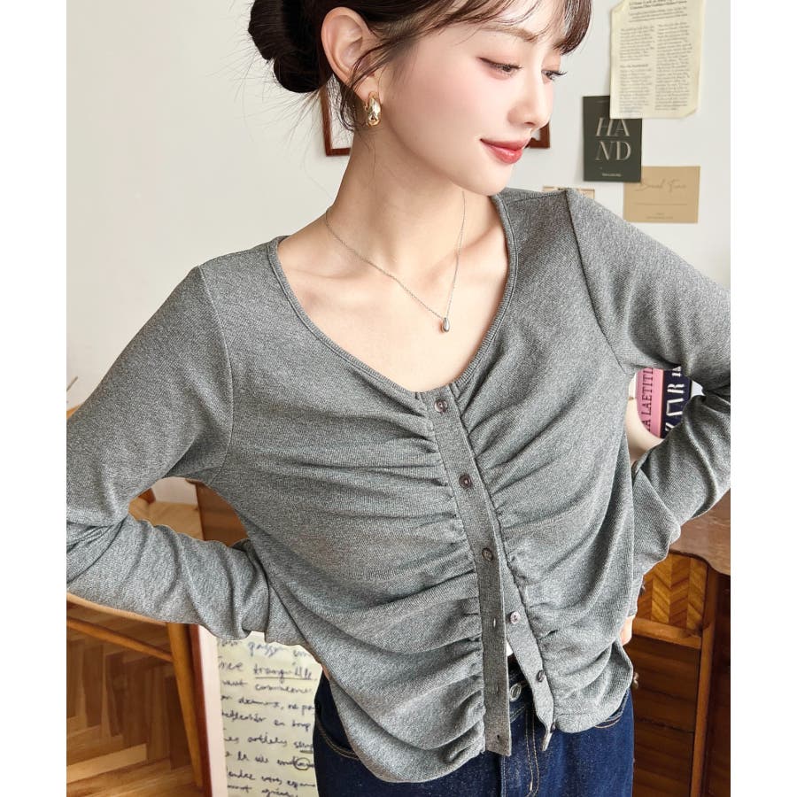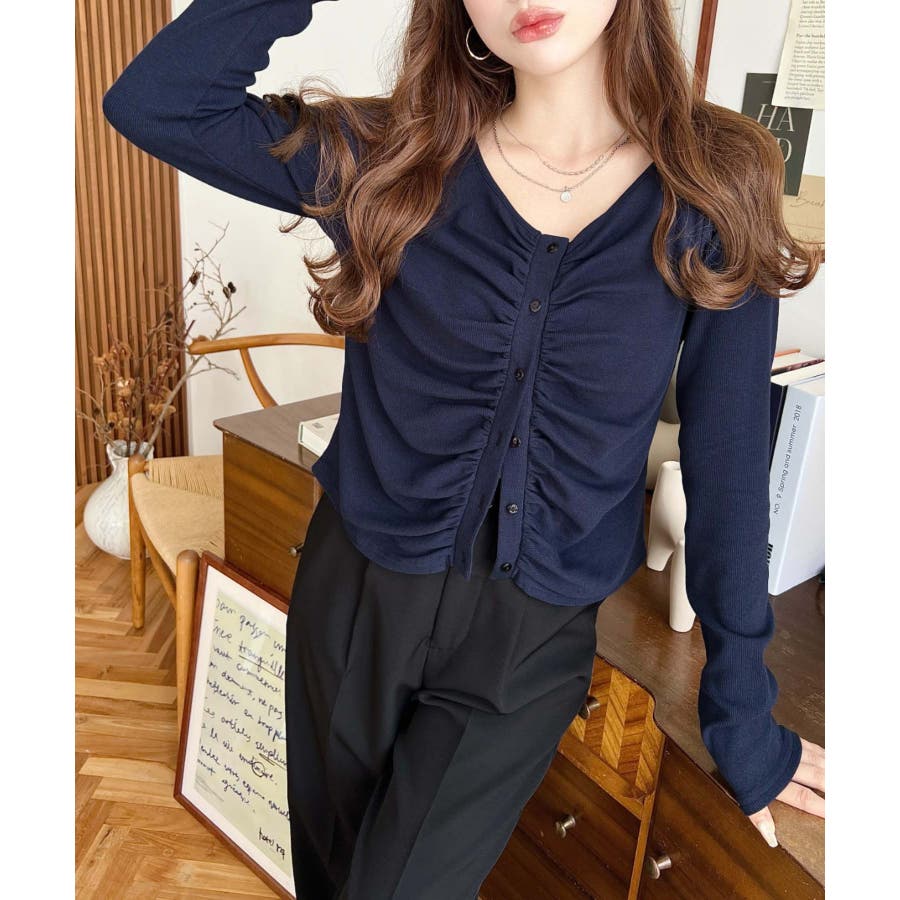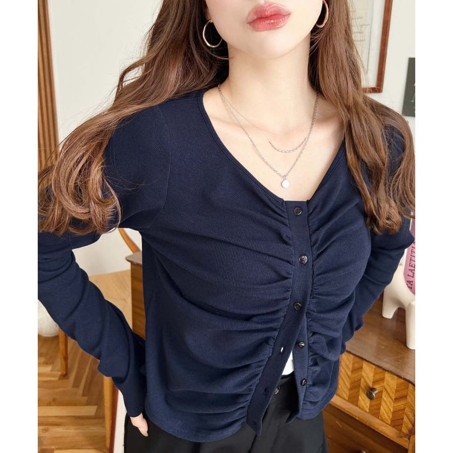 ・フロント部分に寄せられたギャザーデザインが印象的なでフェミニンなショート丈カーディガンです♪