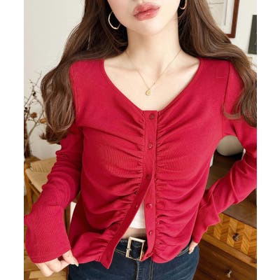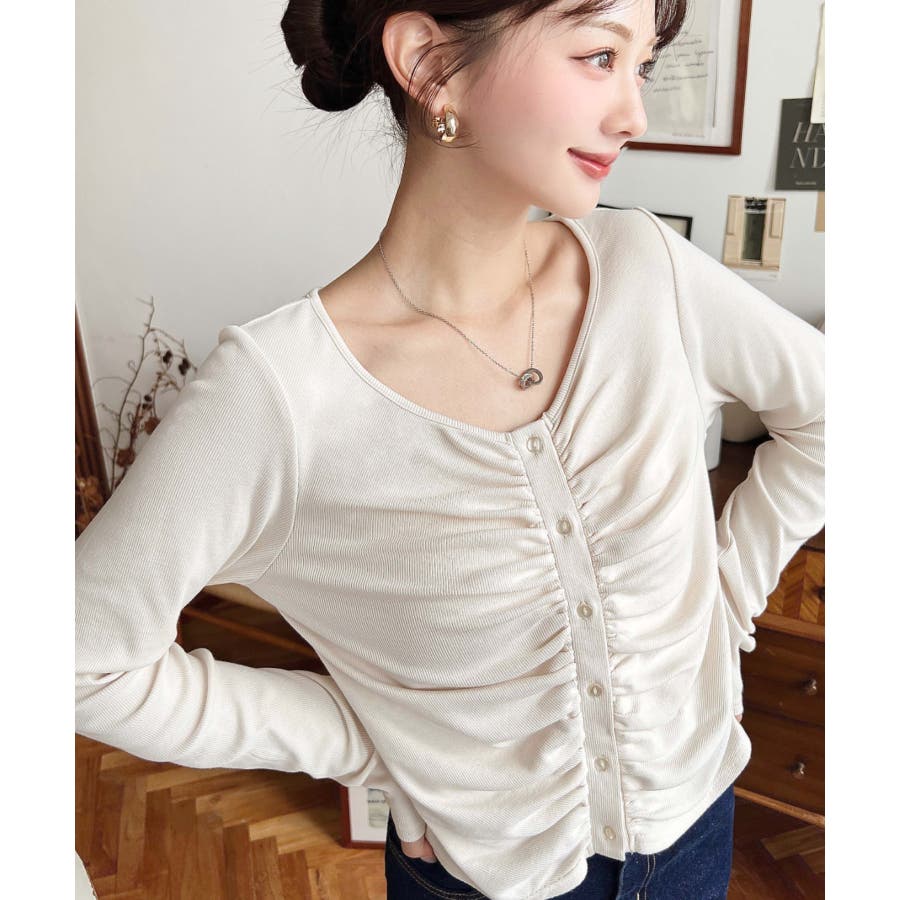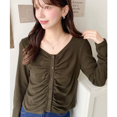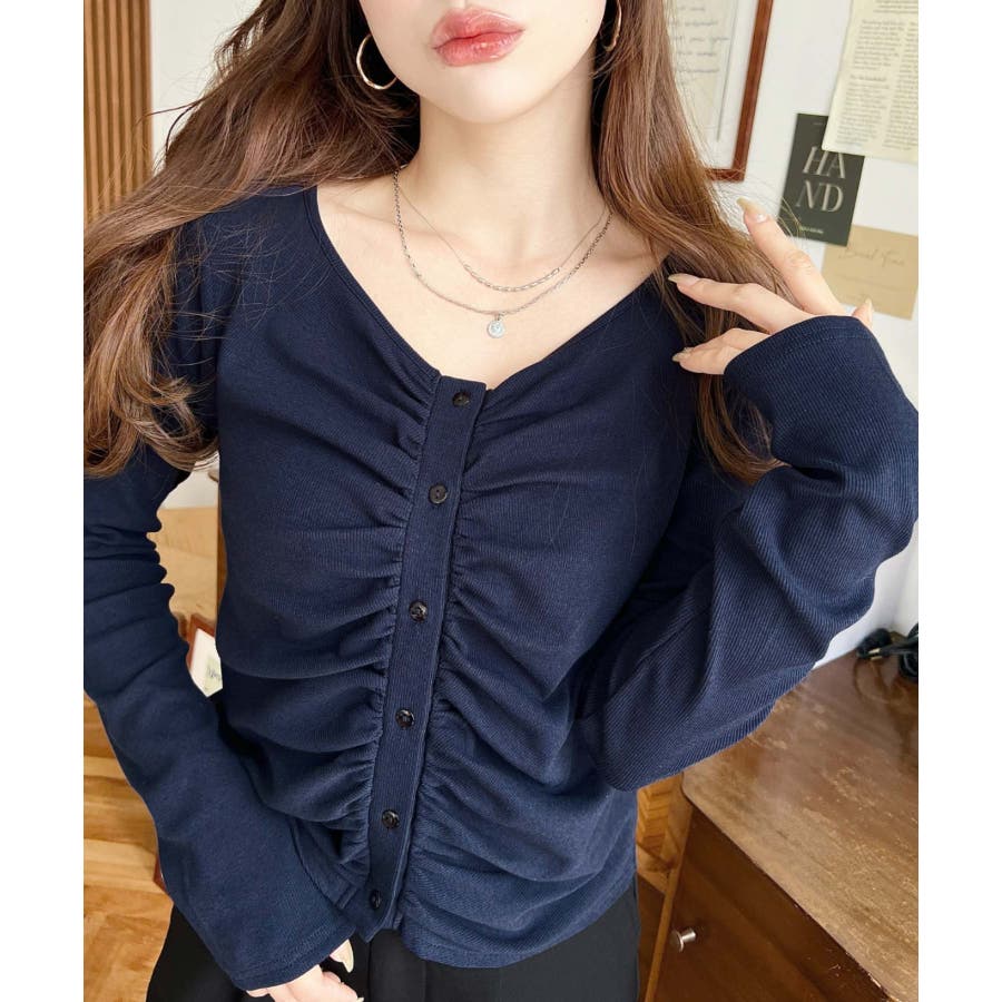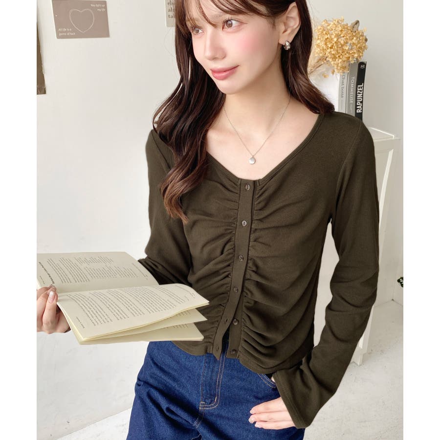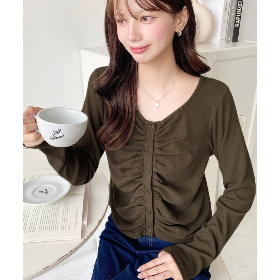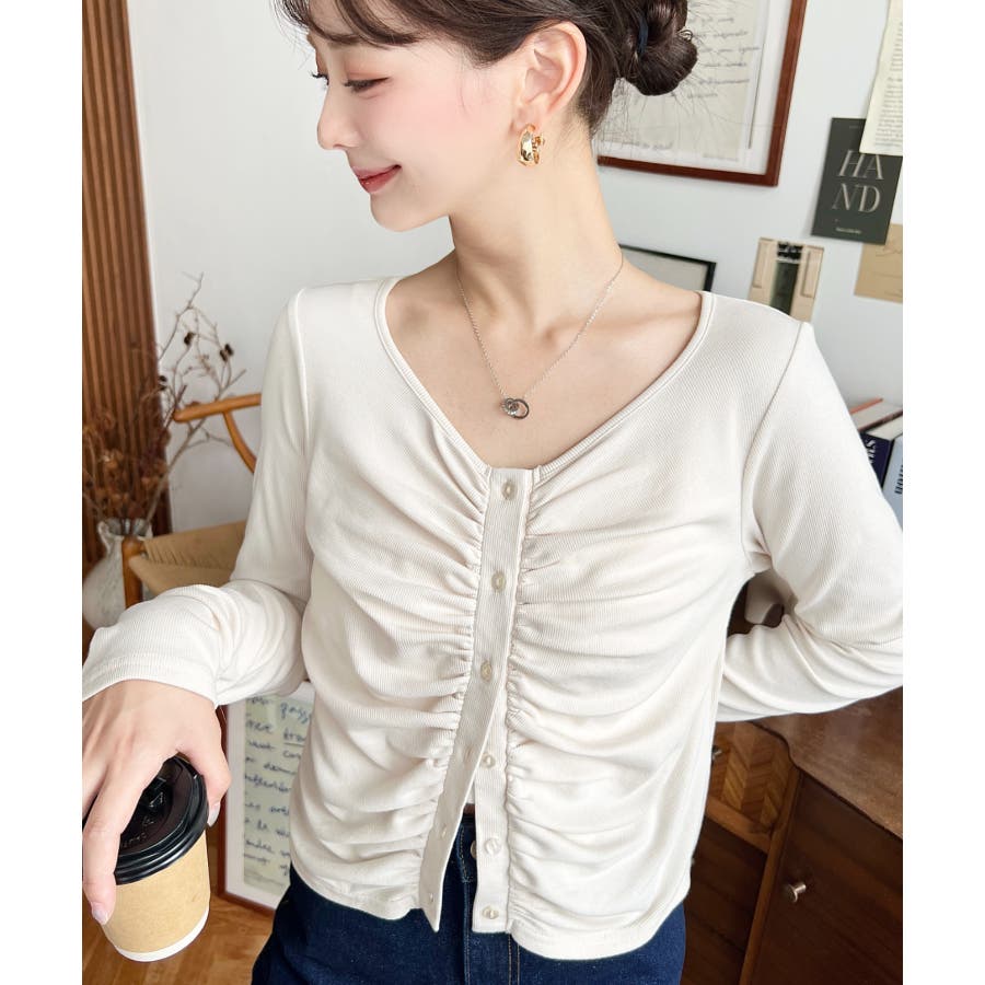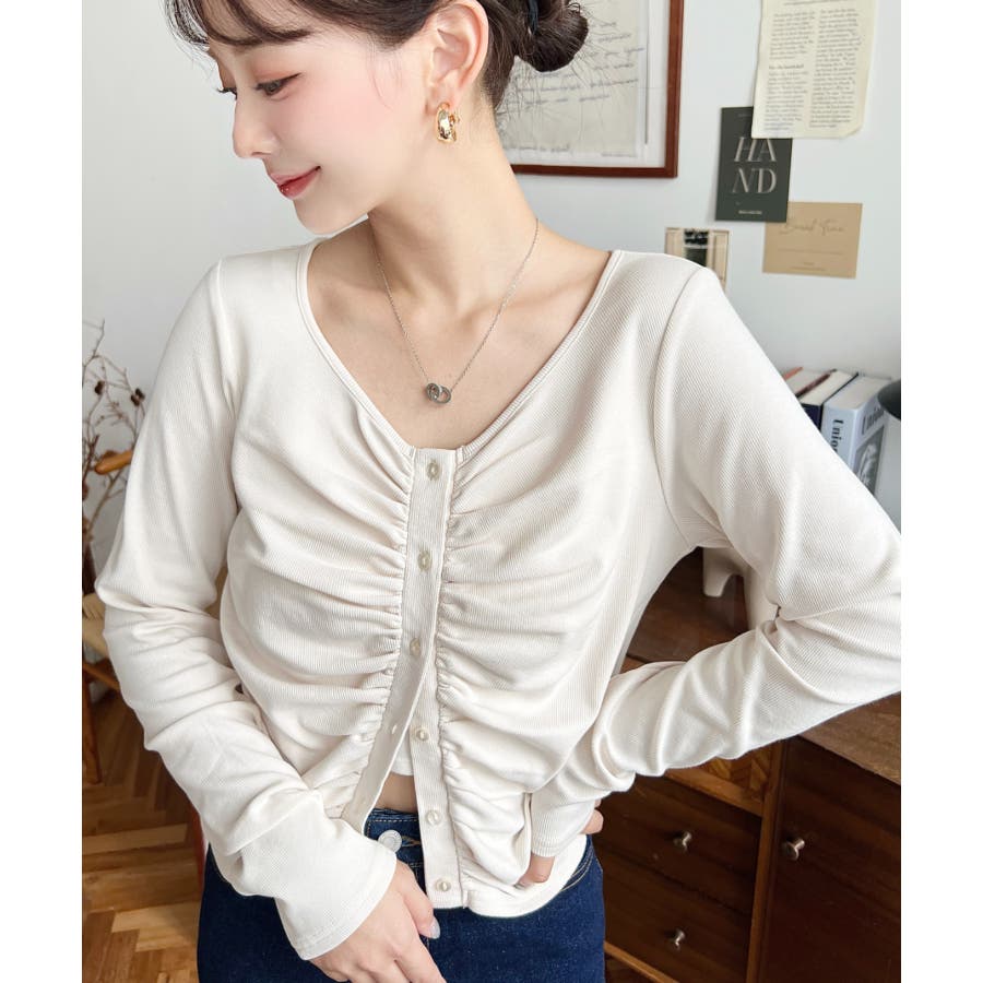 ・フロント部分に寄せられたギャザーデザインが印象的なでフェミニンなショート丈カーディガンです♪