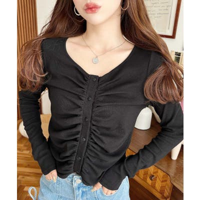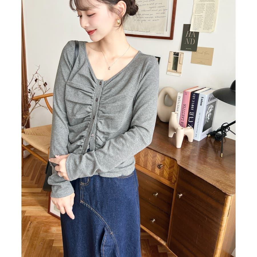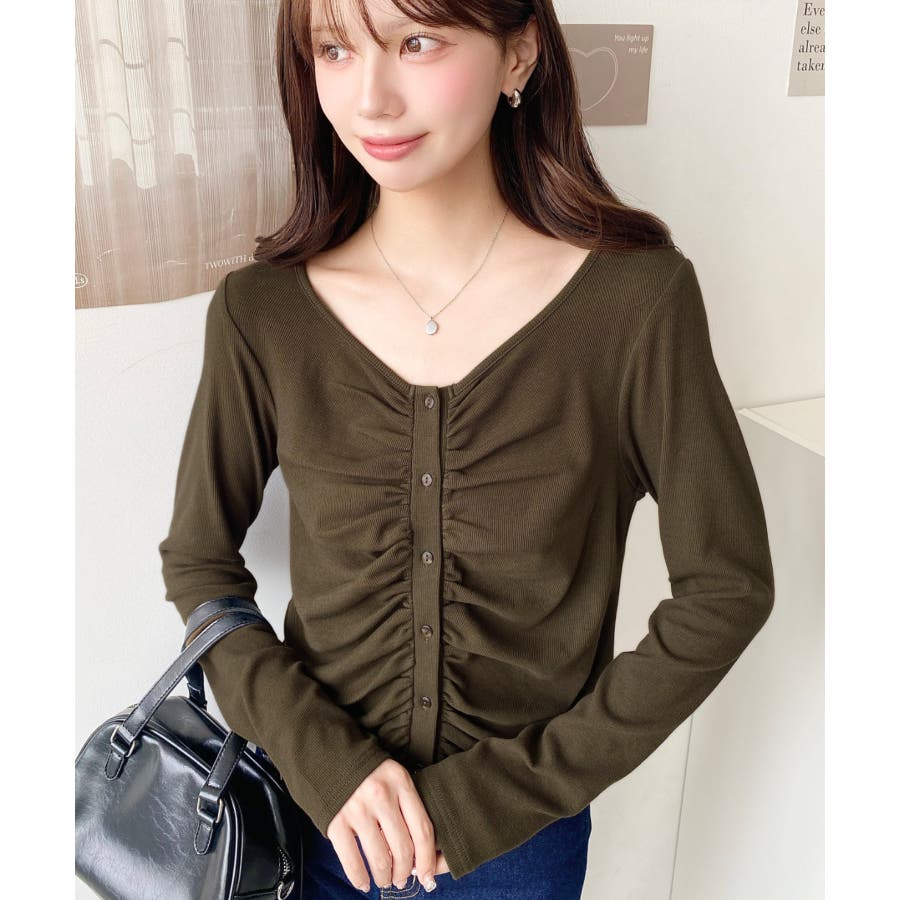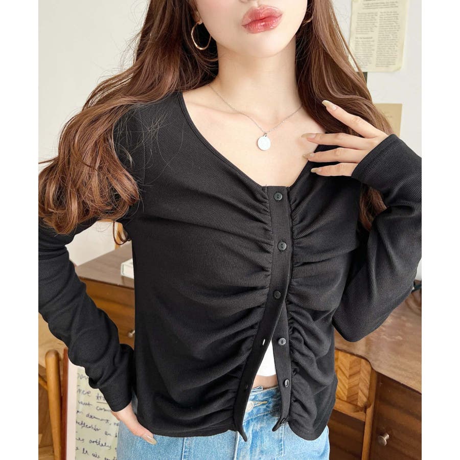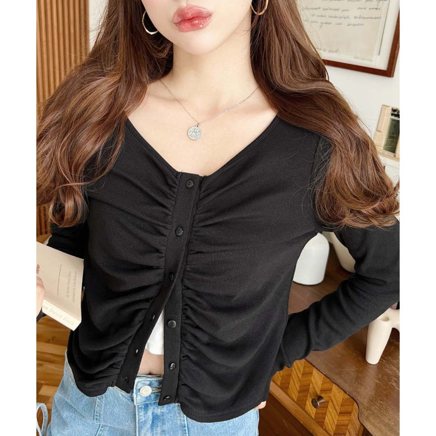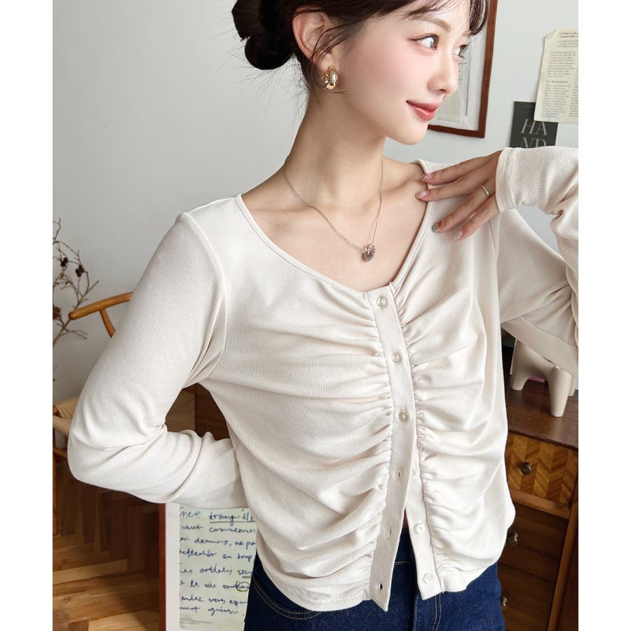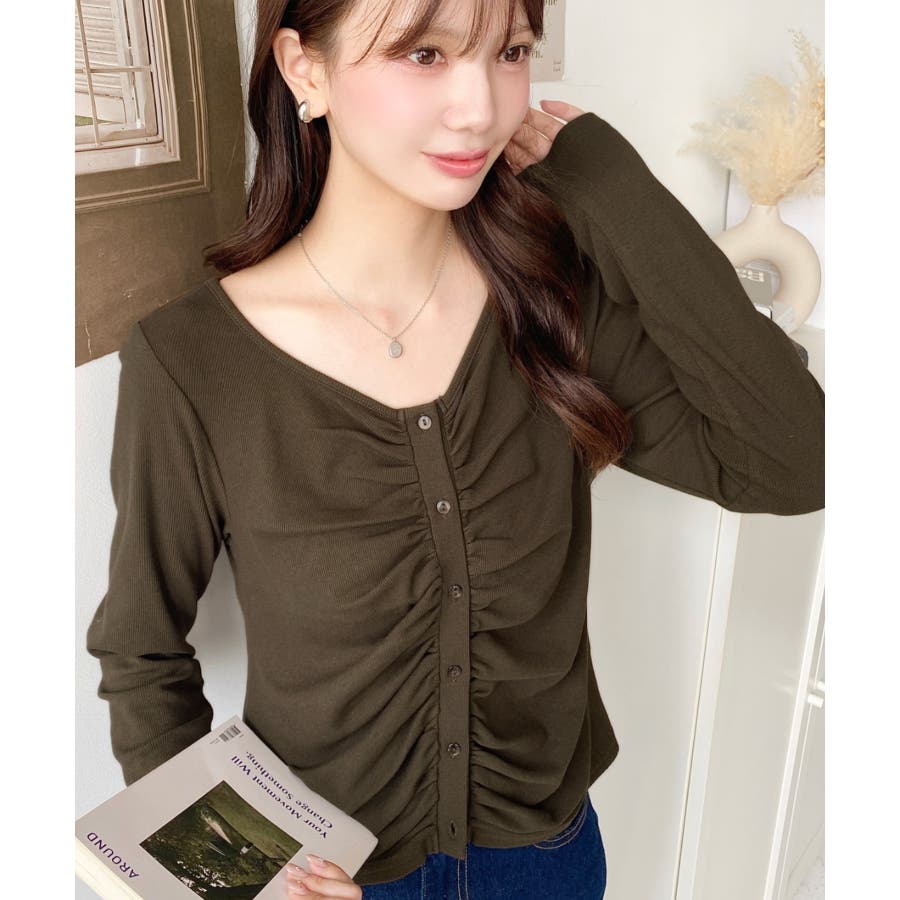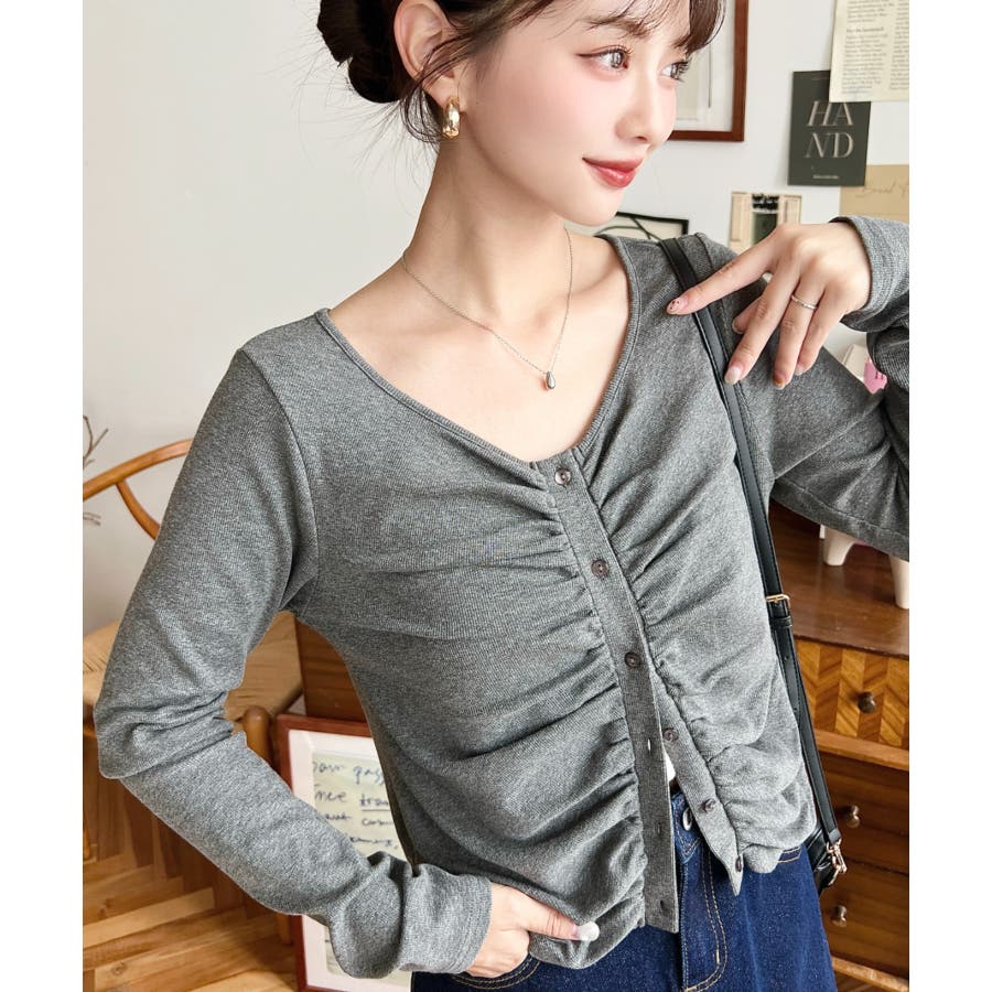 ・フロント部分に寄せられたギャザーデザインが印象的なでフェミニンなショート丈カーディガンです♪