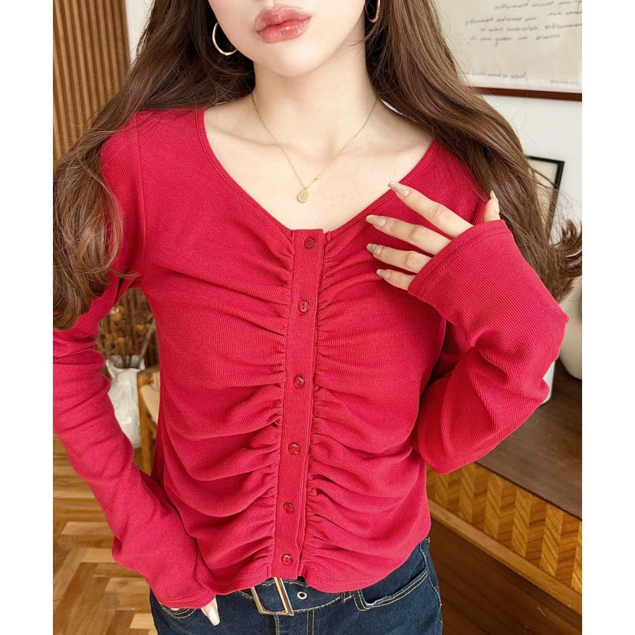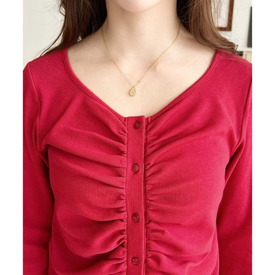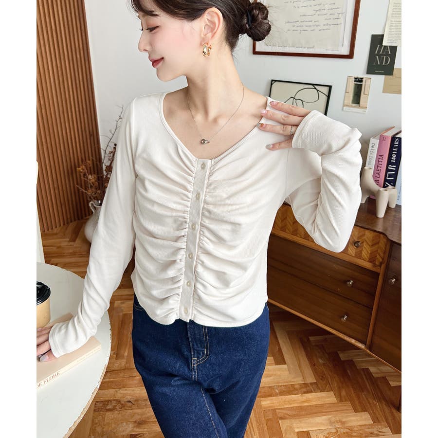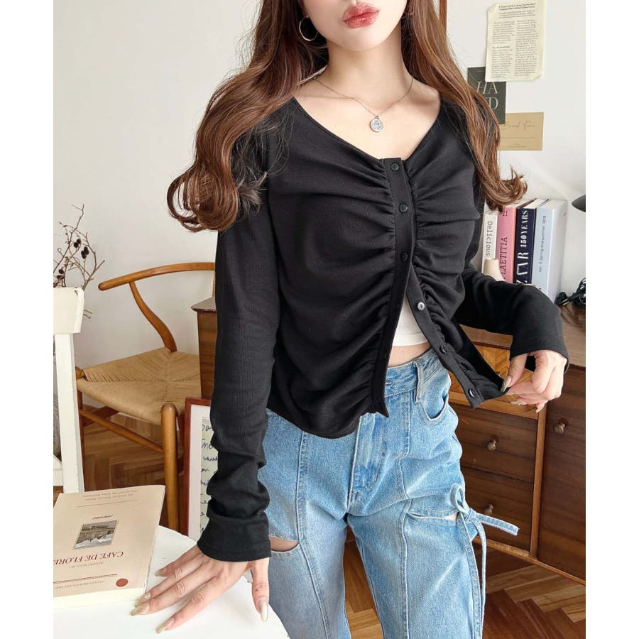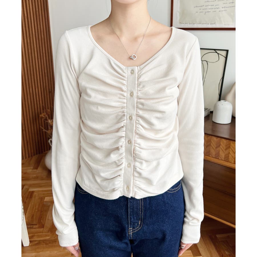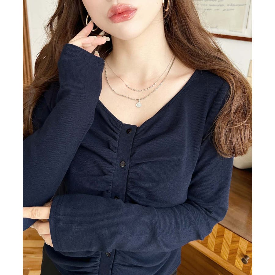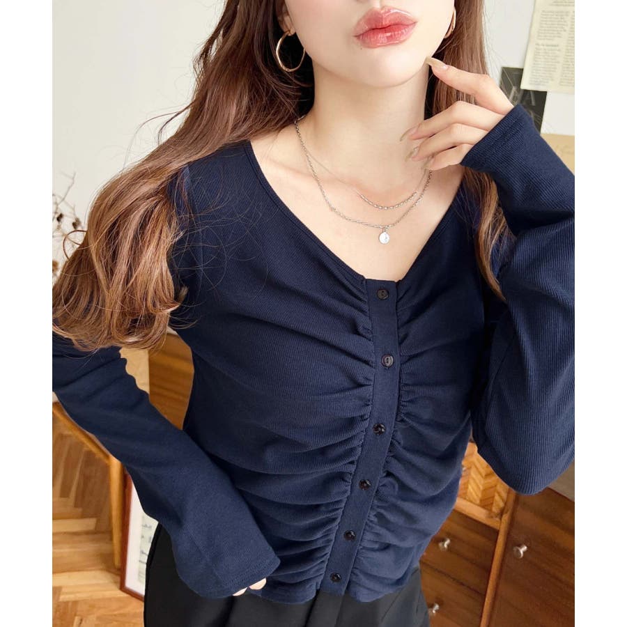 ・フロント部分に寄せられたギャザーデザインが印象的なでフェミニンなショート丈カーディガンです♪