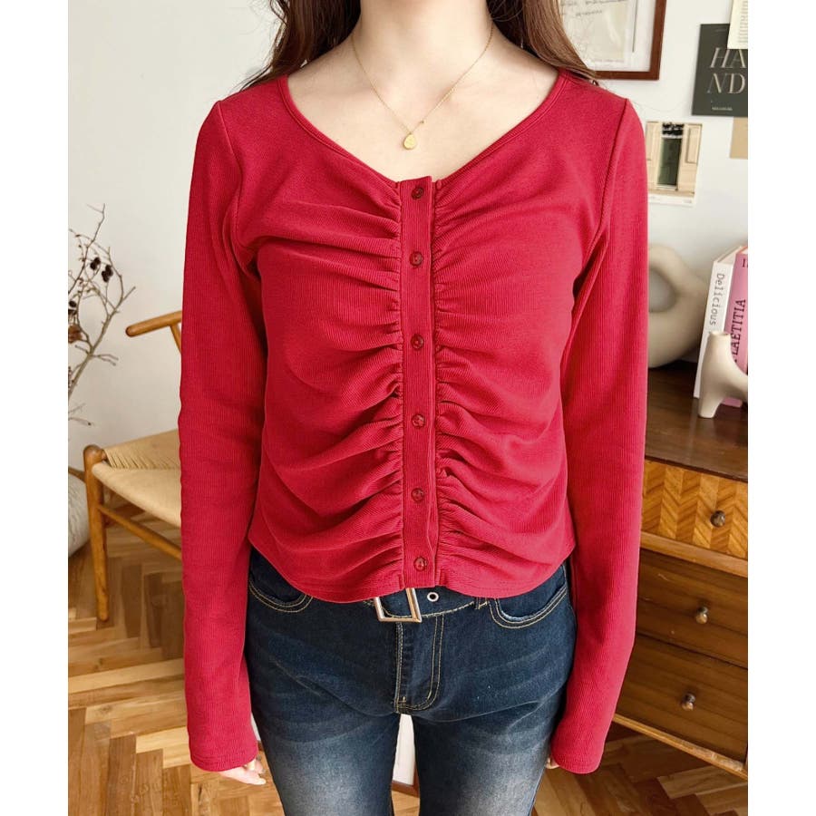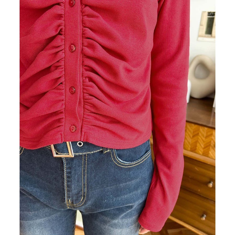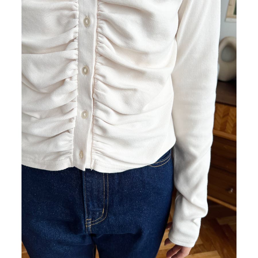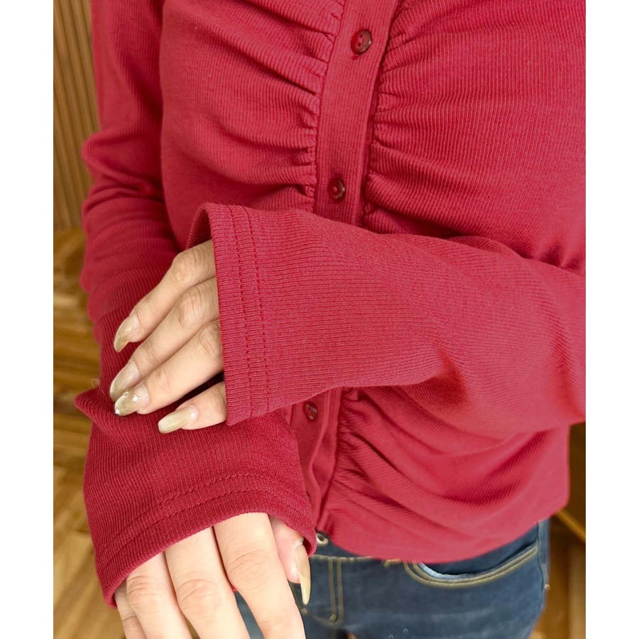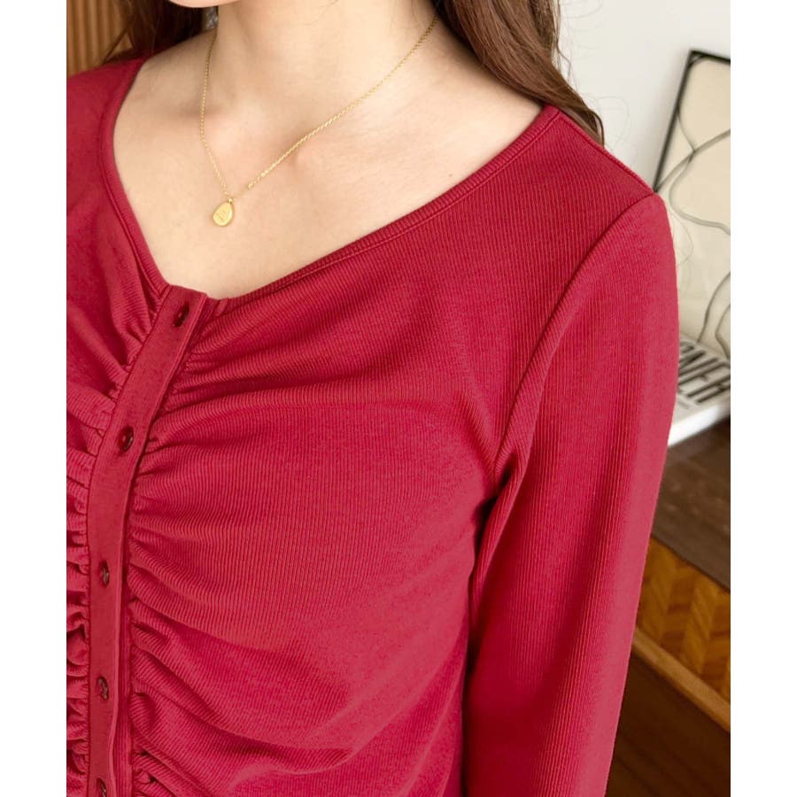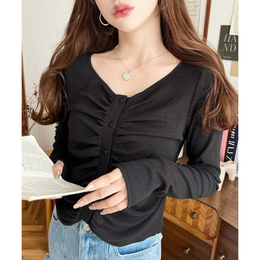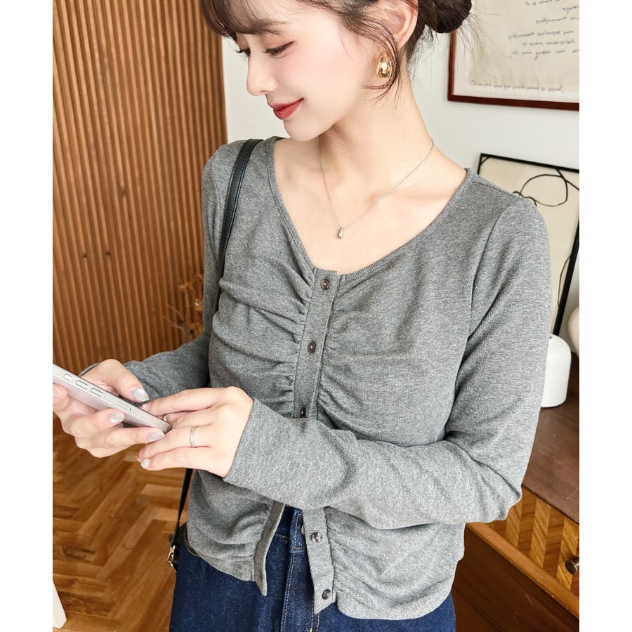 ・フロント部分に寄せられたギャザーデザインが印象的なでフェミニンなショート丈カーディガンです♪