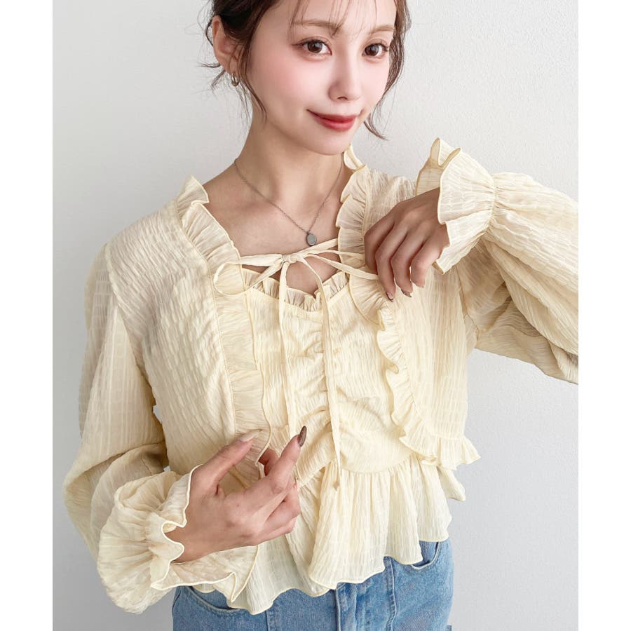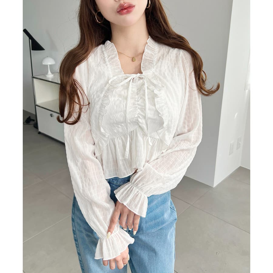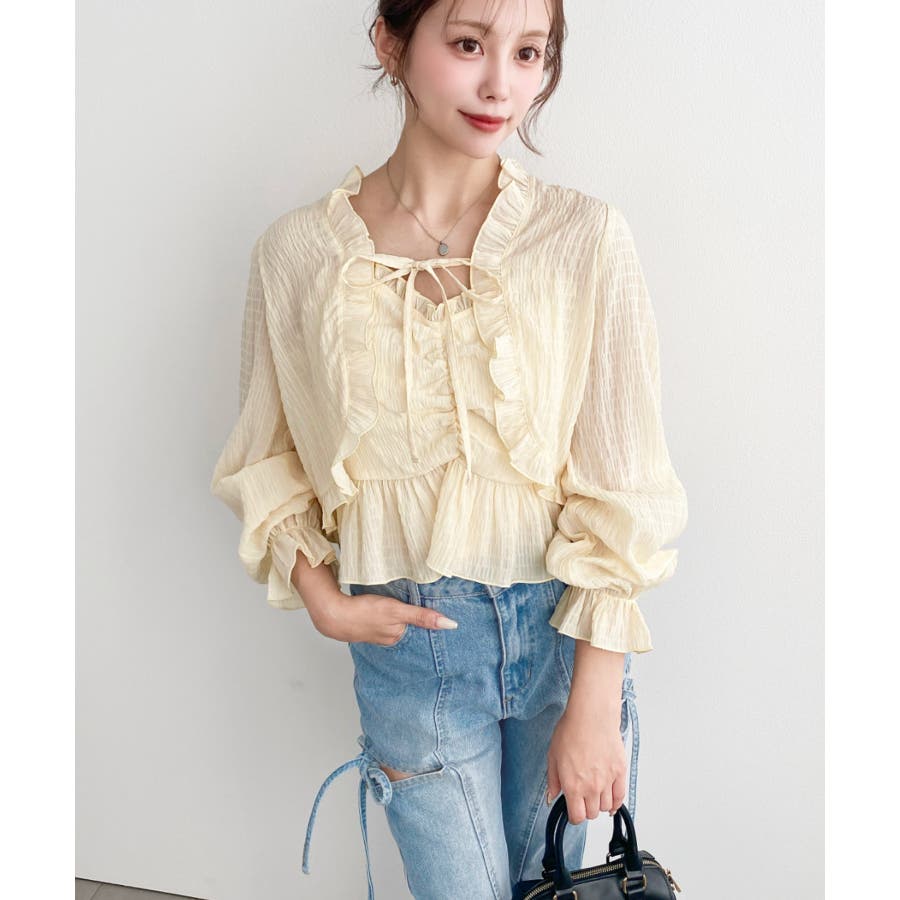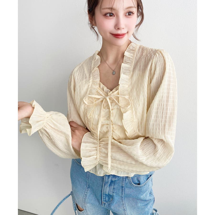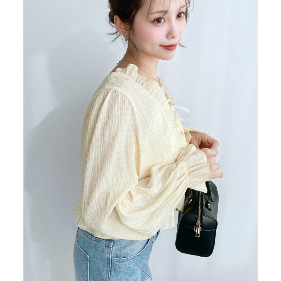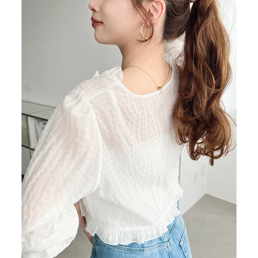 ・フレアスカート合わせて、シアー素材とフリルリボンの甘さが引き立つ、華やかで女性らしいスタイリングに♪