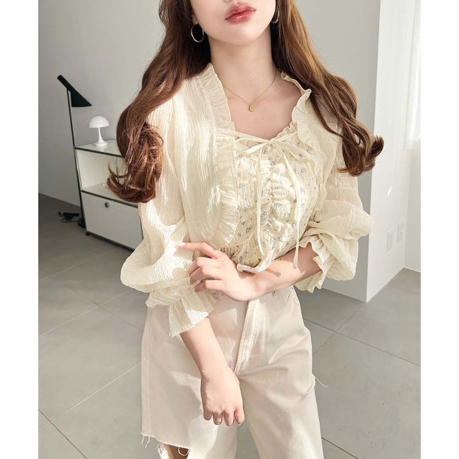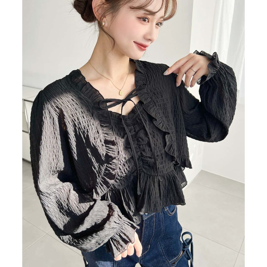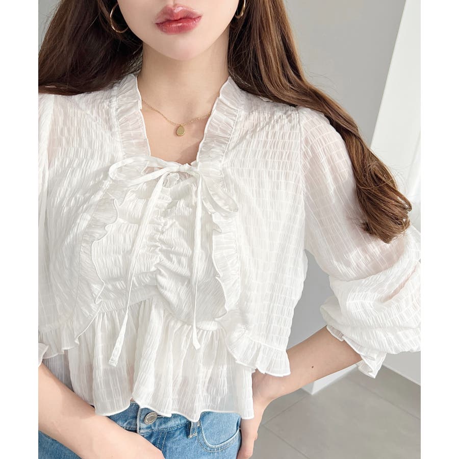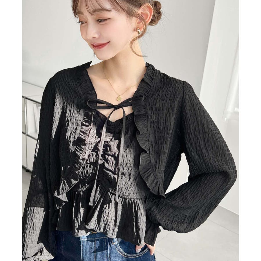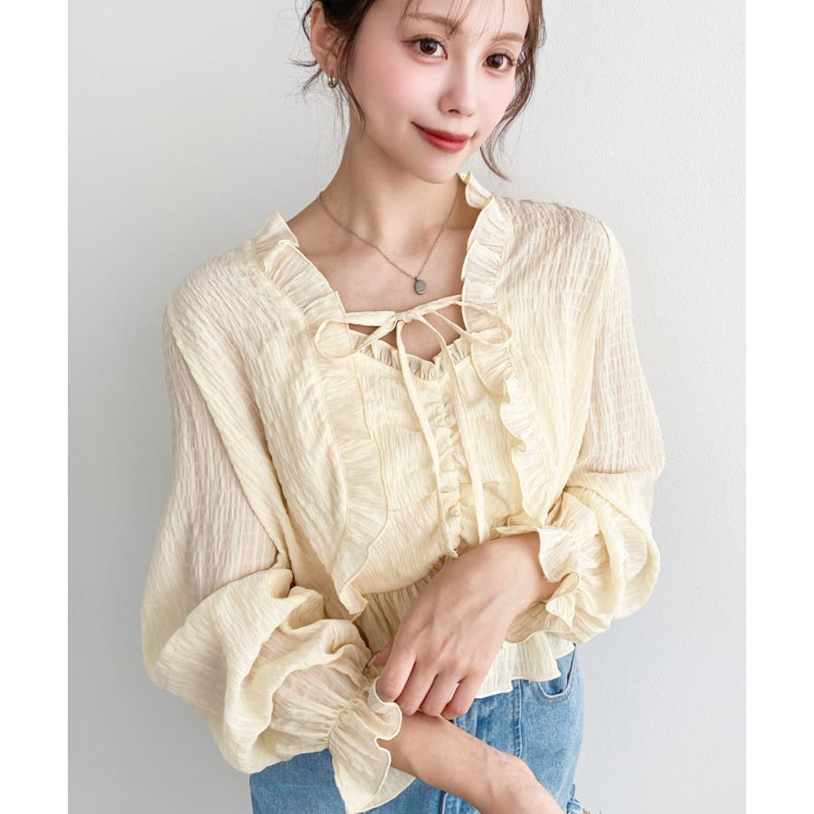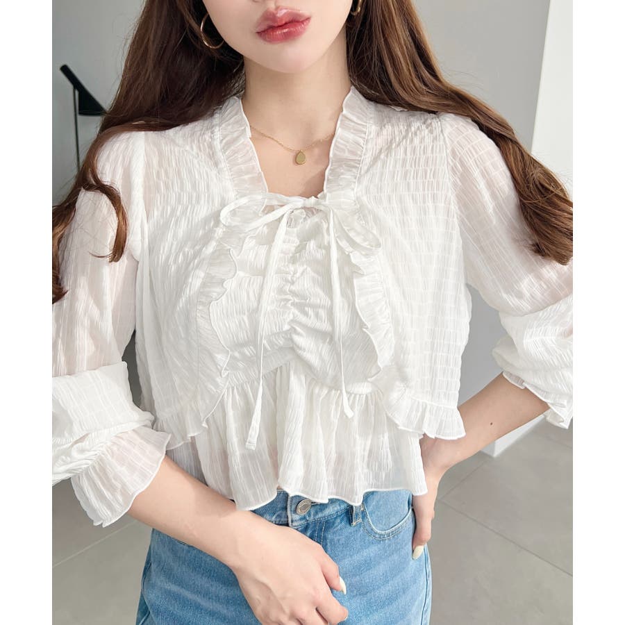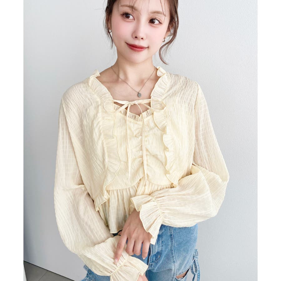 ・フレアスカート合わせて、シアー素材とフリルリボンの甘さが引き立つ、華やかで女性らしいスタイリングに♪