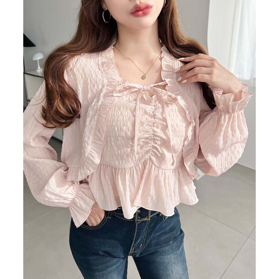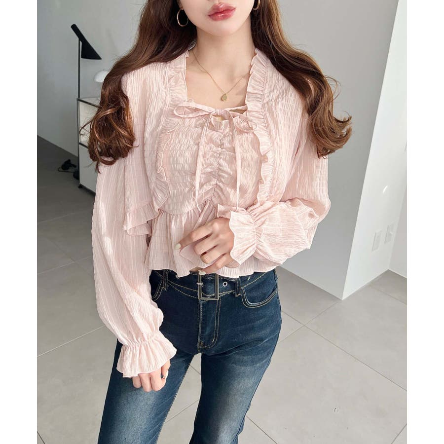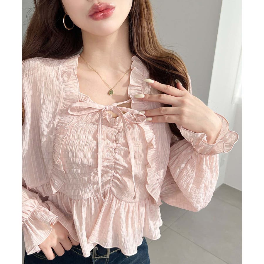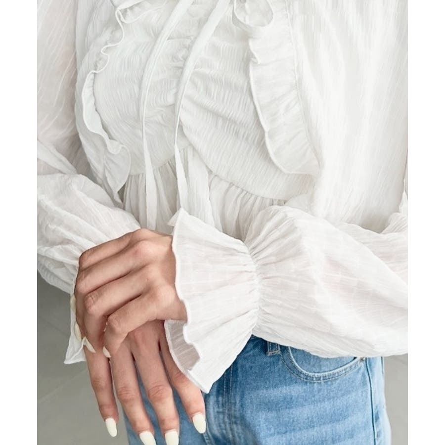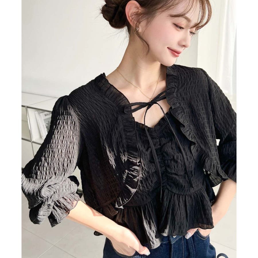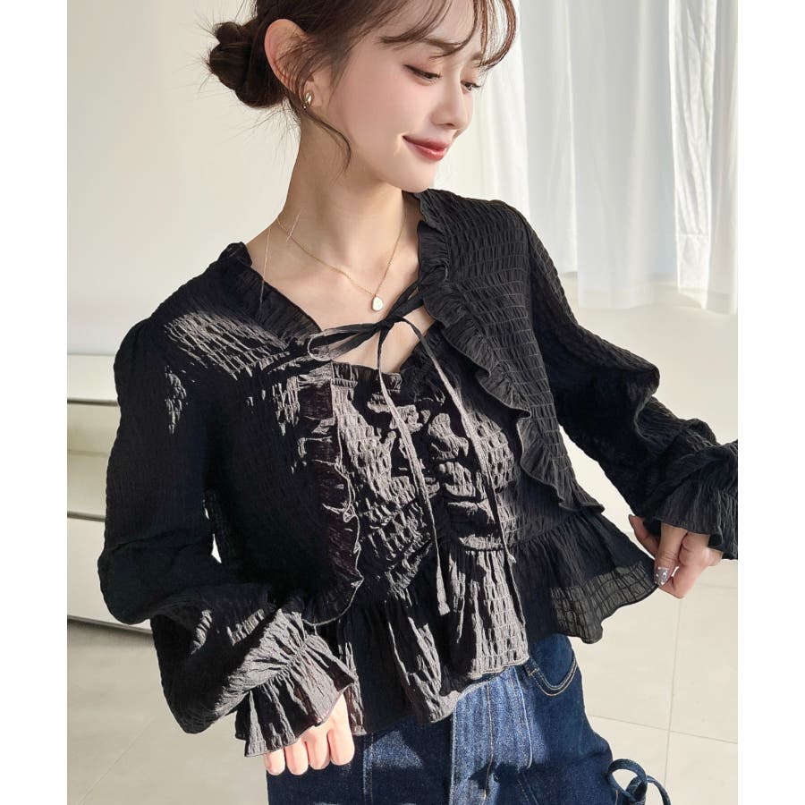 ・フレアスカート合わせて、シアー素材とフリルリボンの甘さが引き立つ、華やかで女性らしいスタイリングに♪