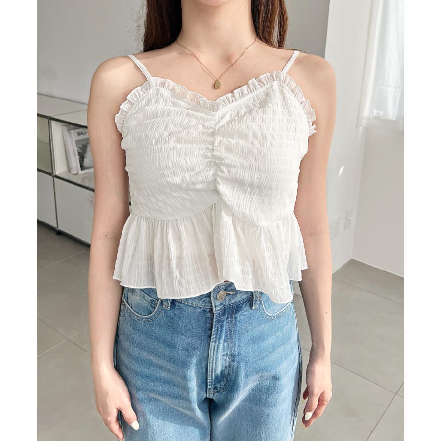 ・キャミソールはシャーリングによる立体感のある表情と程よいフィット感が特徴で、ボディラインをきれいに見せながらも窮屈感なく着用できるデザイン◎