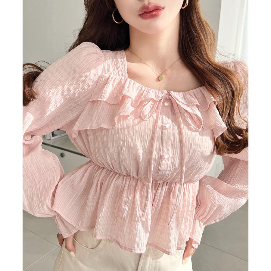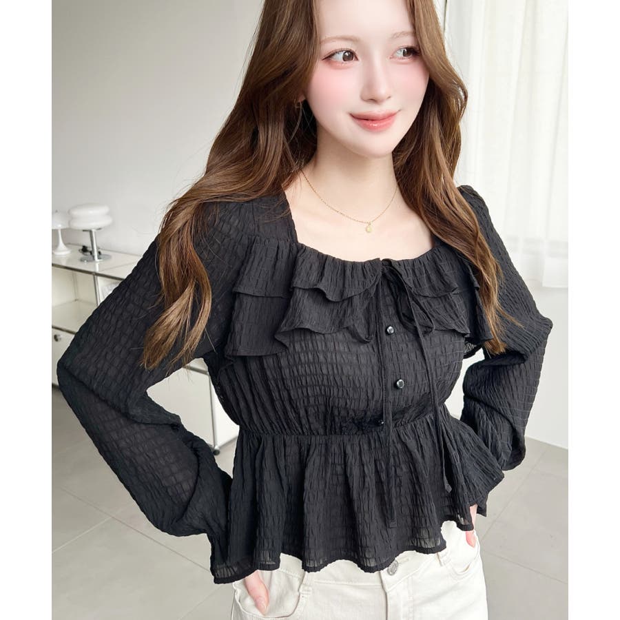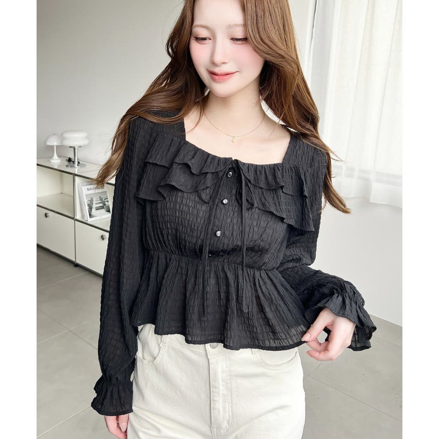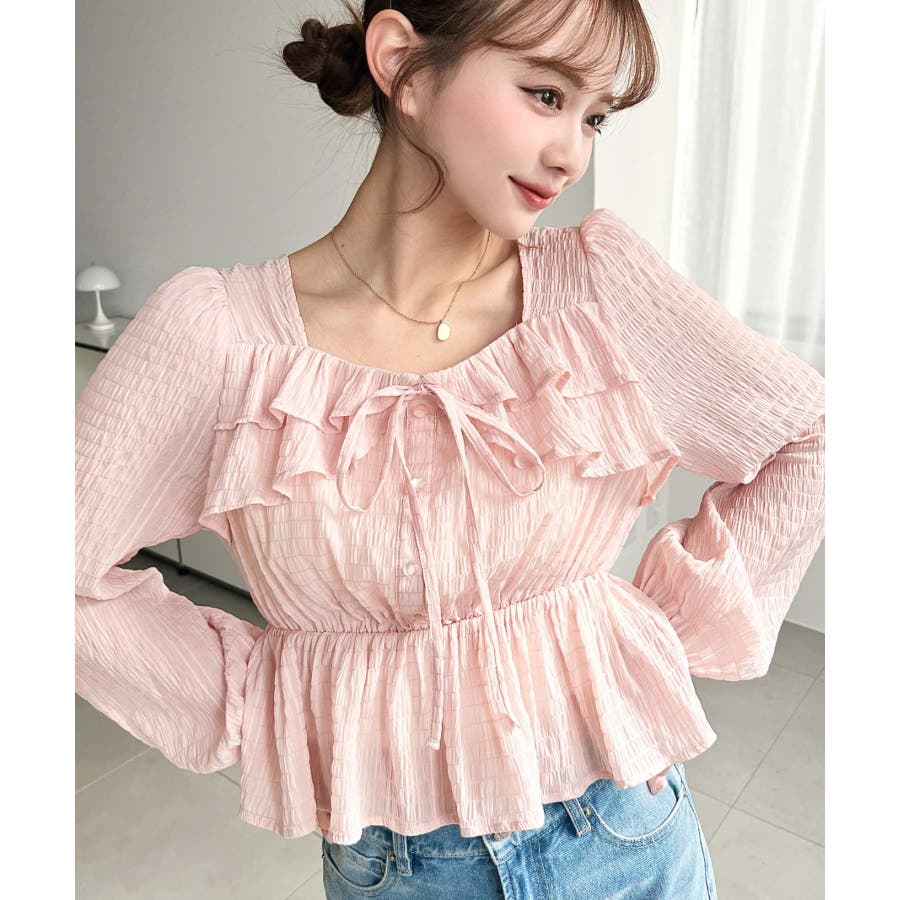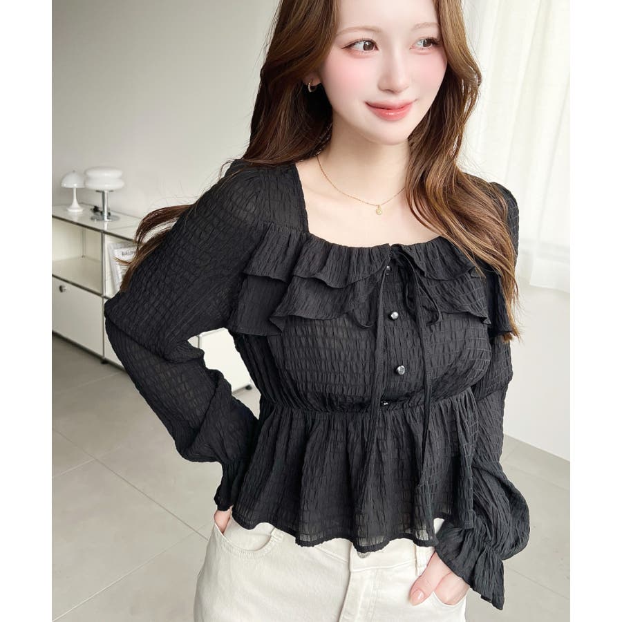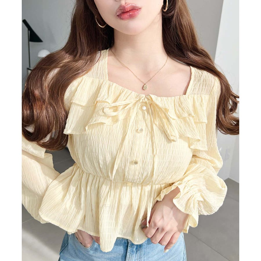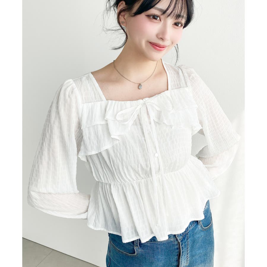 スクエアネック長袖ダブルフリルペプラムブラウス シアースモッキングライク