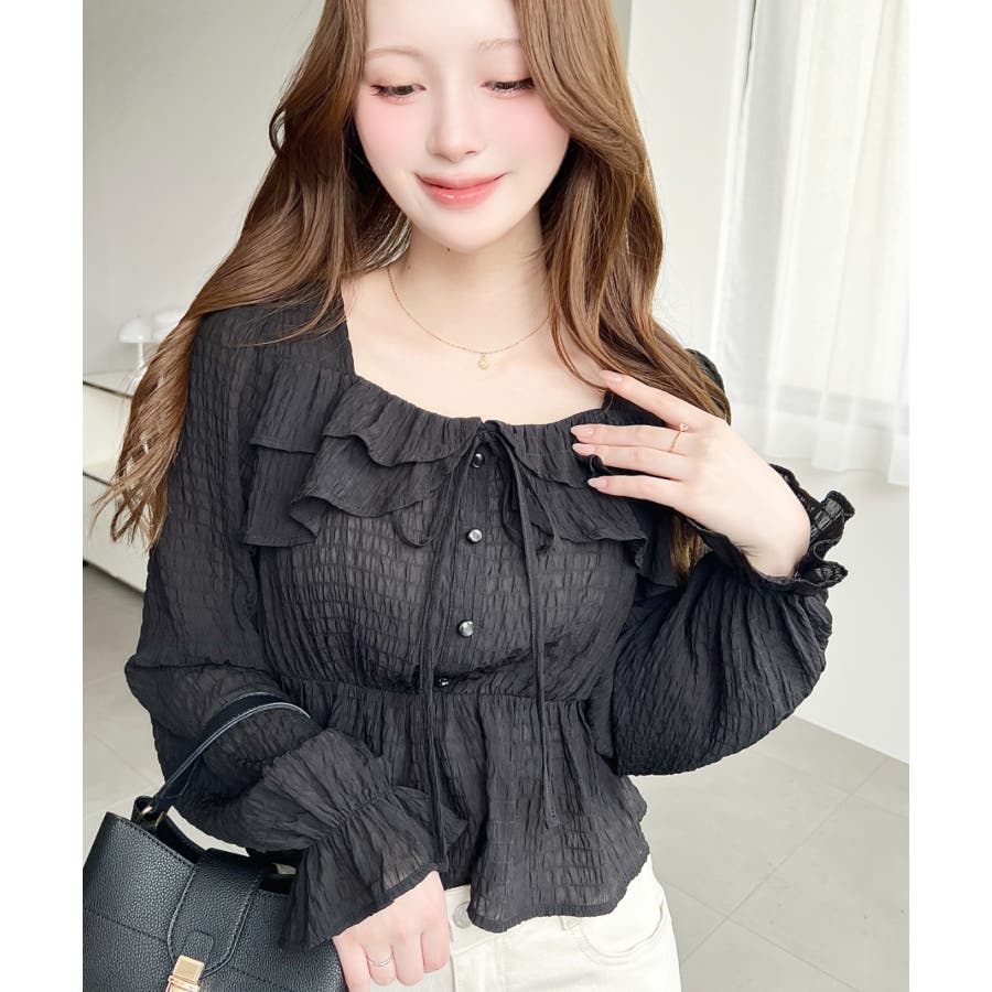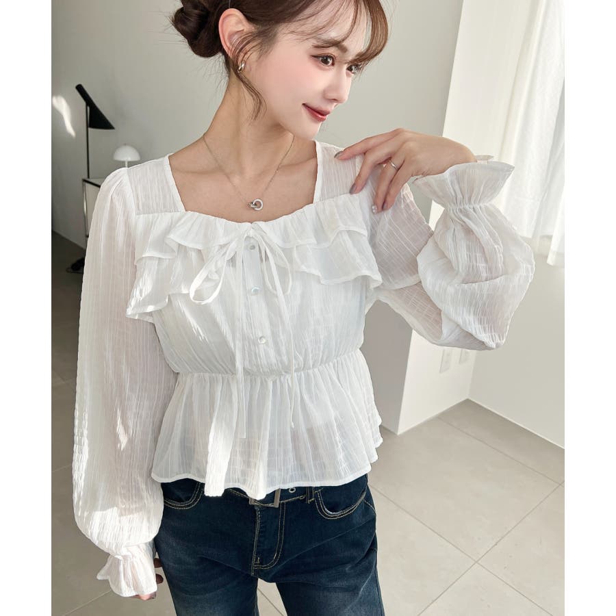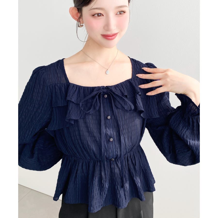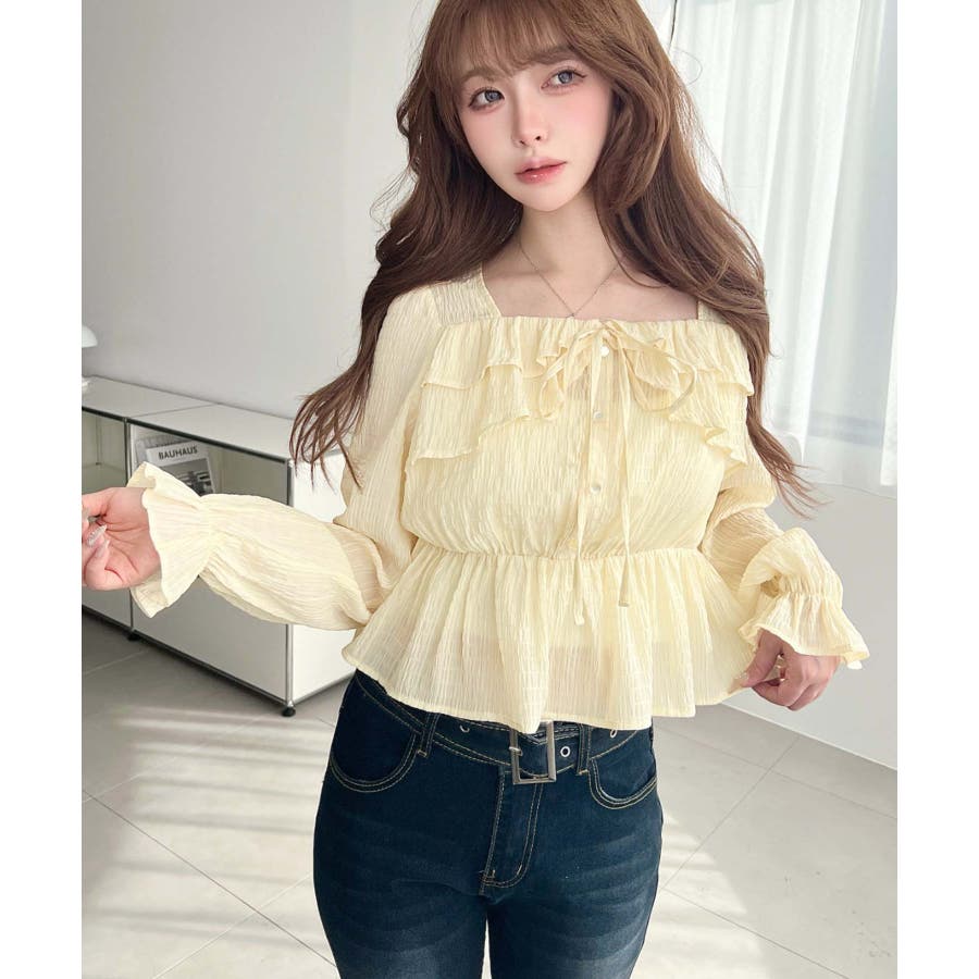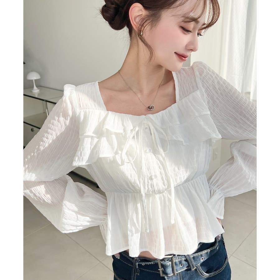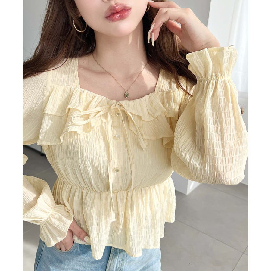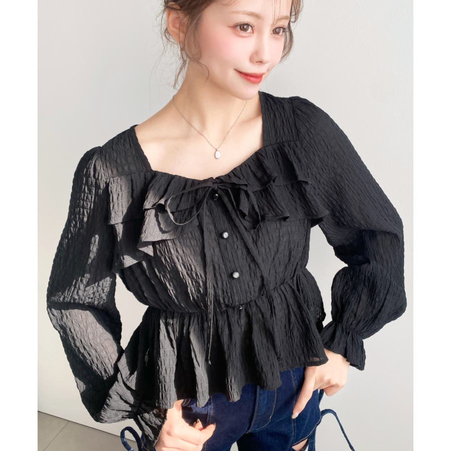 スクエアネック長袖ダブルフリルペプラムブラウス シアースモッキングライク