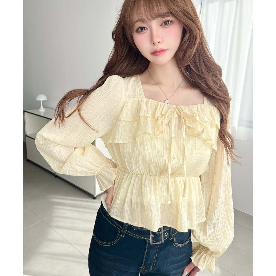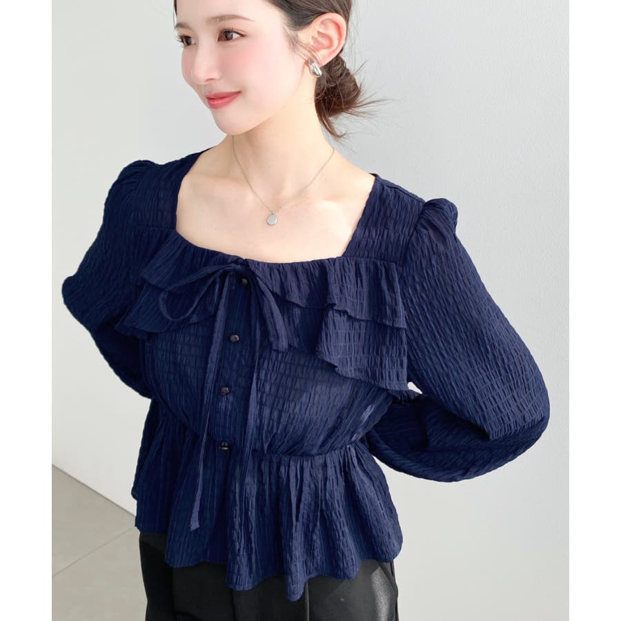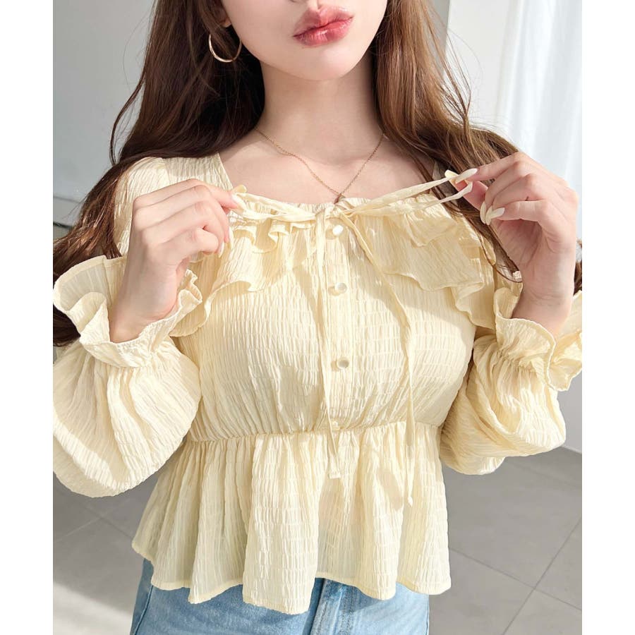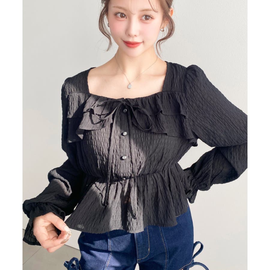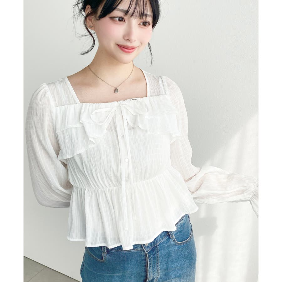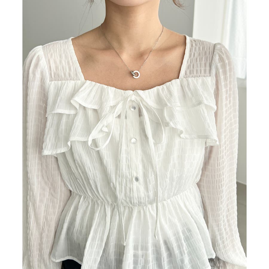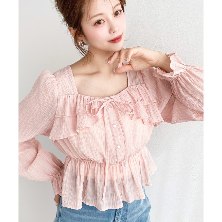 スクエアネック長袖ダブルフリルペプラムブラウス シアースモッキングライク