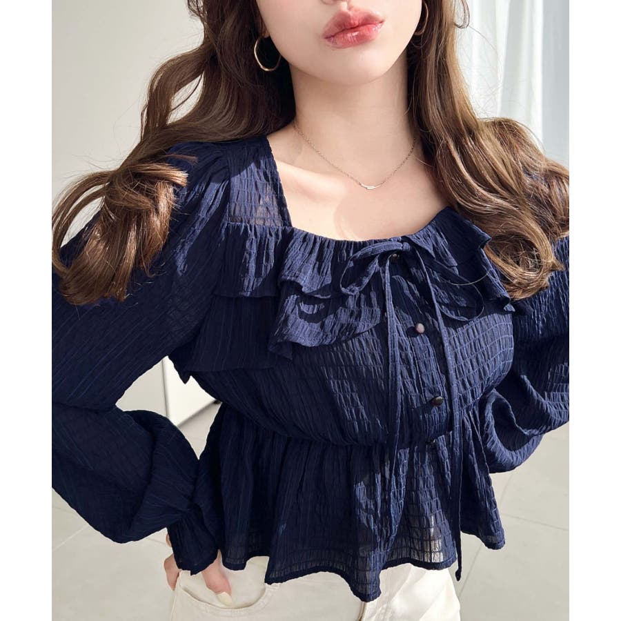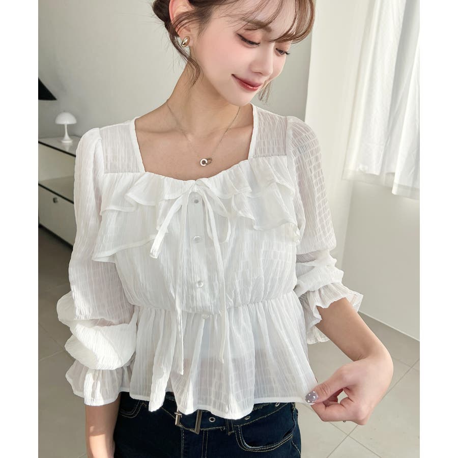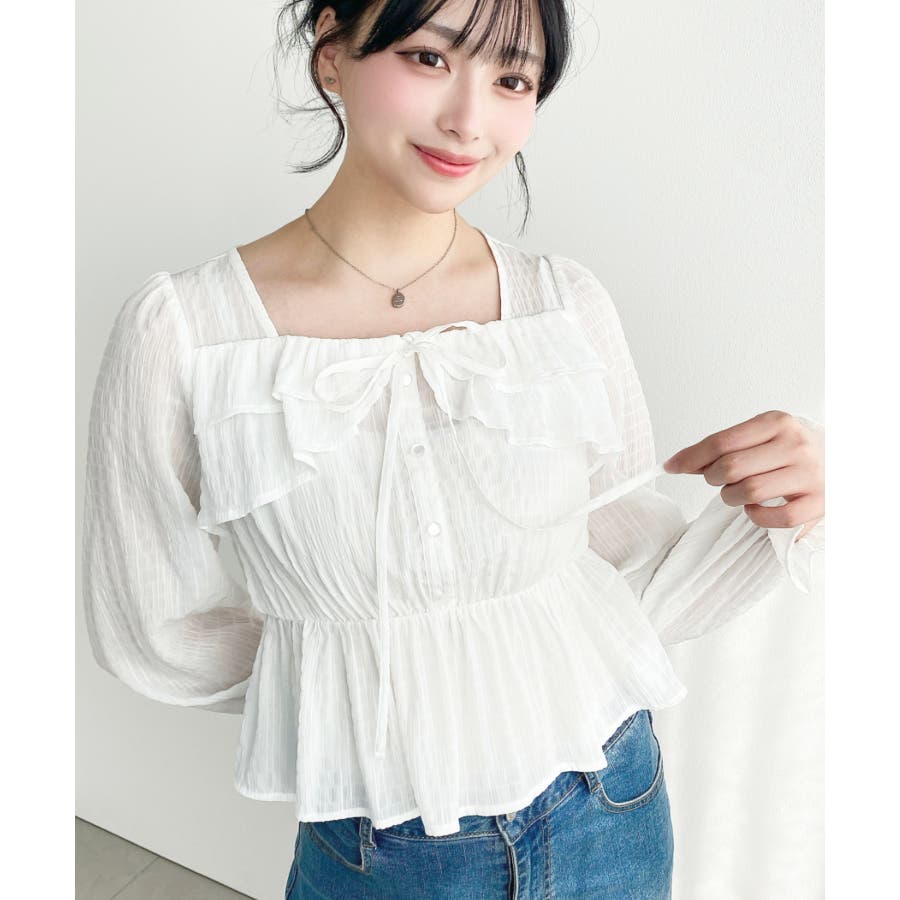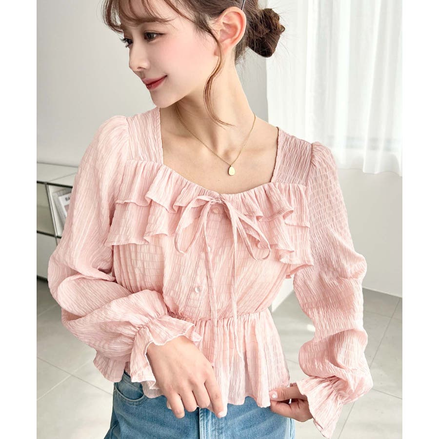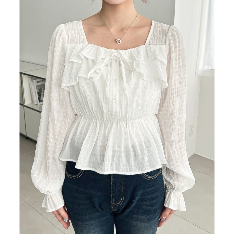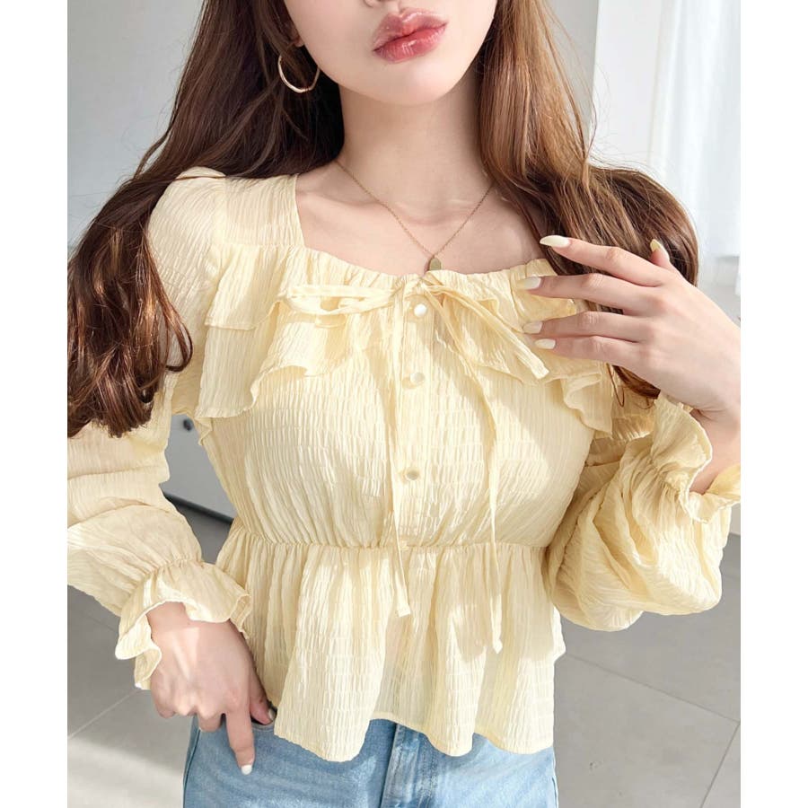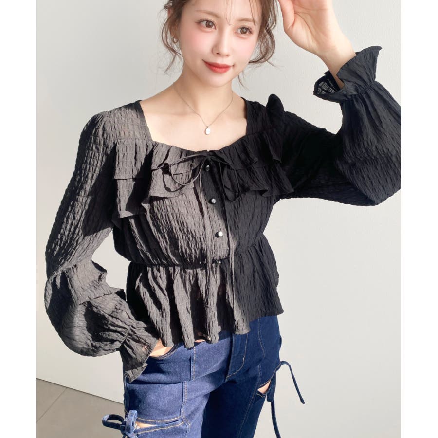 スクエアネック長袖ダブルフリルペプラムブラウス シアースモッキングライク