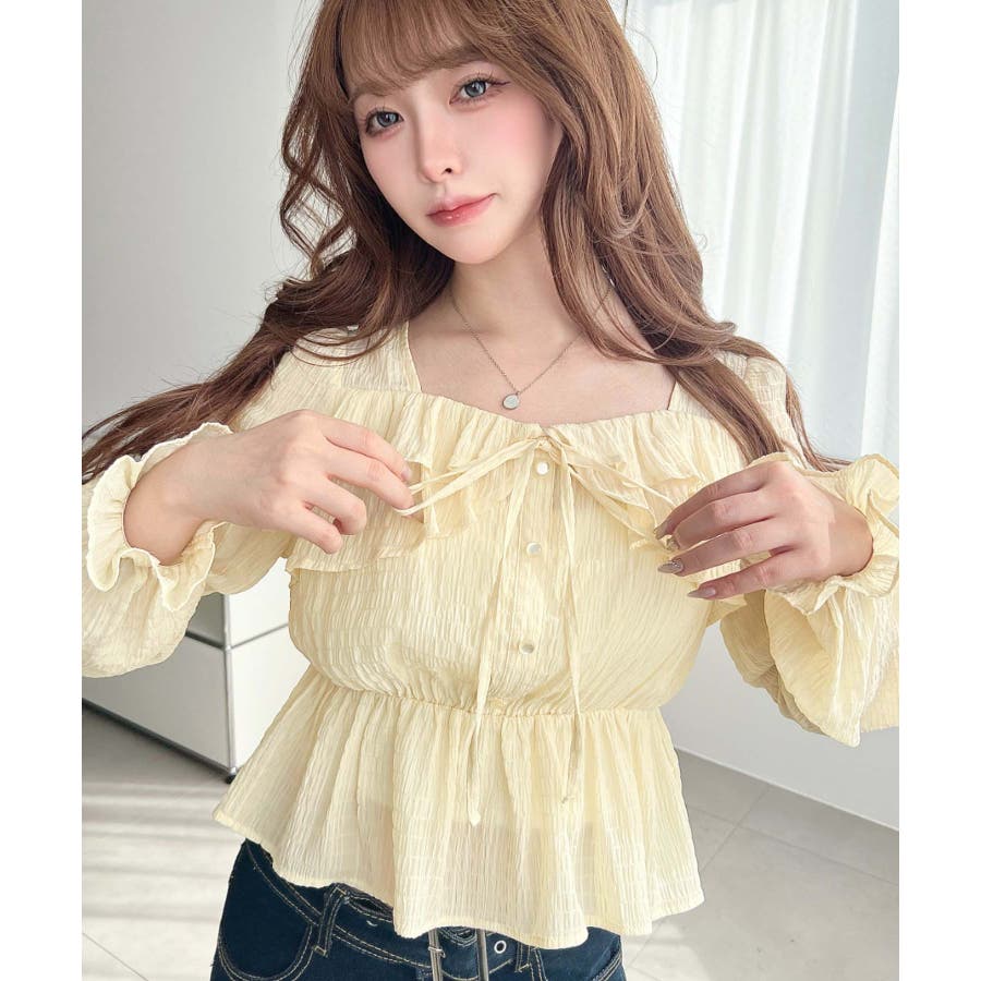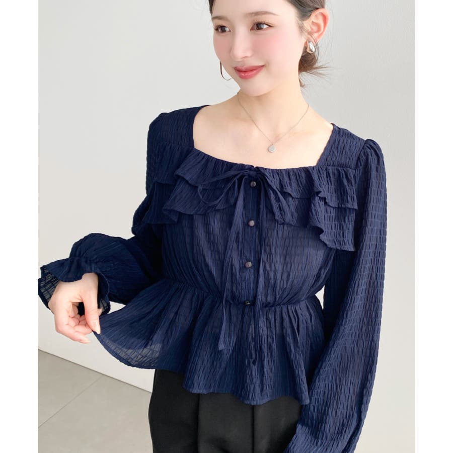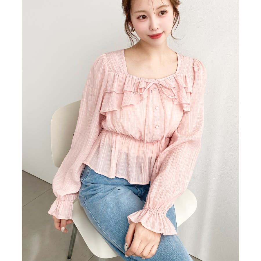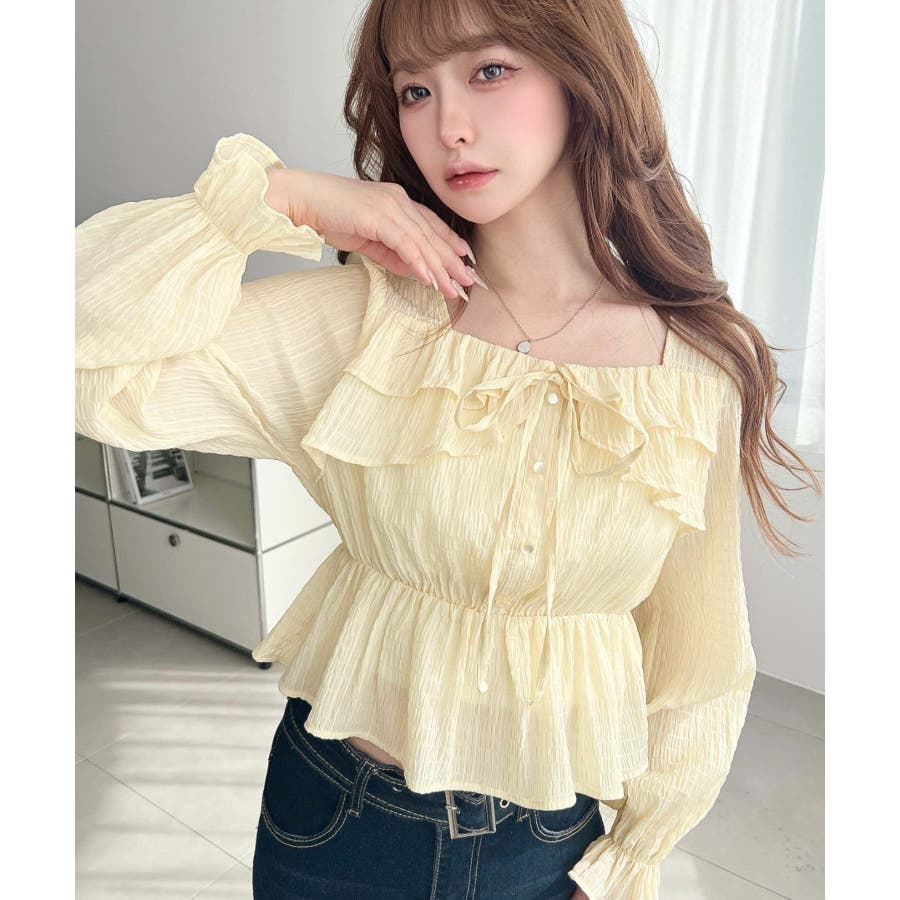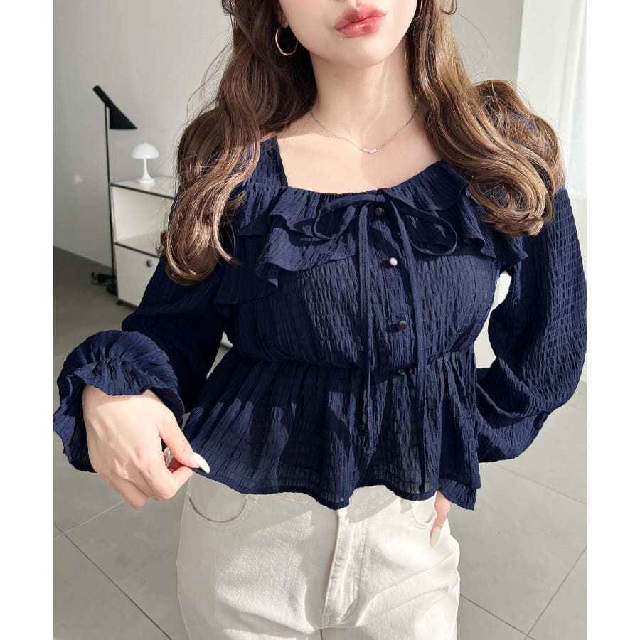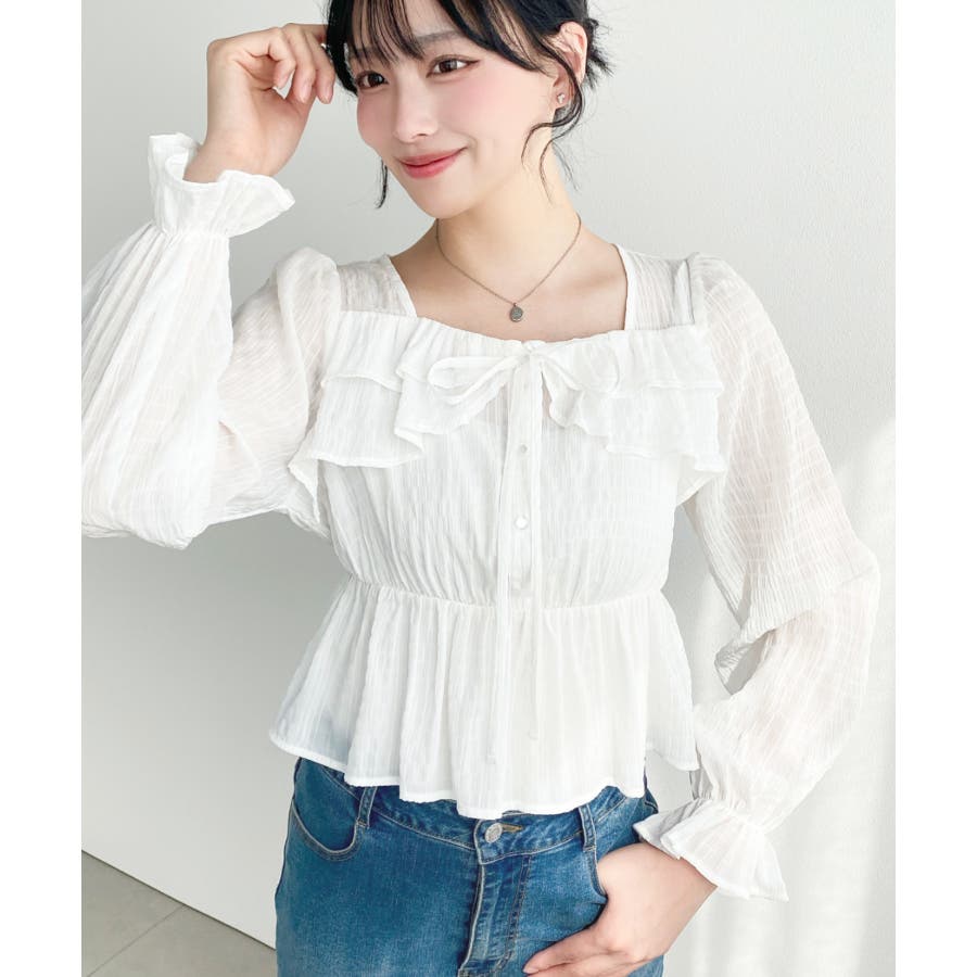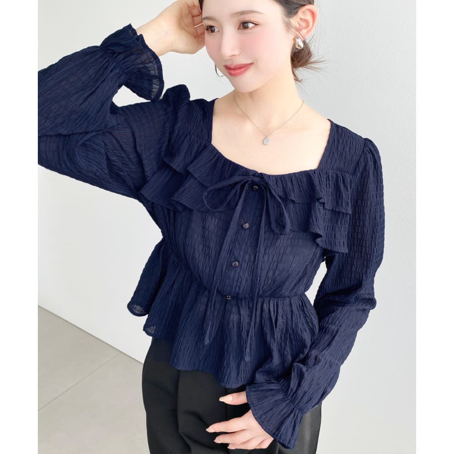 スクエアネック長袖ダブルフリルペプラムブラウス シアースモッキングライク