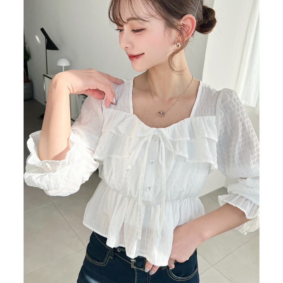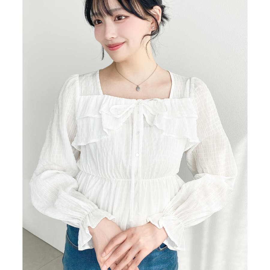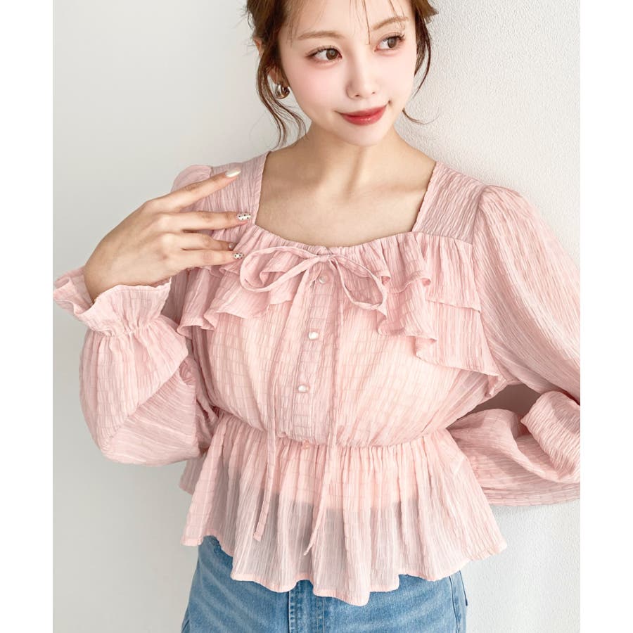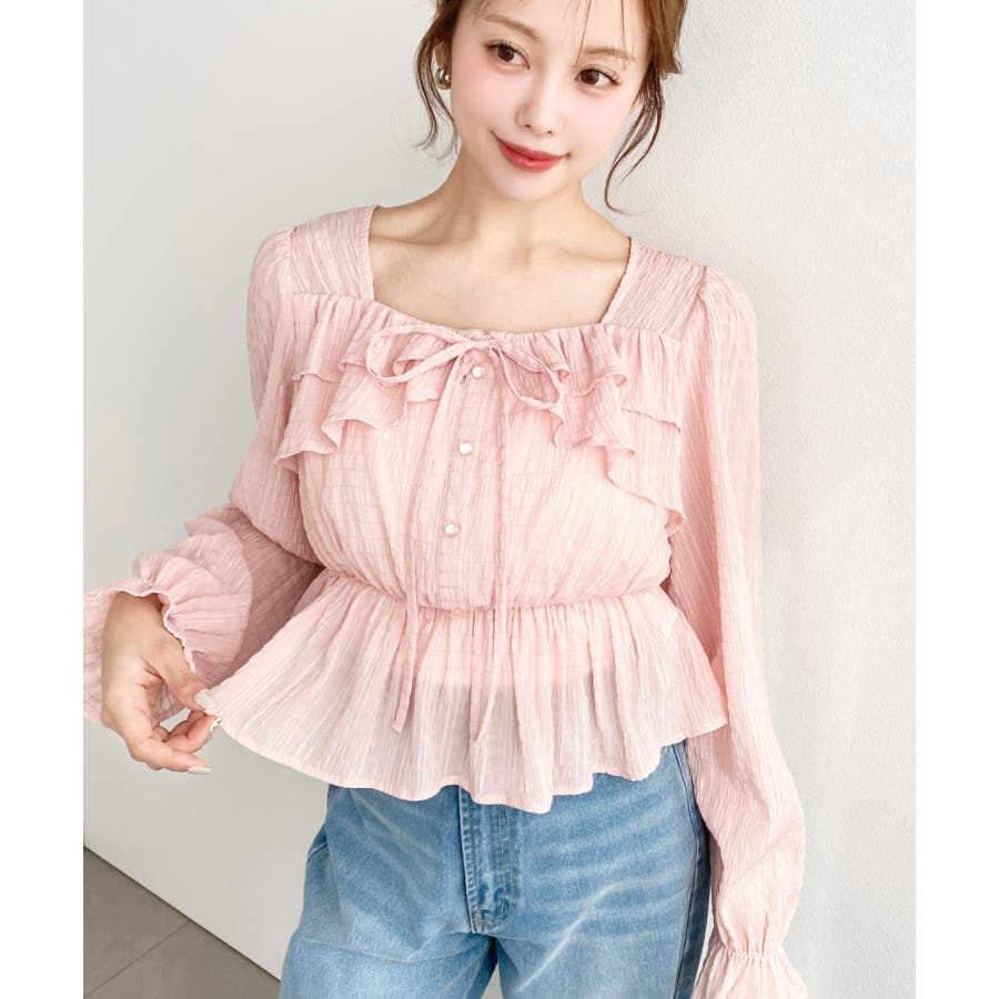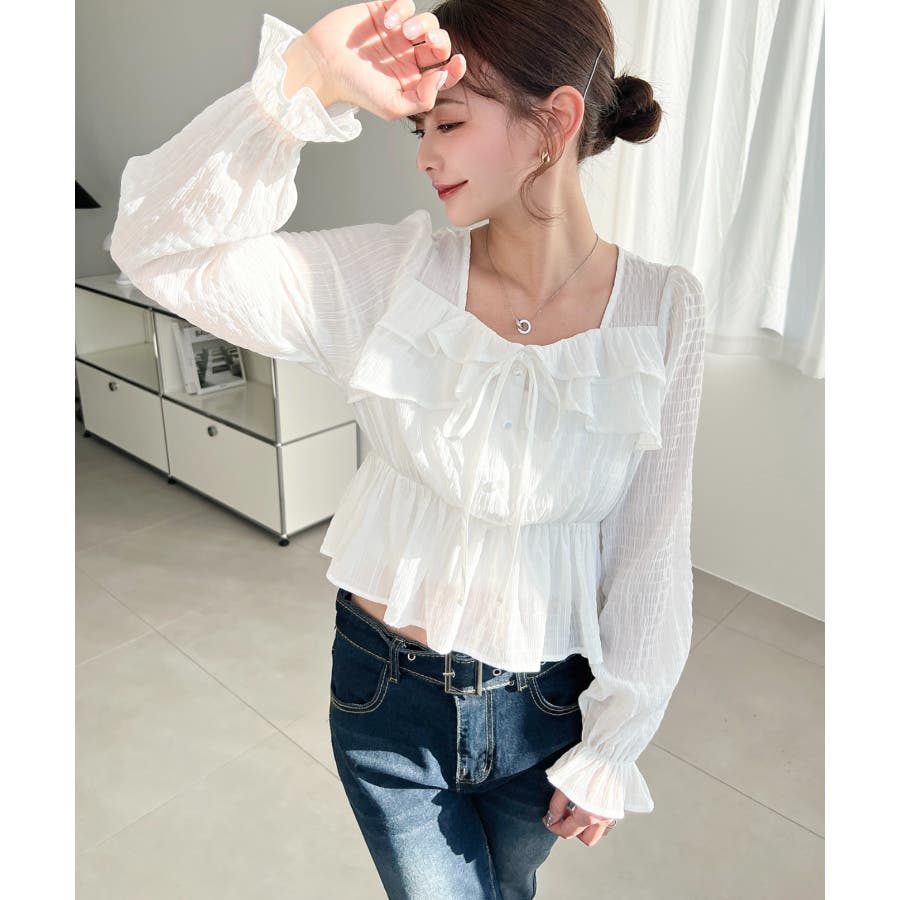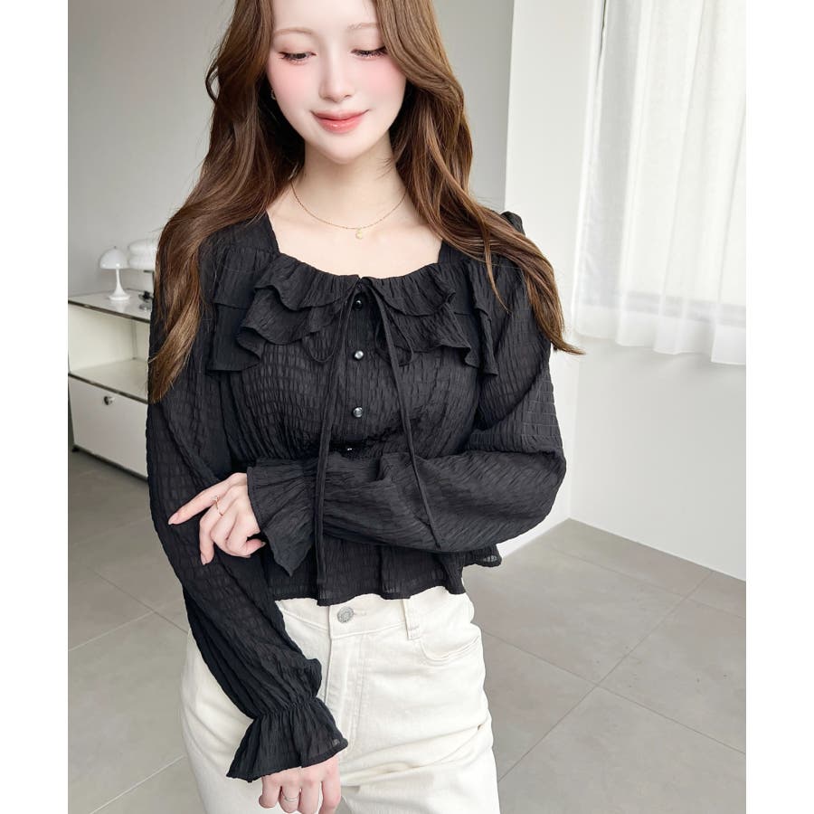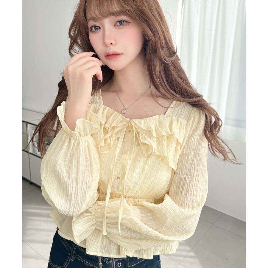 スクエアネック長袖ダブルフリルペプラムブラウス シアースモッキングライク