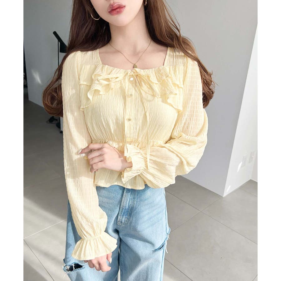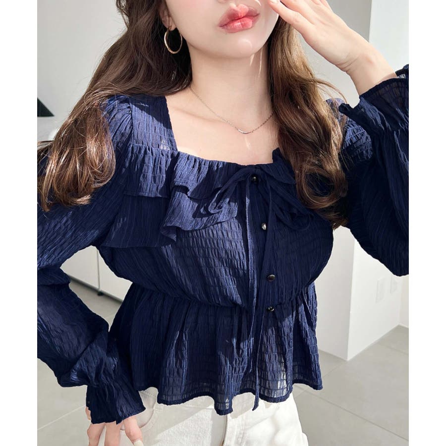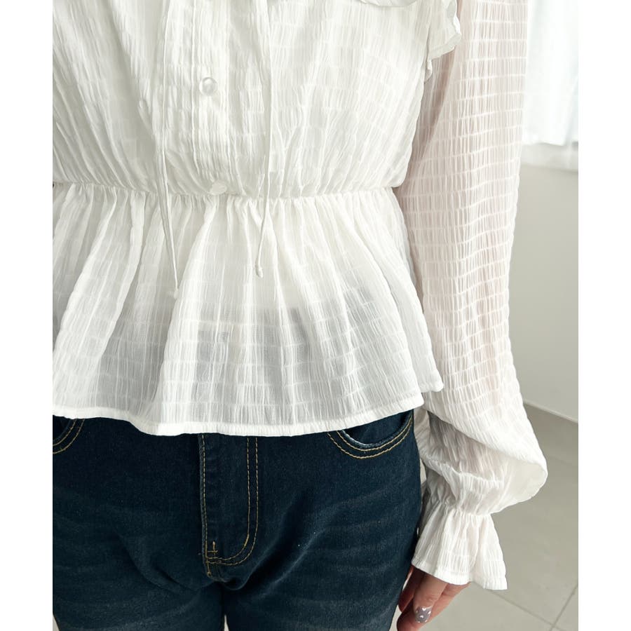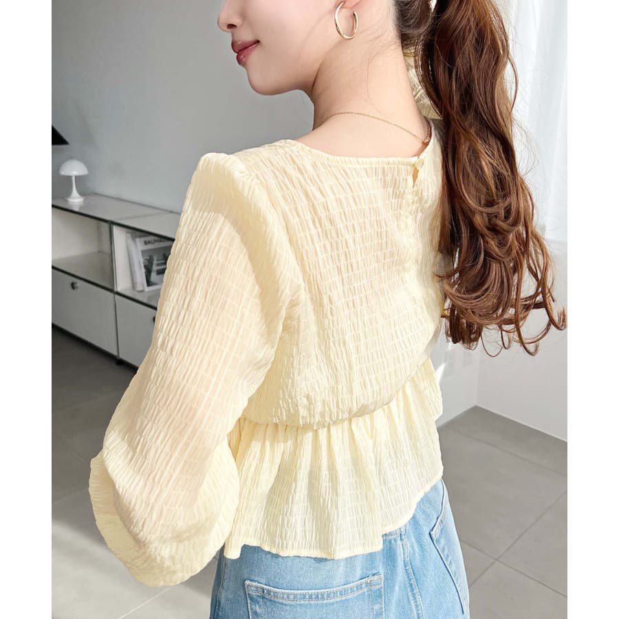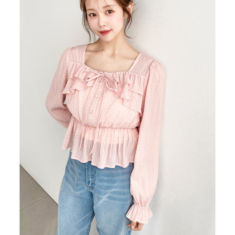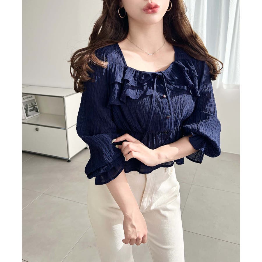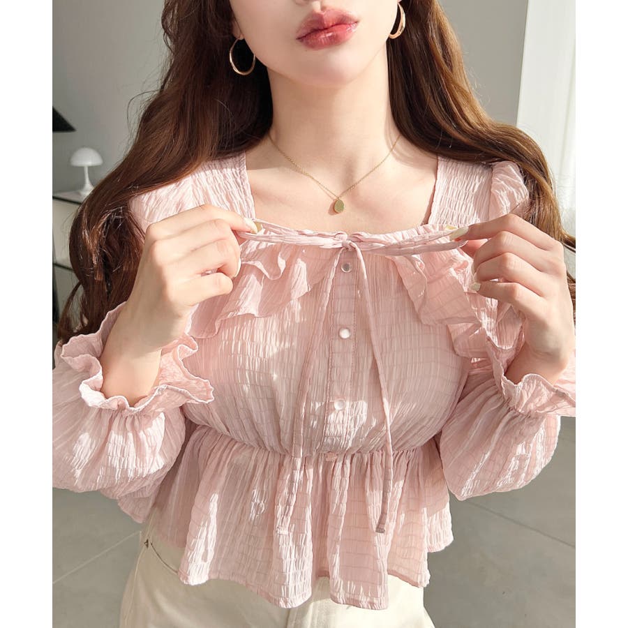 スクエアネック長袖ダブルフリルペプラムブラウス シアースモッキングライク