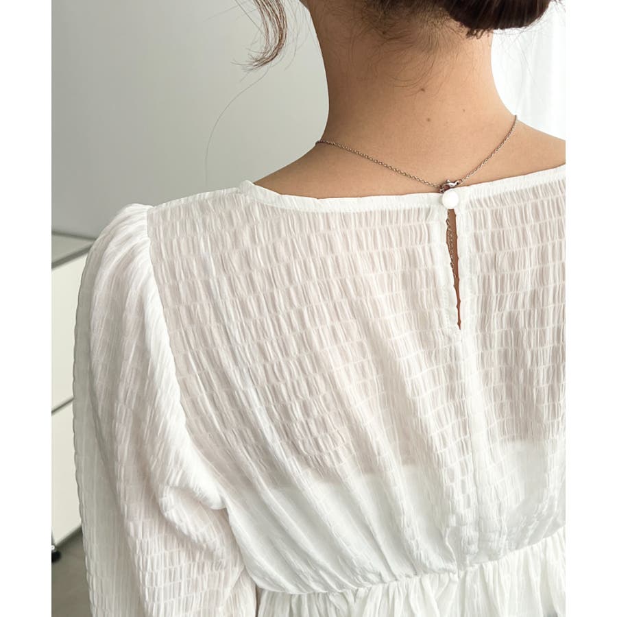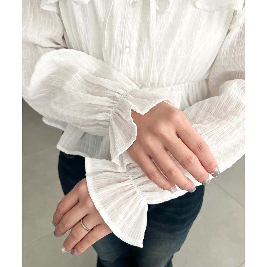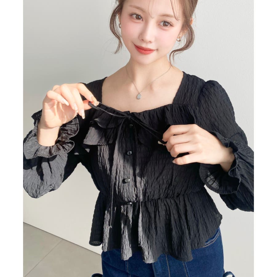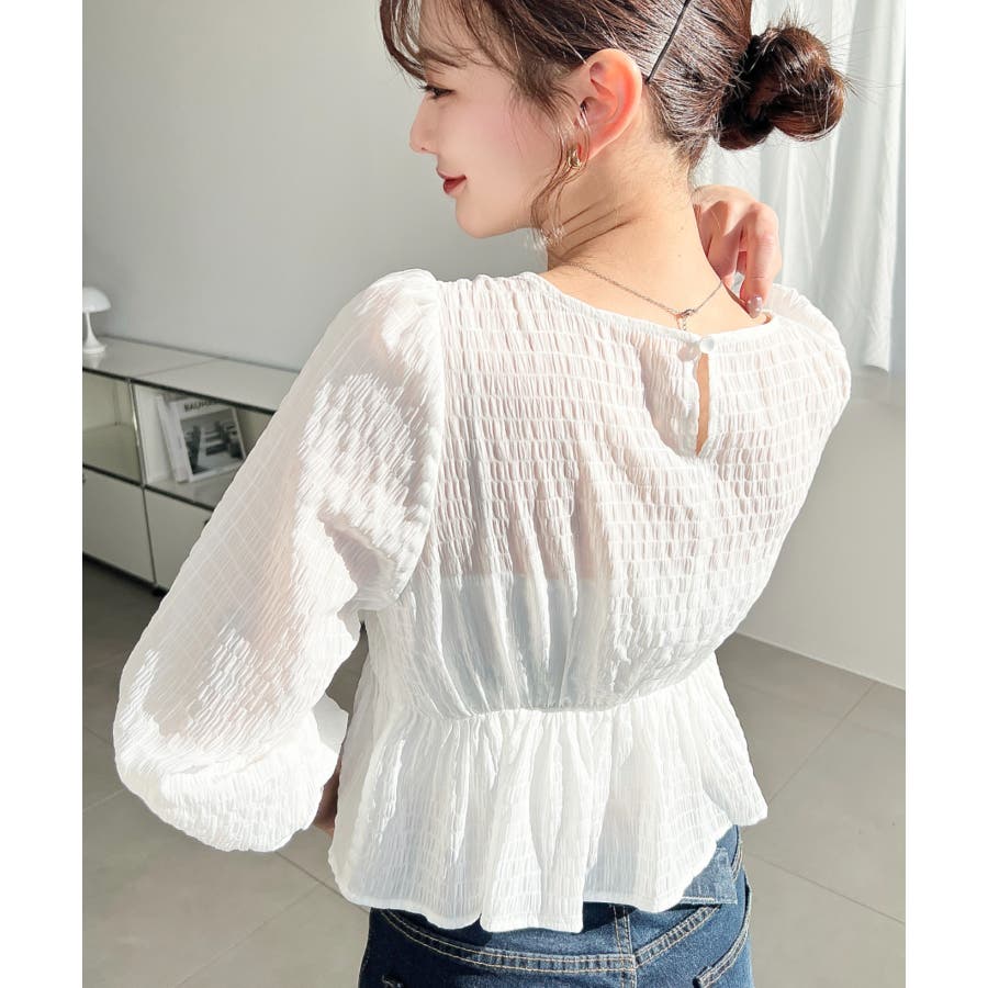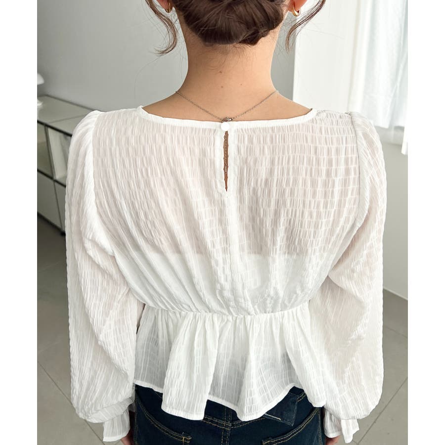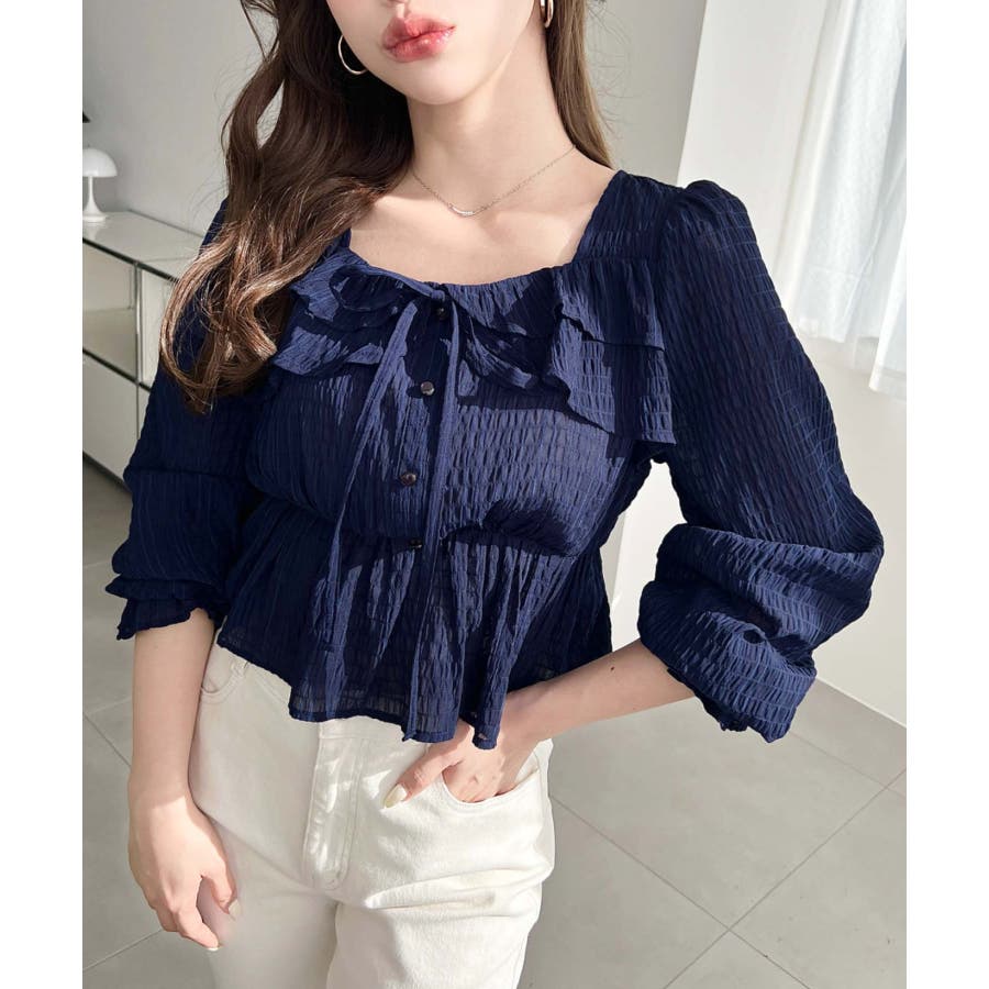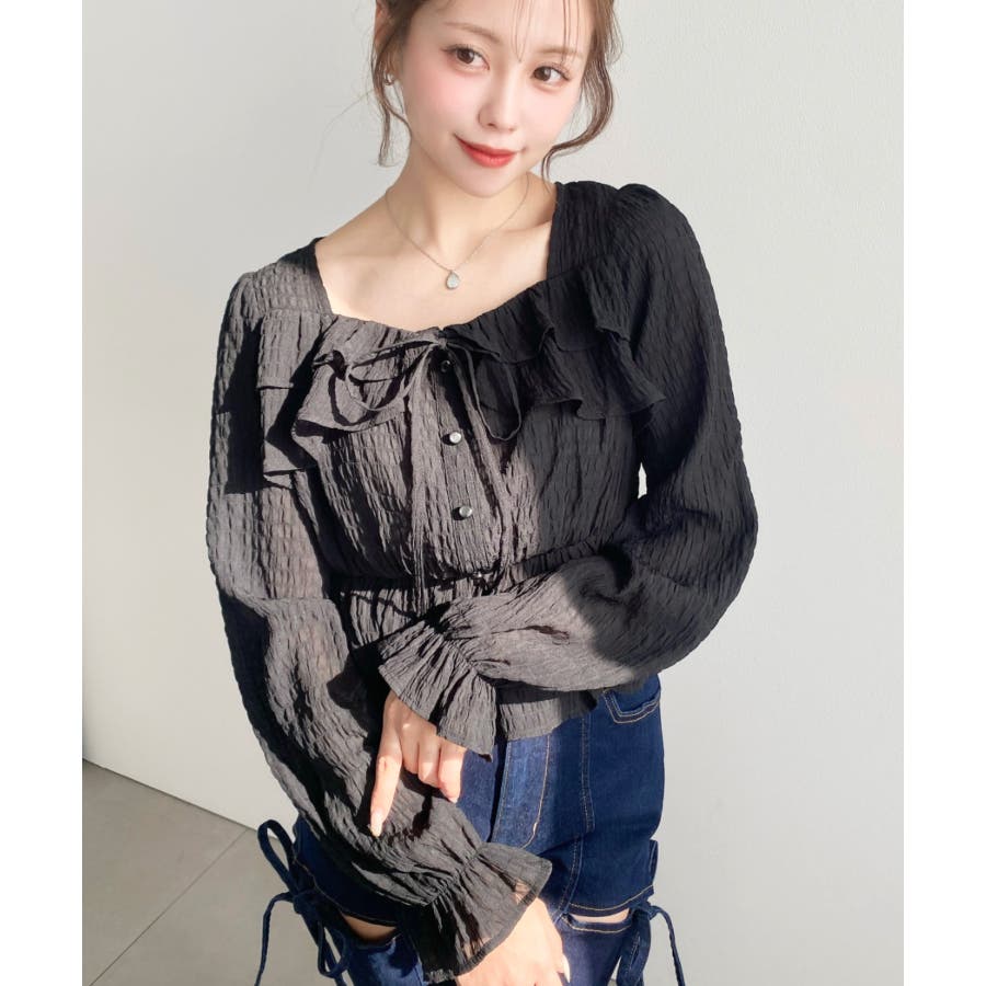 スクエアネック長袖ダブルフリルペプラムブラウス シアースモッキングライク