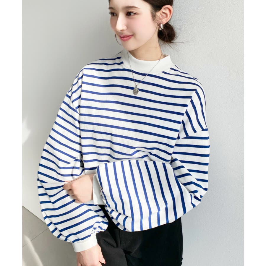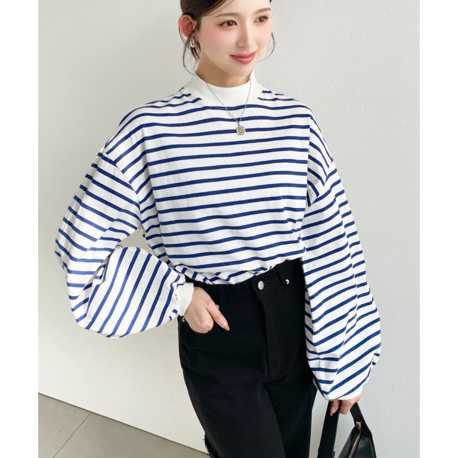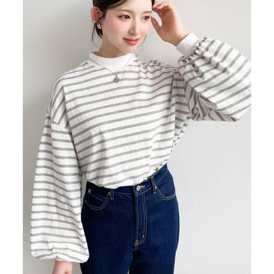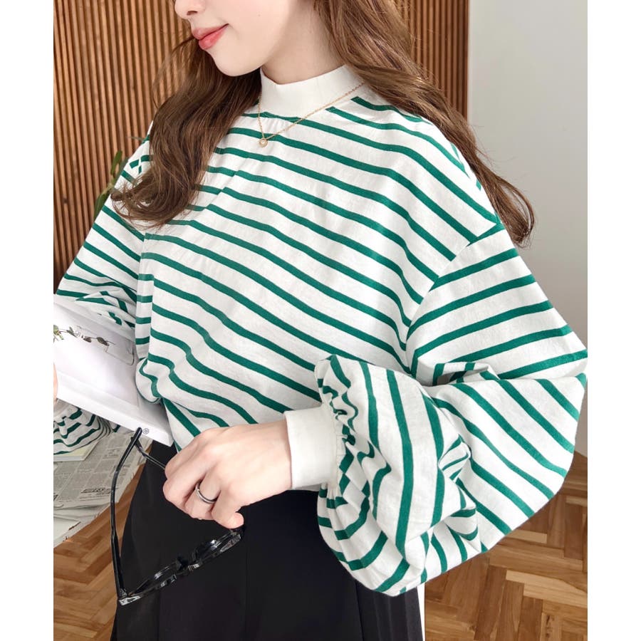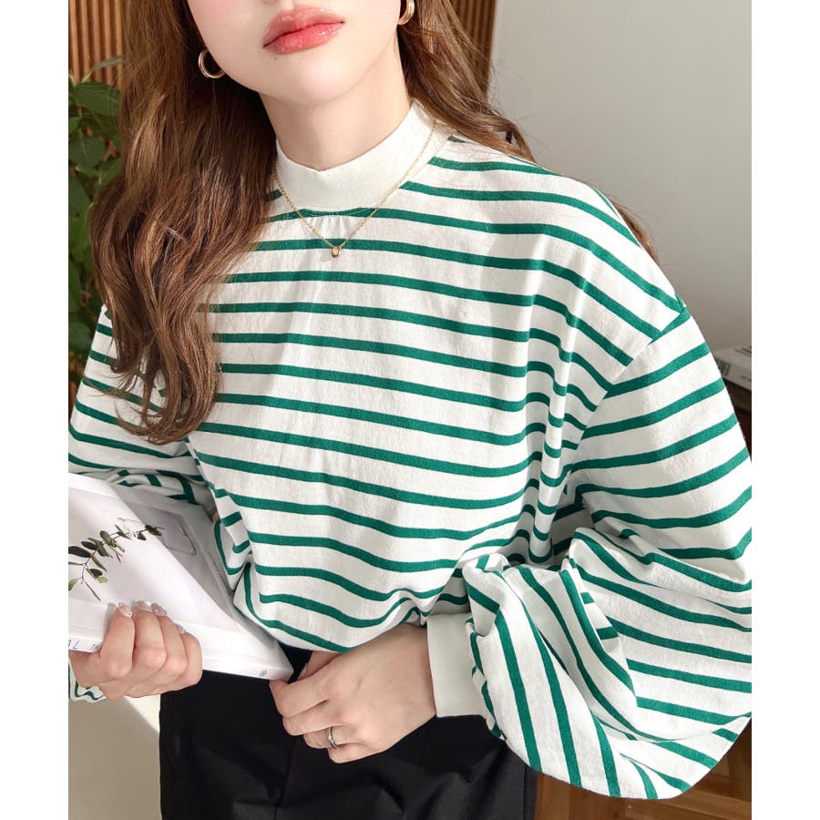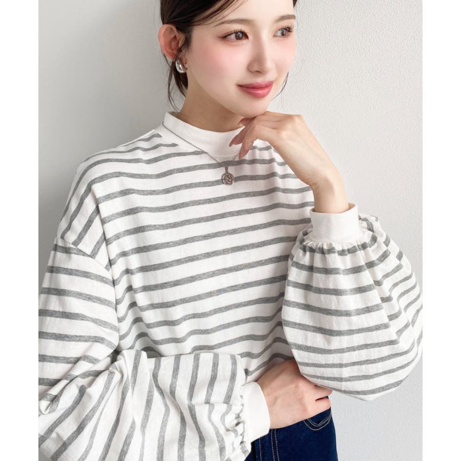 無地&ボーダー モックネックボリュームスリーブロンT 綿100%