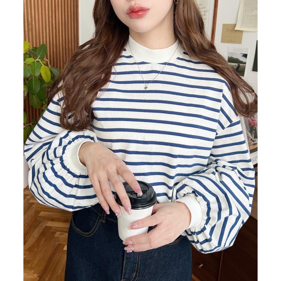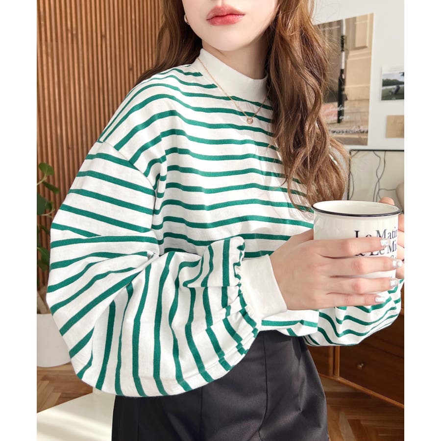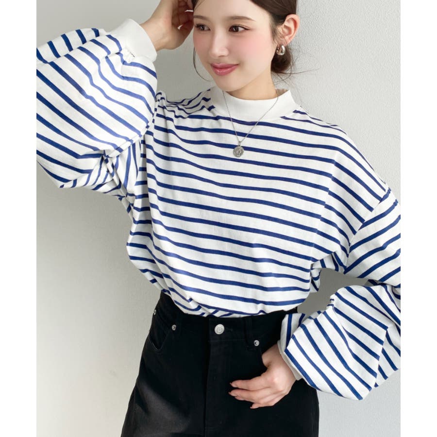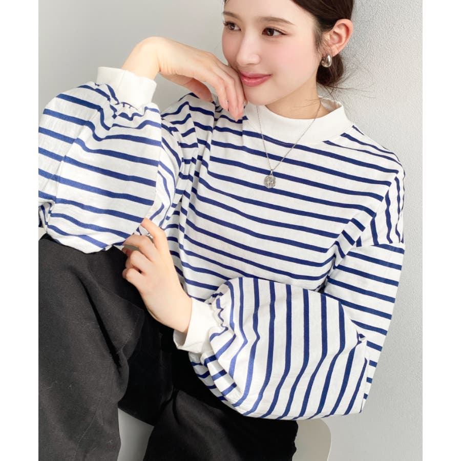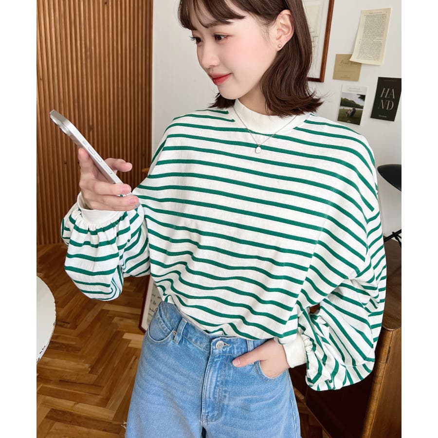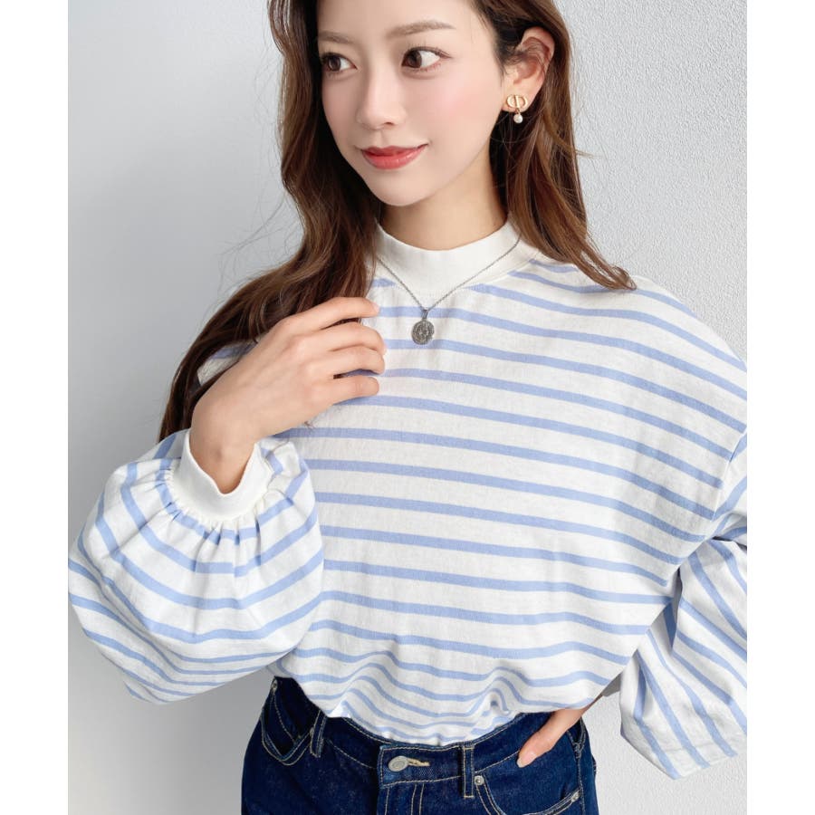 無地&ボーダー モックネックボリュームスリーブロンT 綿100%