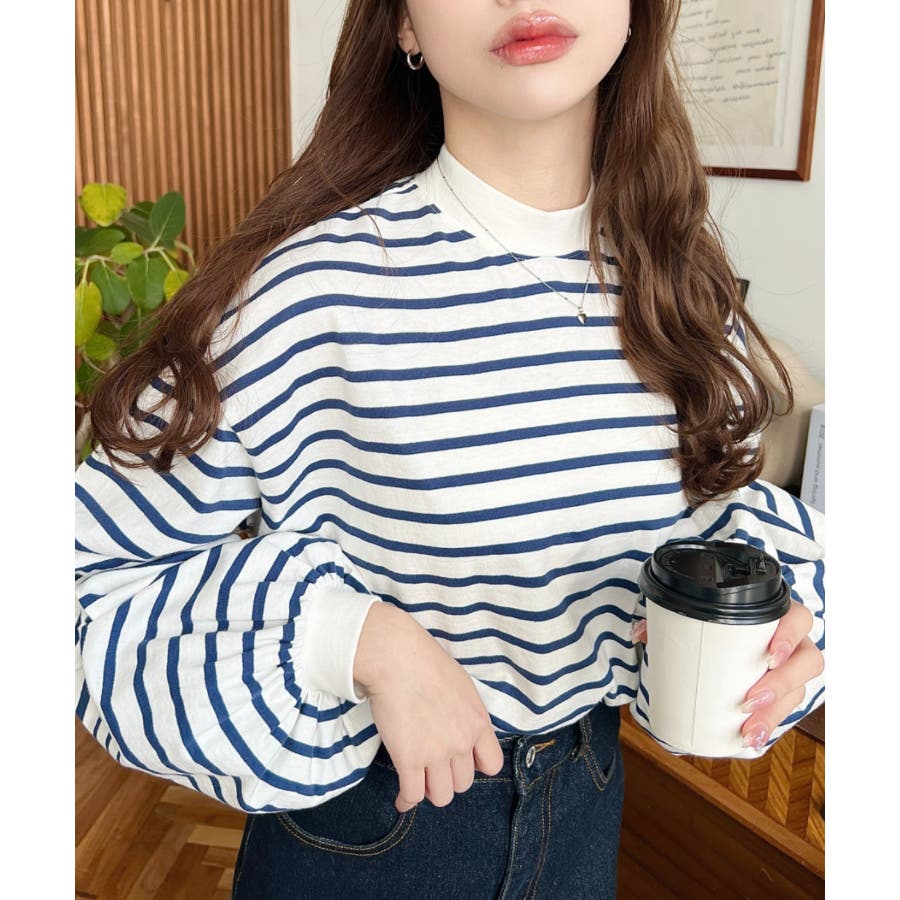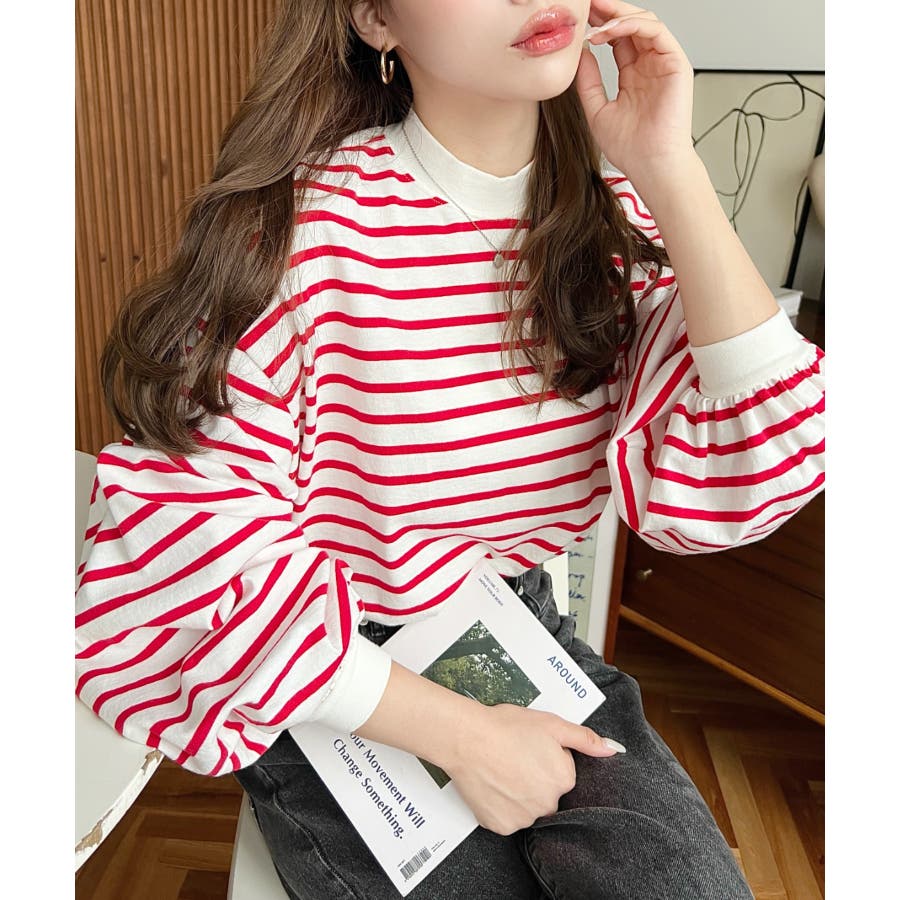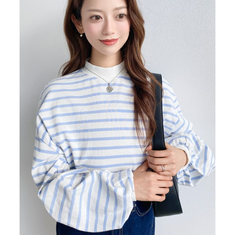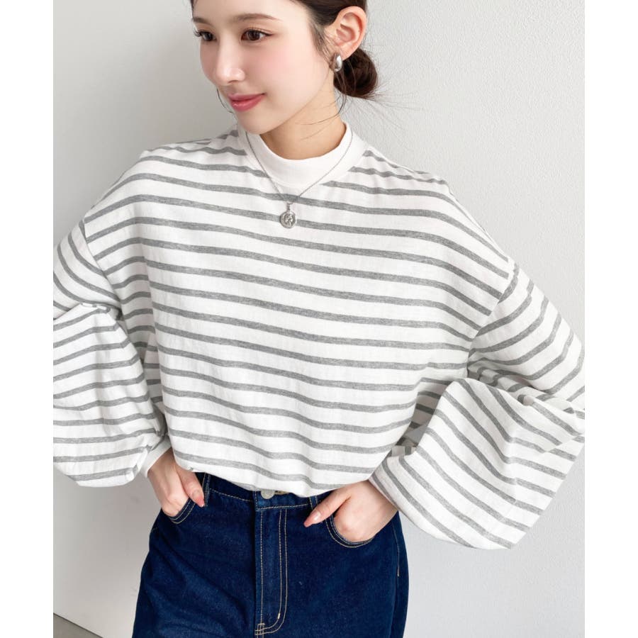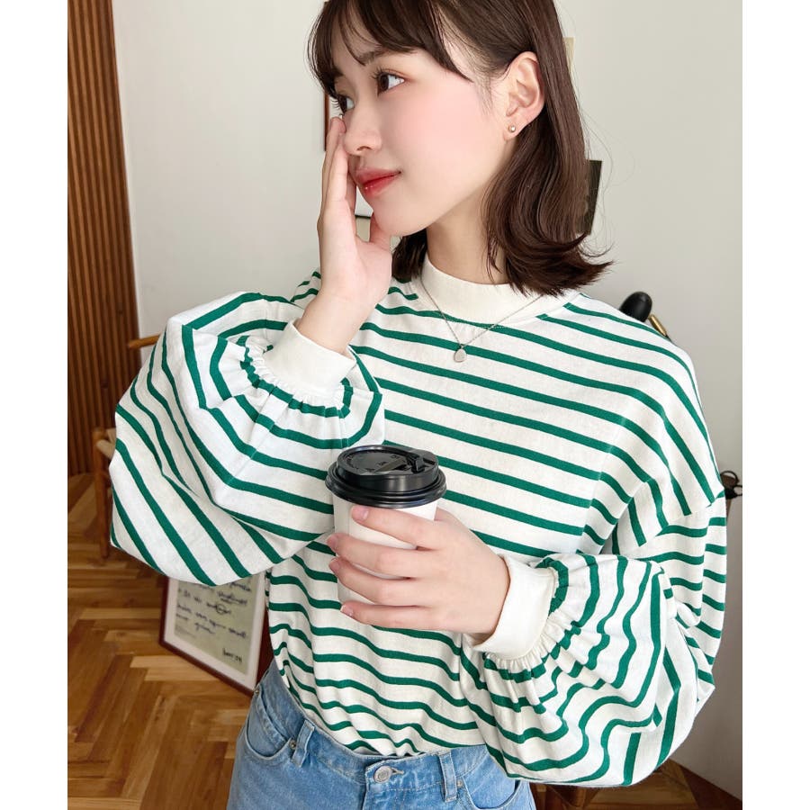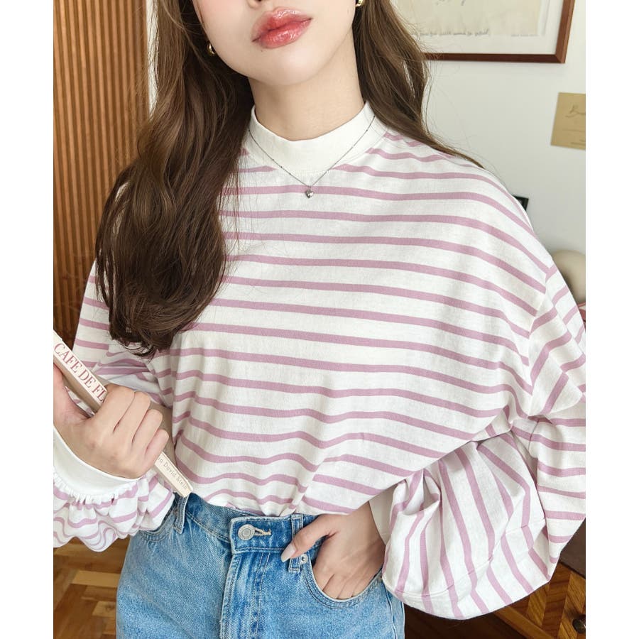 無地&ボーダー モックネックボリュームスリーブロンT 綿100%