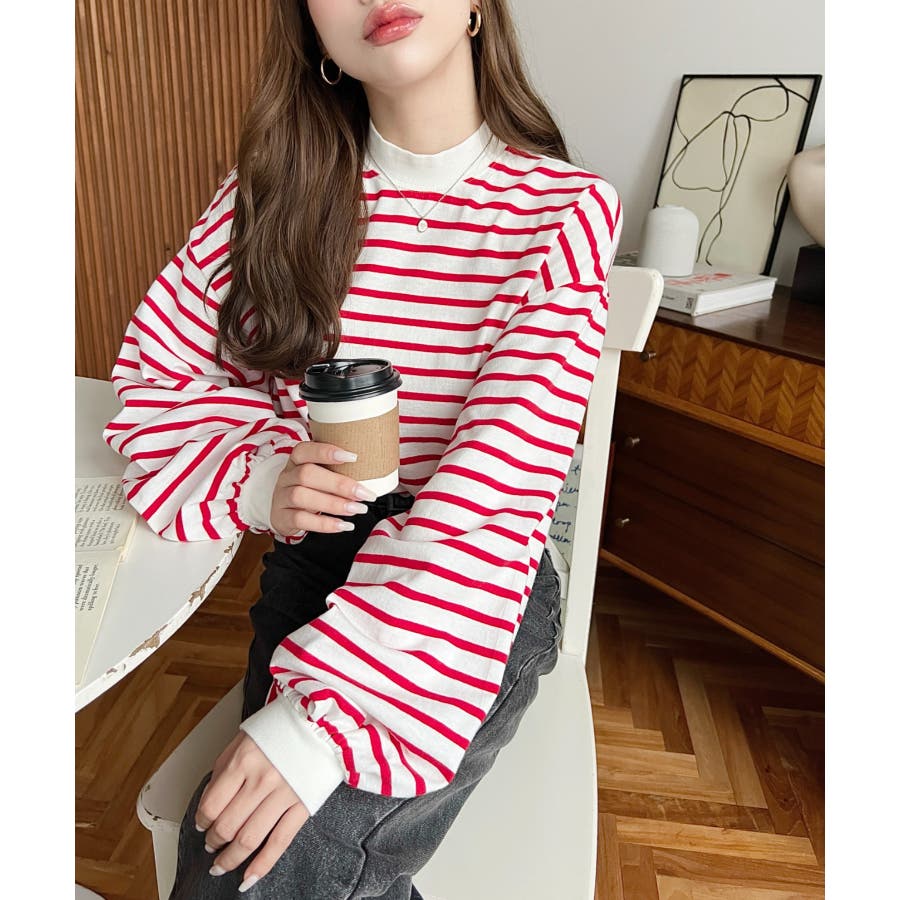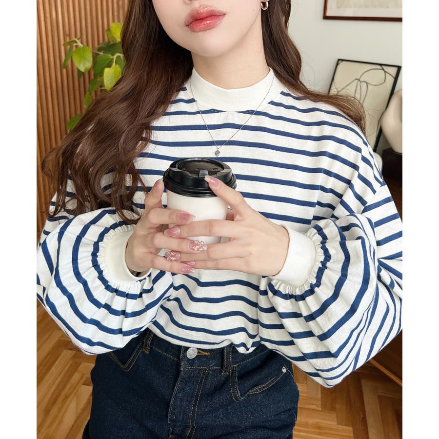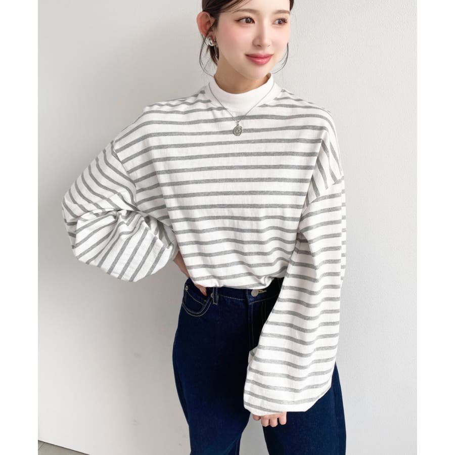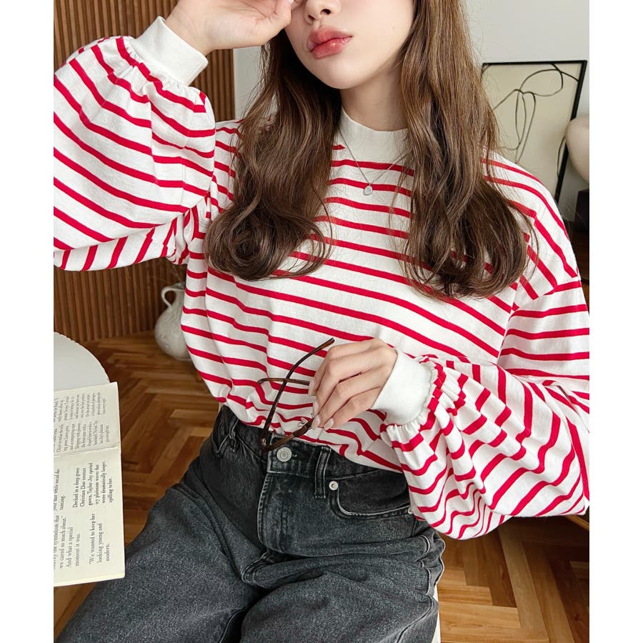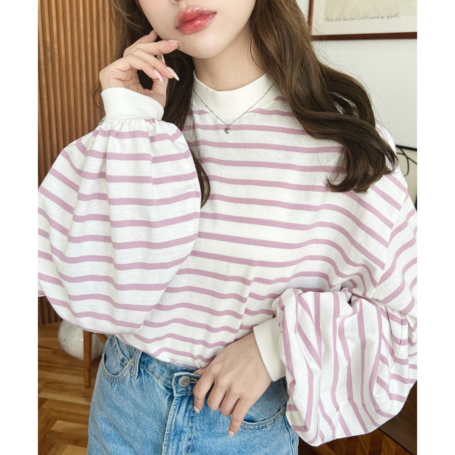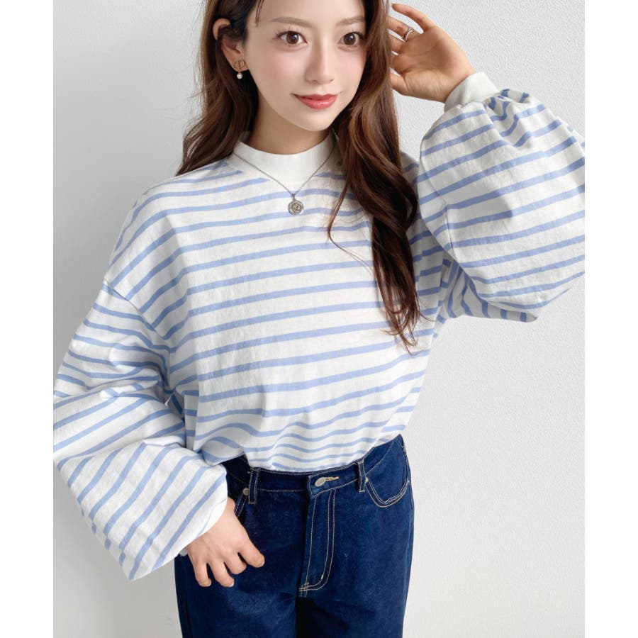 無地&ボーダー モックネックボリュームスリーブロンT 綿100%