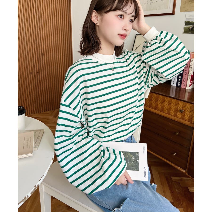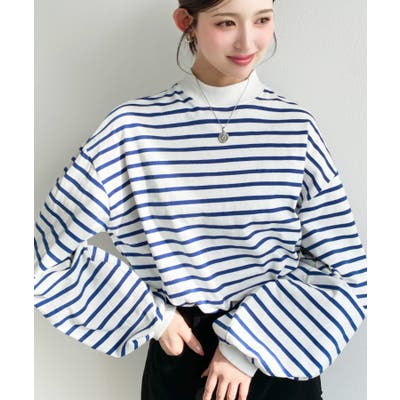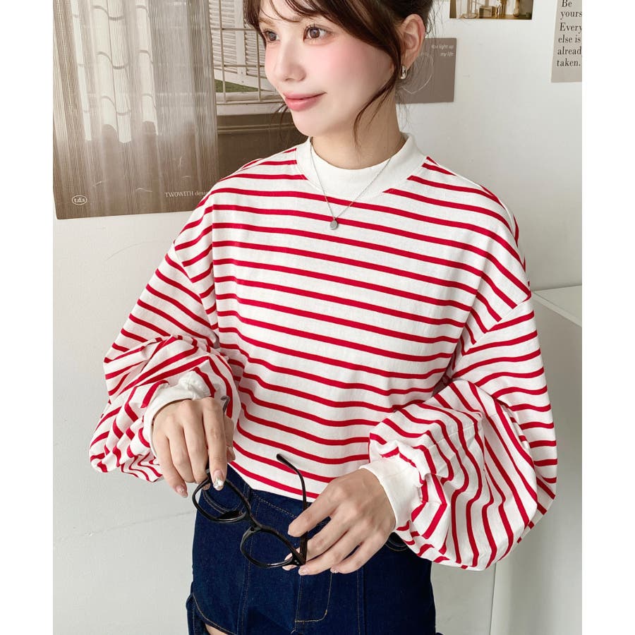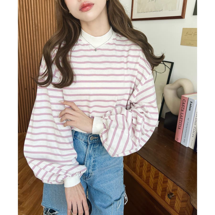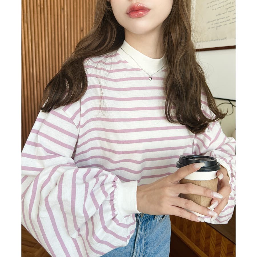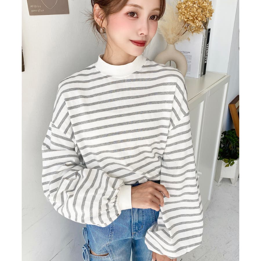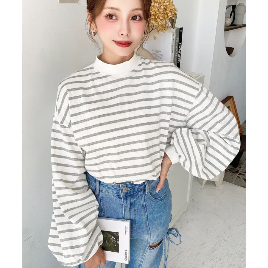 無地&ボーダー モックネックボリュームスリーブロンT 綿100%
