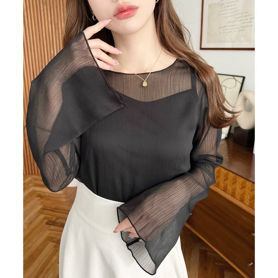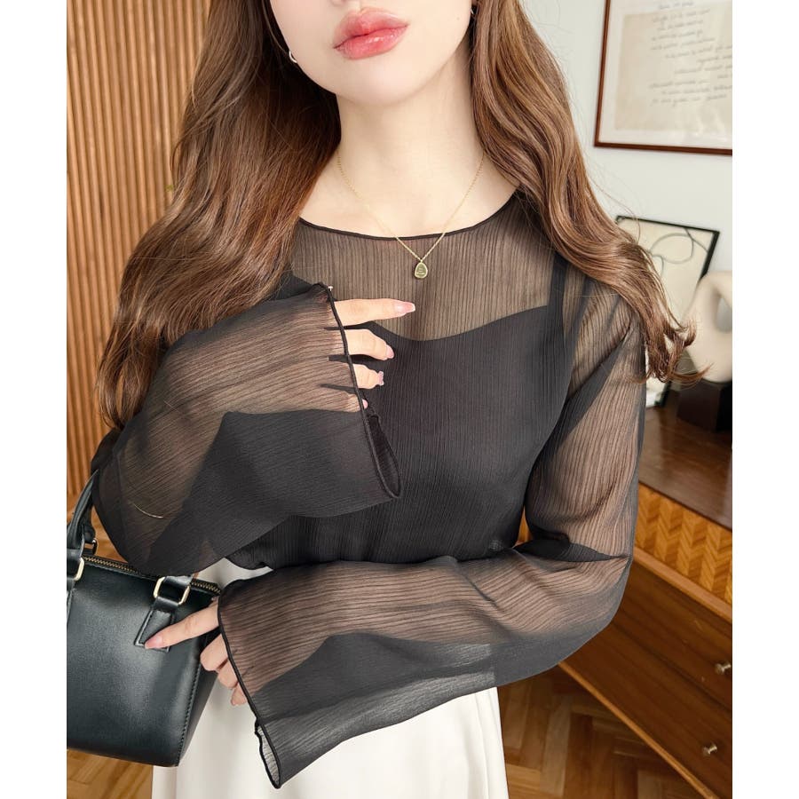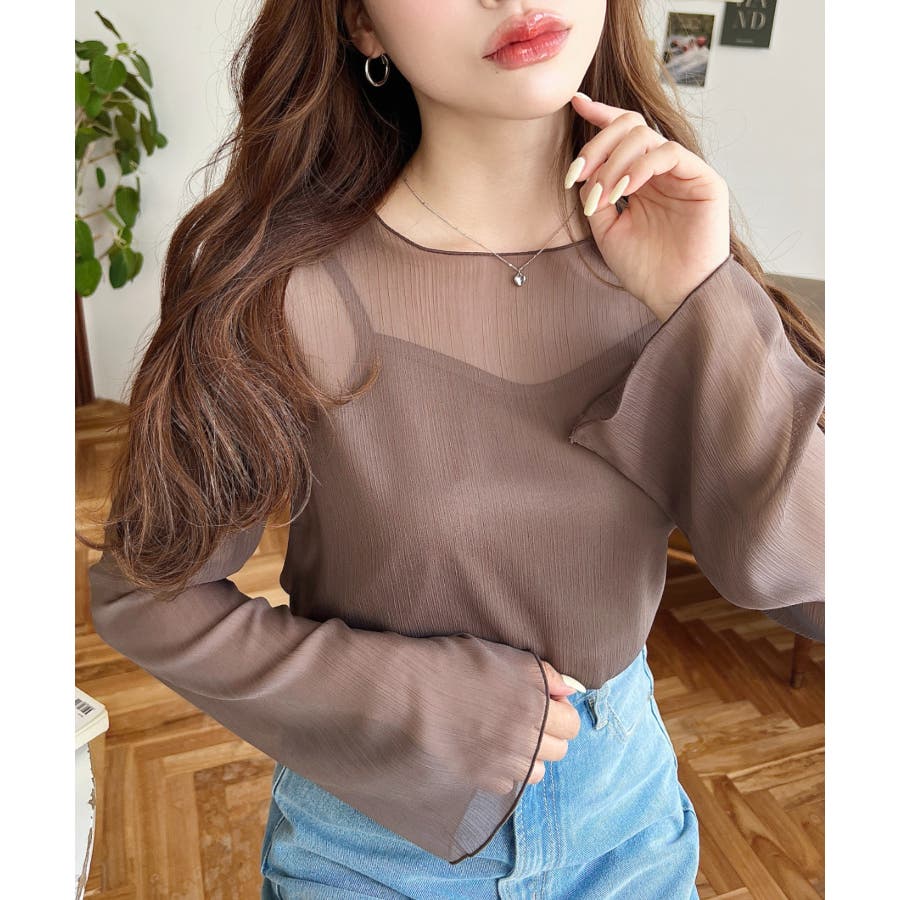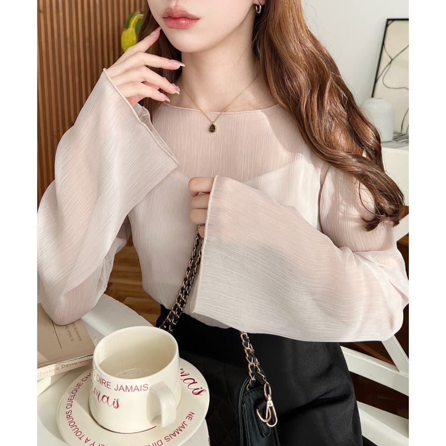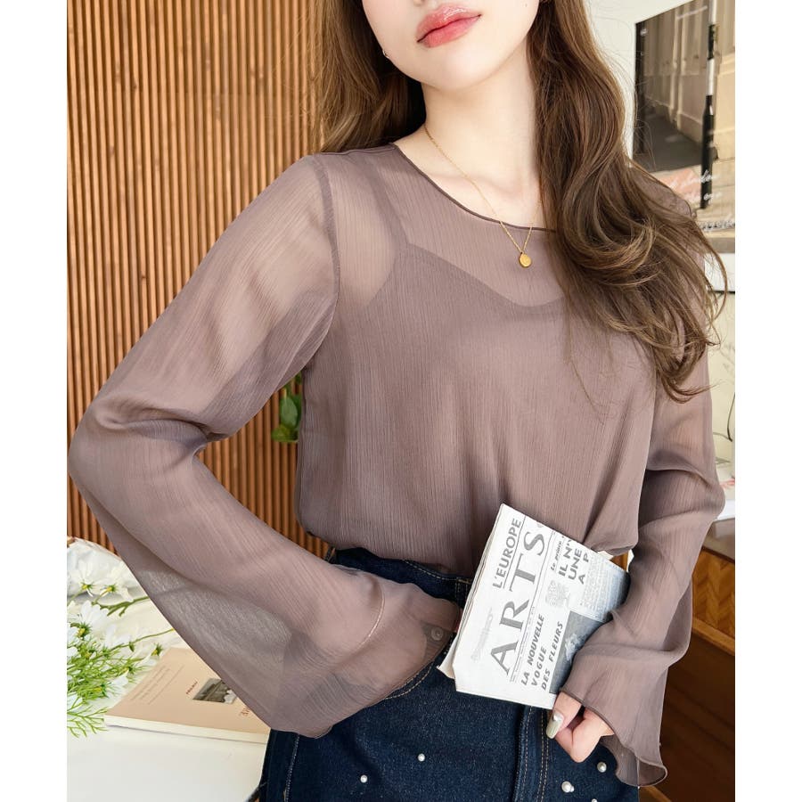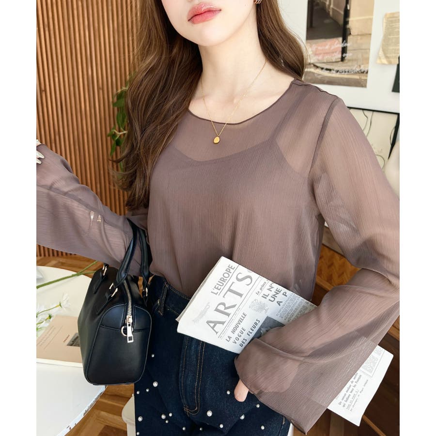 インナーキャミ付き長袖メロウ楊柳シアーブラウス
