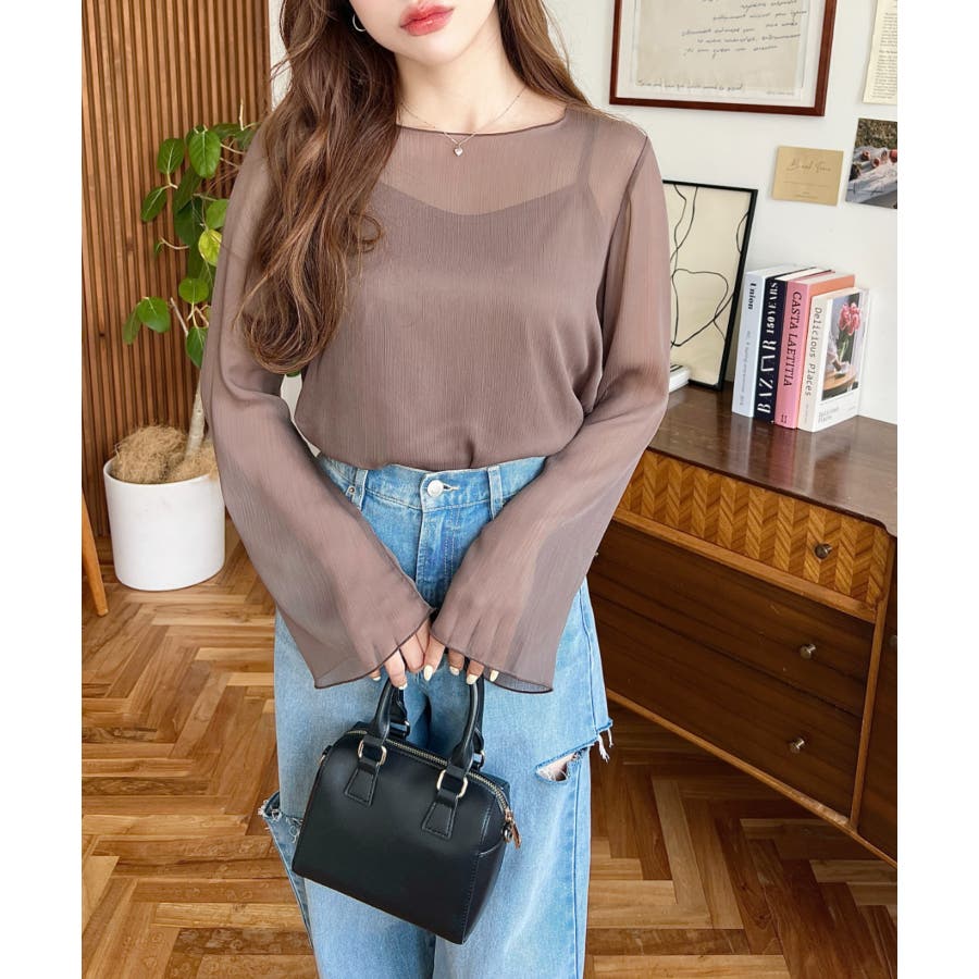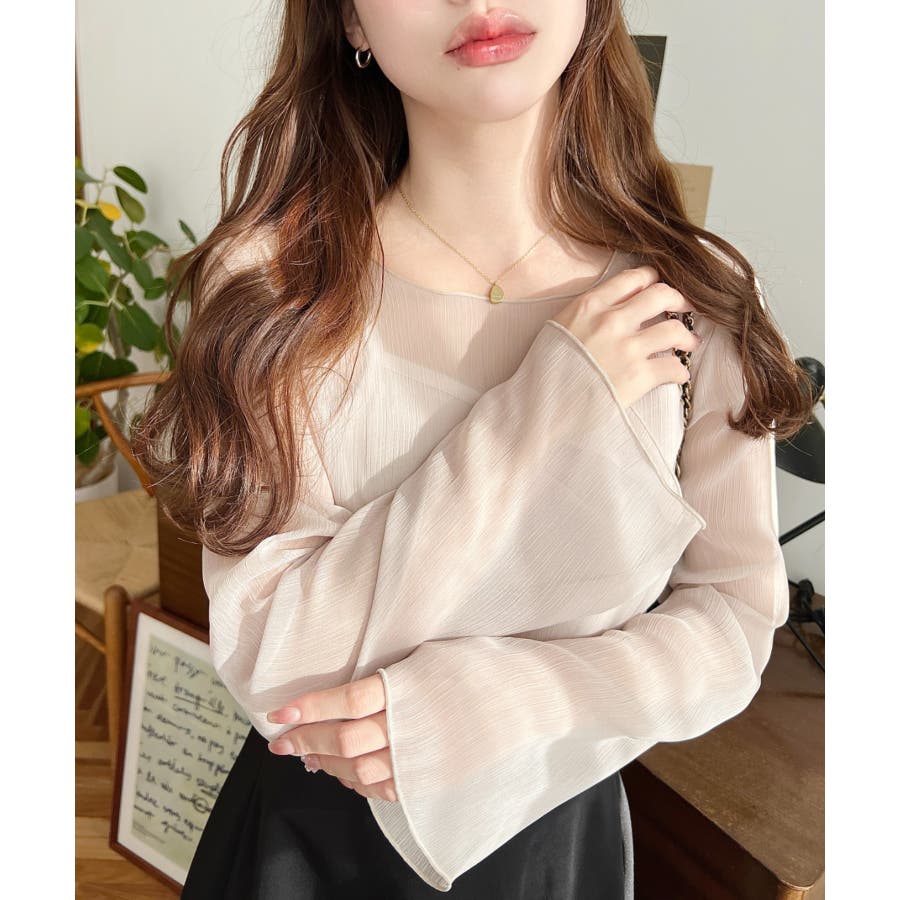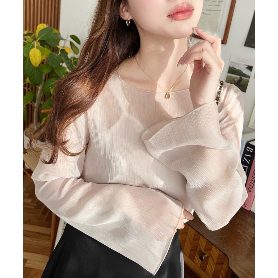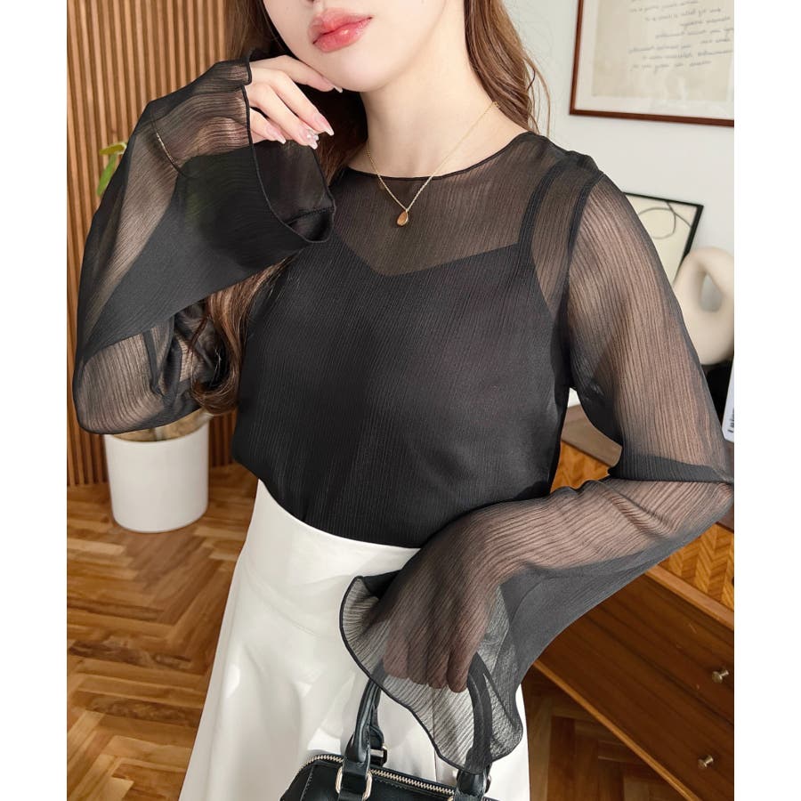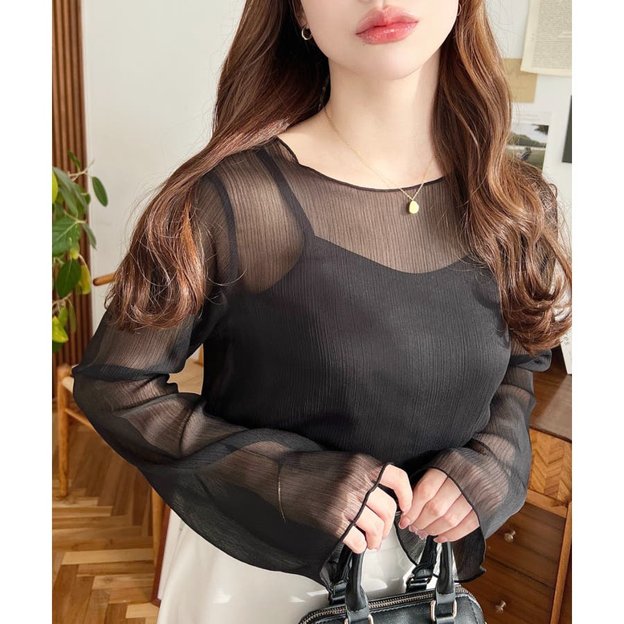 ・透け感のある素材にメローフリルをあしらったディテールと、袖口に向かって広がるフレアスリーブが、大人かわいい印象に◎
