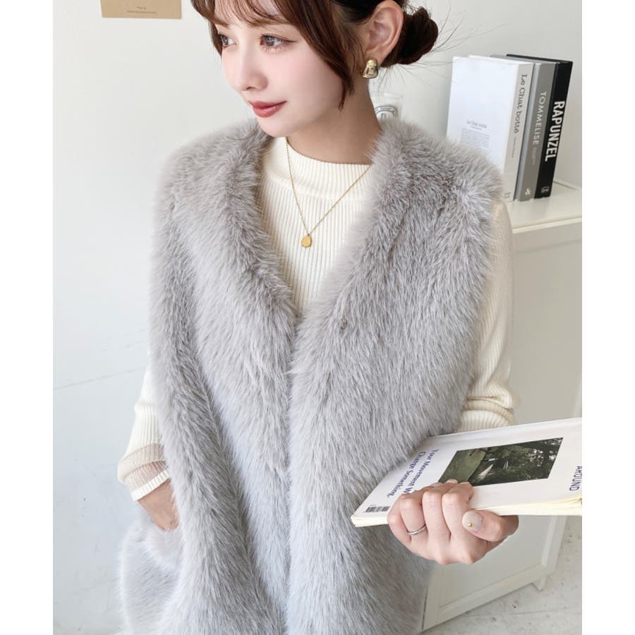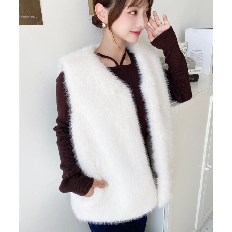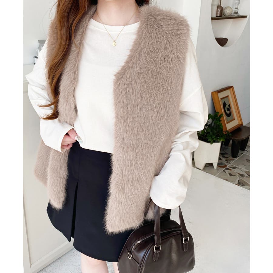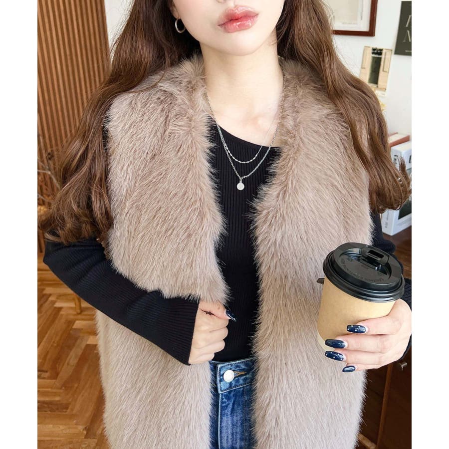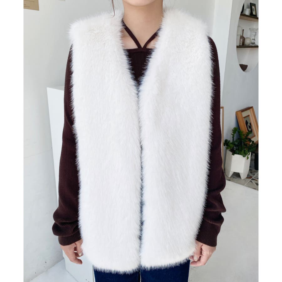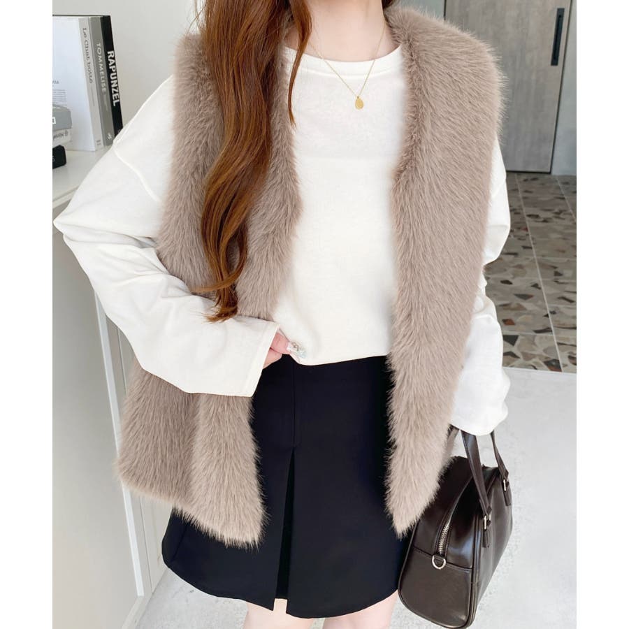 Vネックロングフェイクファーベスト
