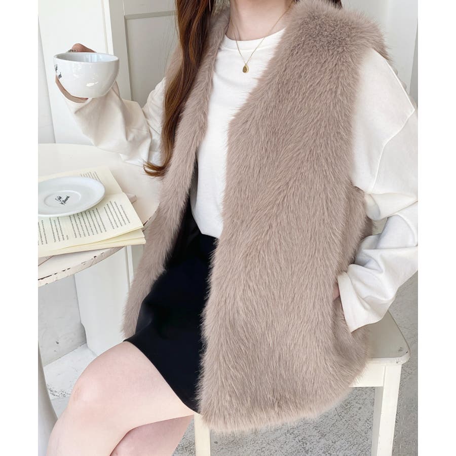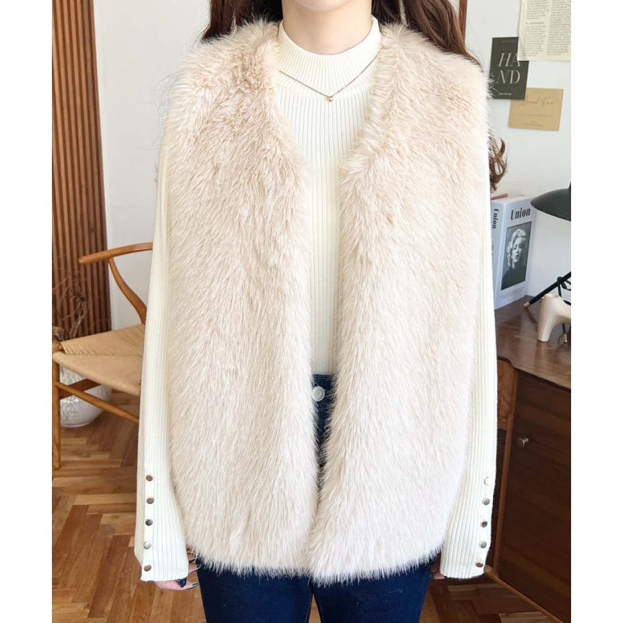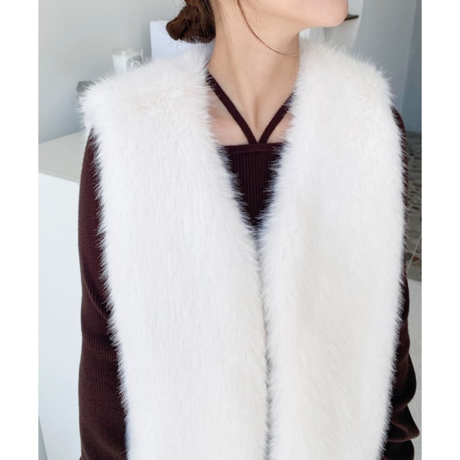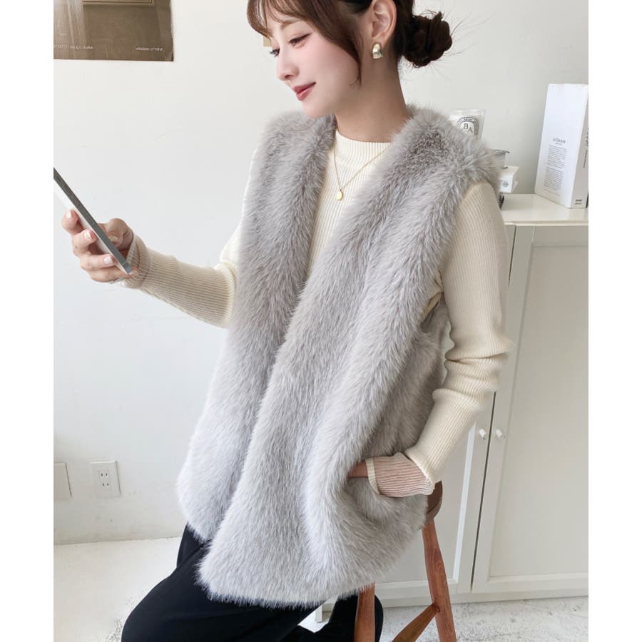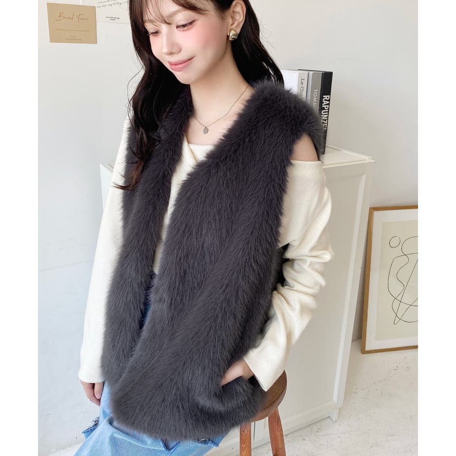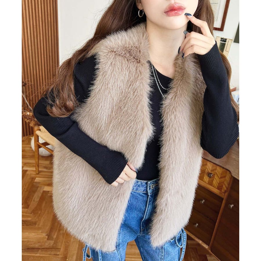 Vネックロングフェイクファーベスト