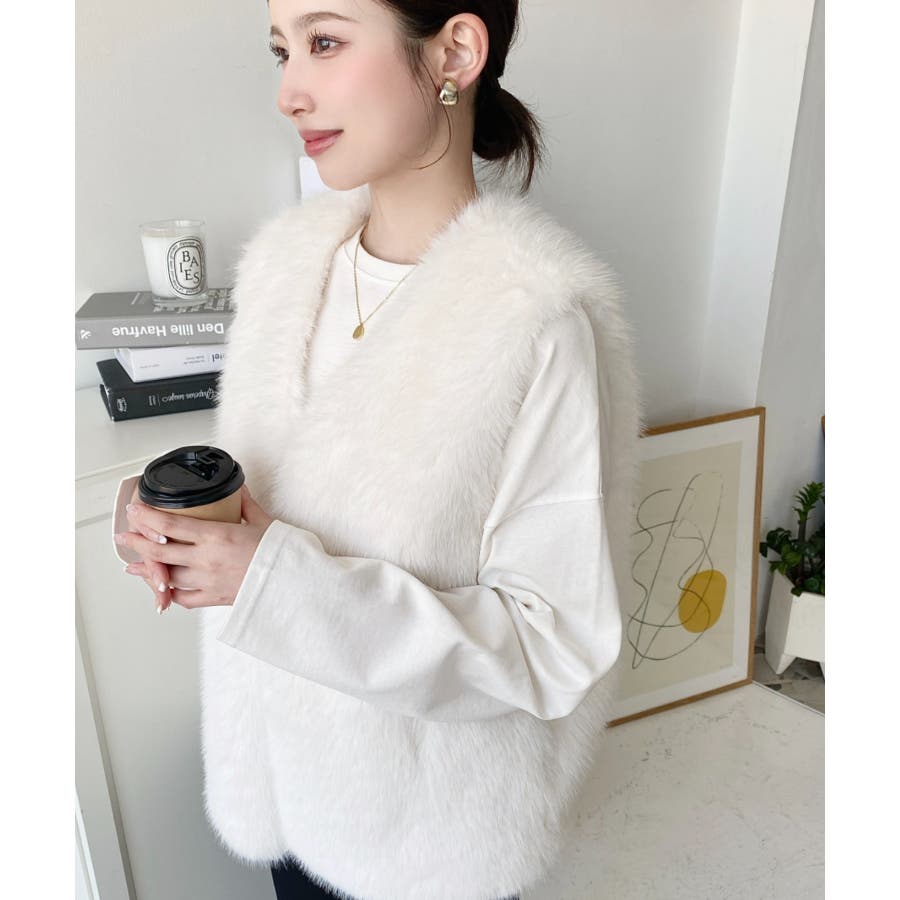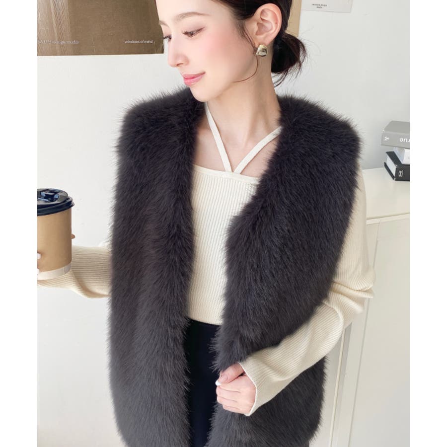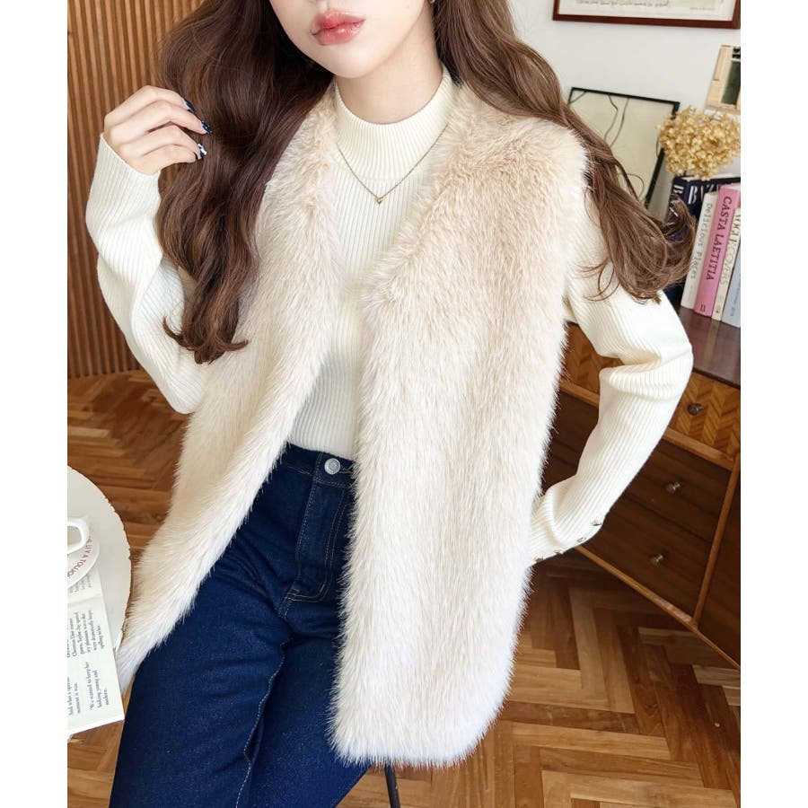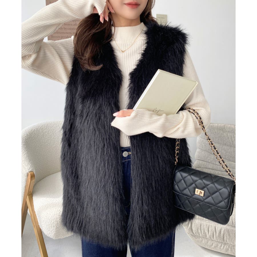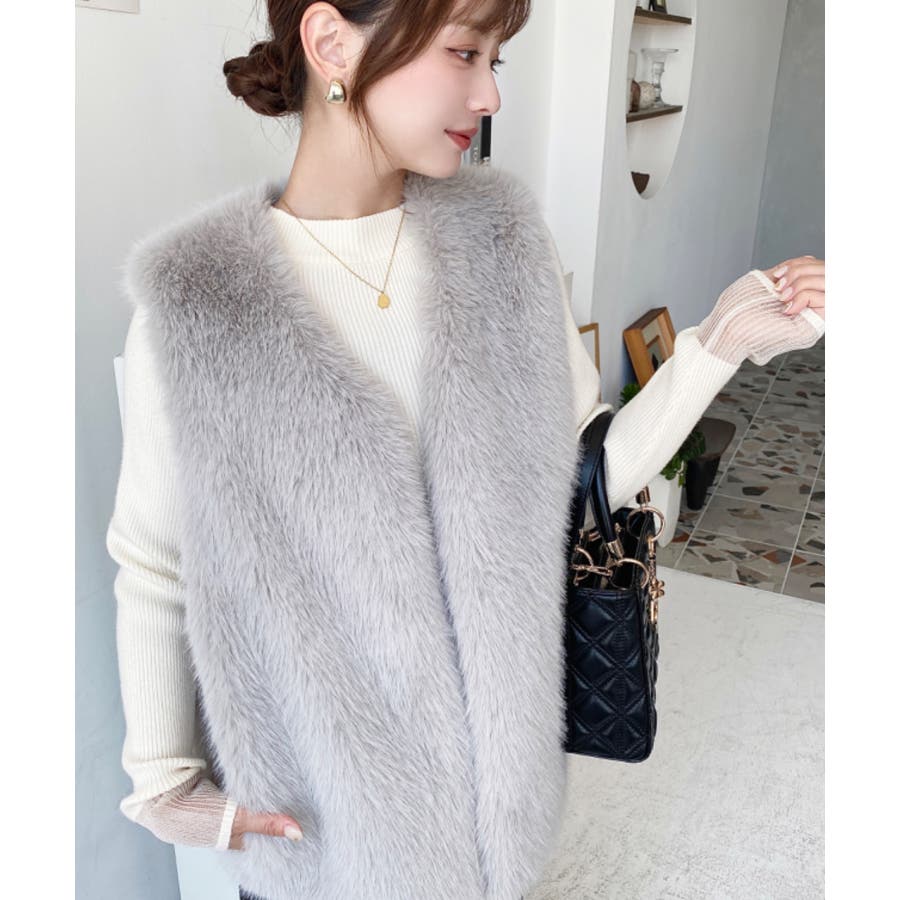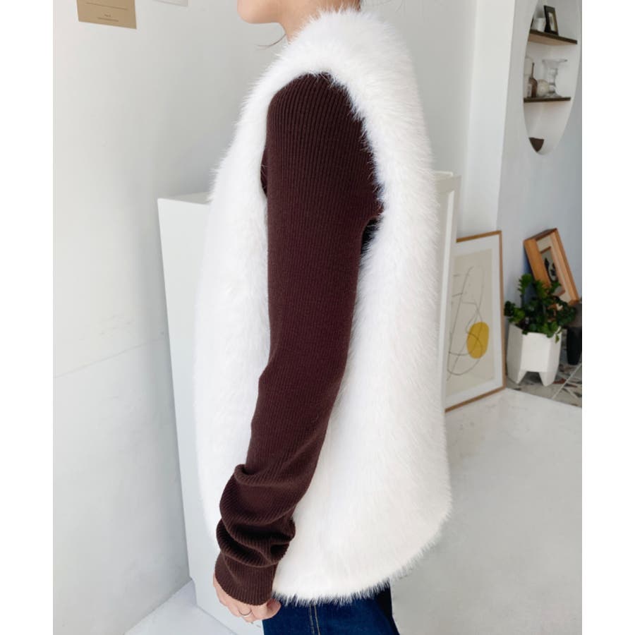 Vネックロングフェイクファーベスト