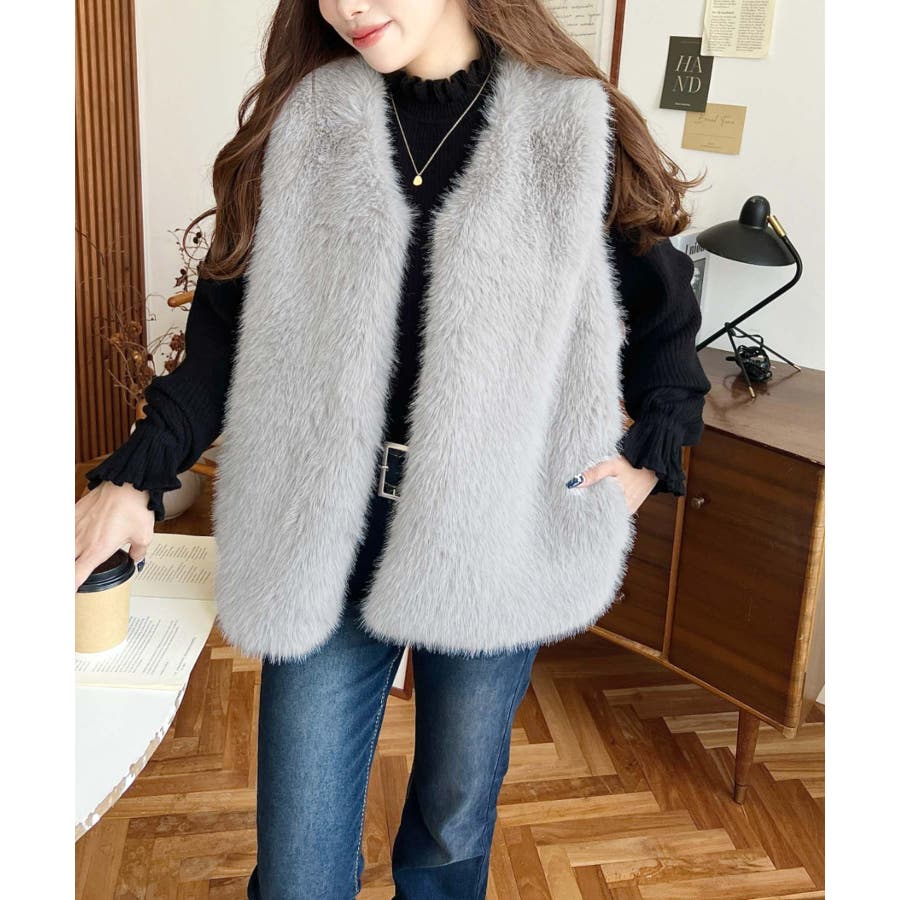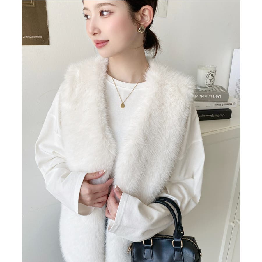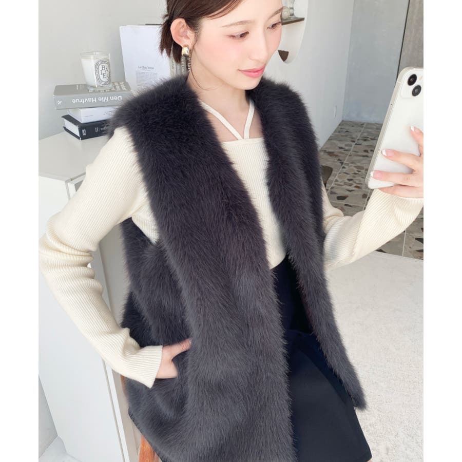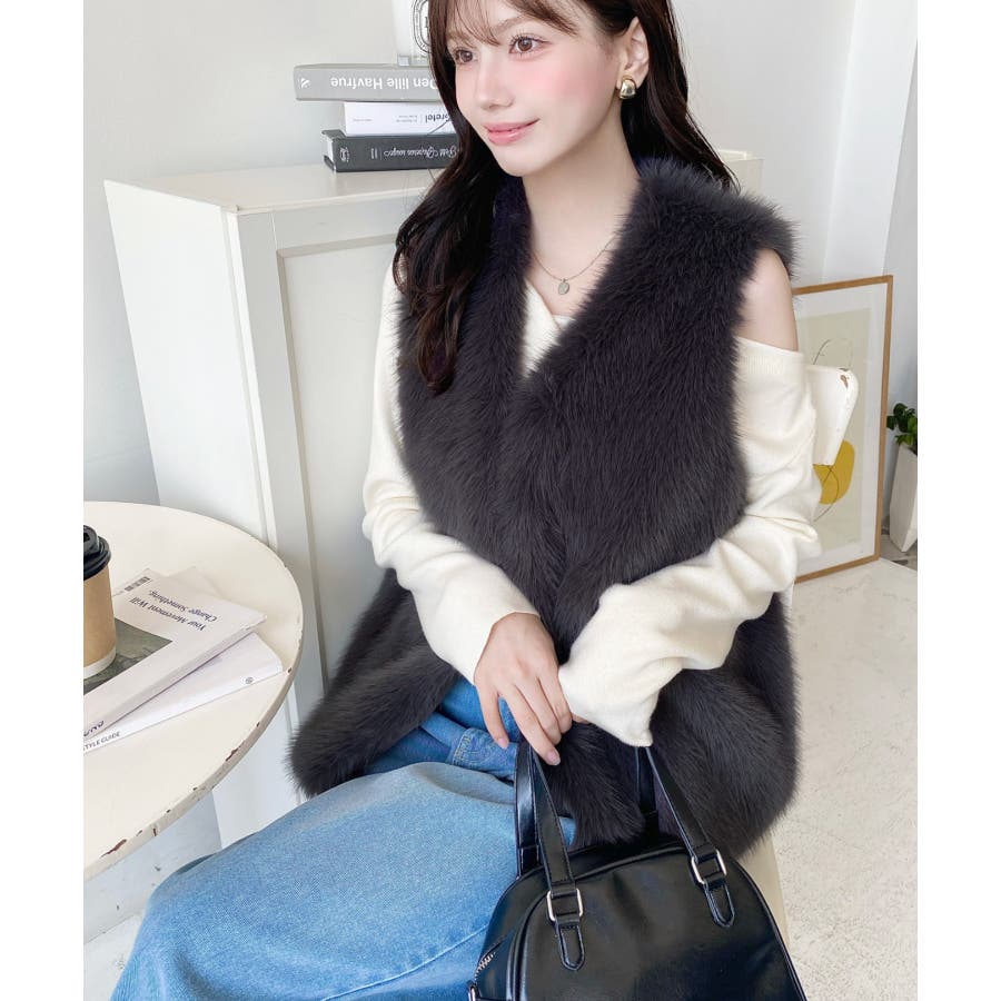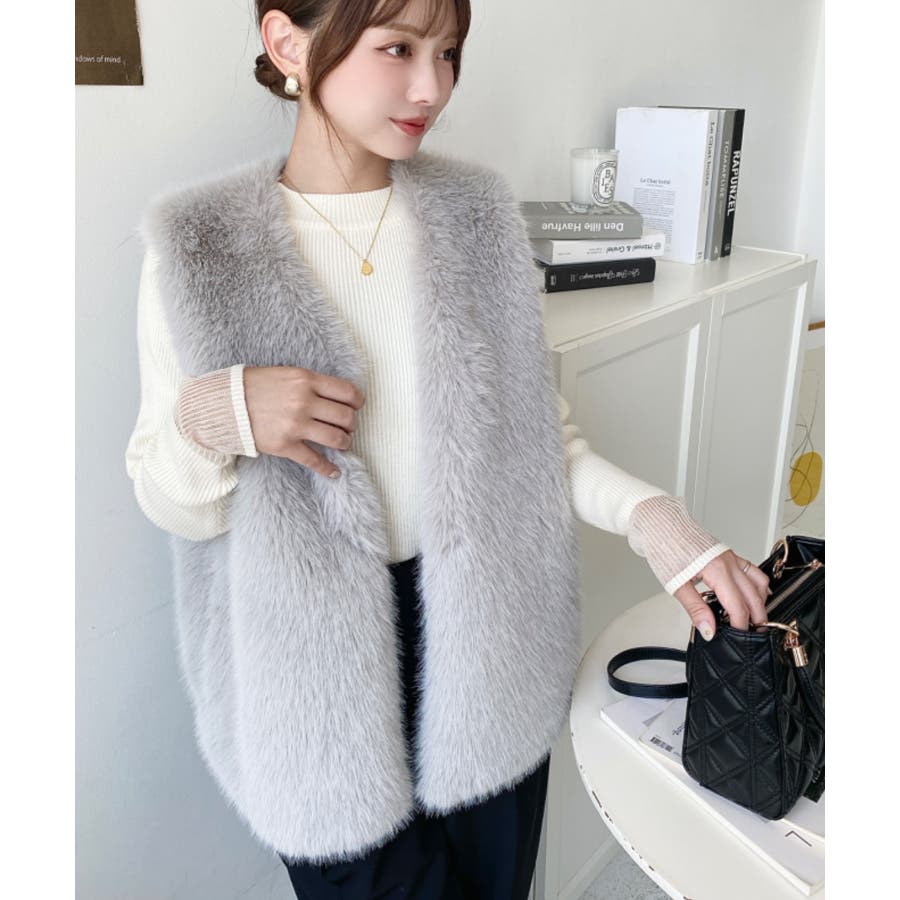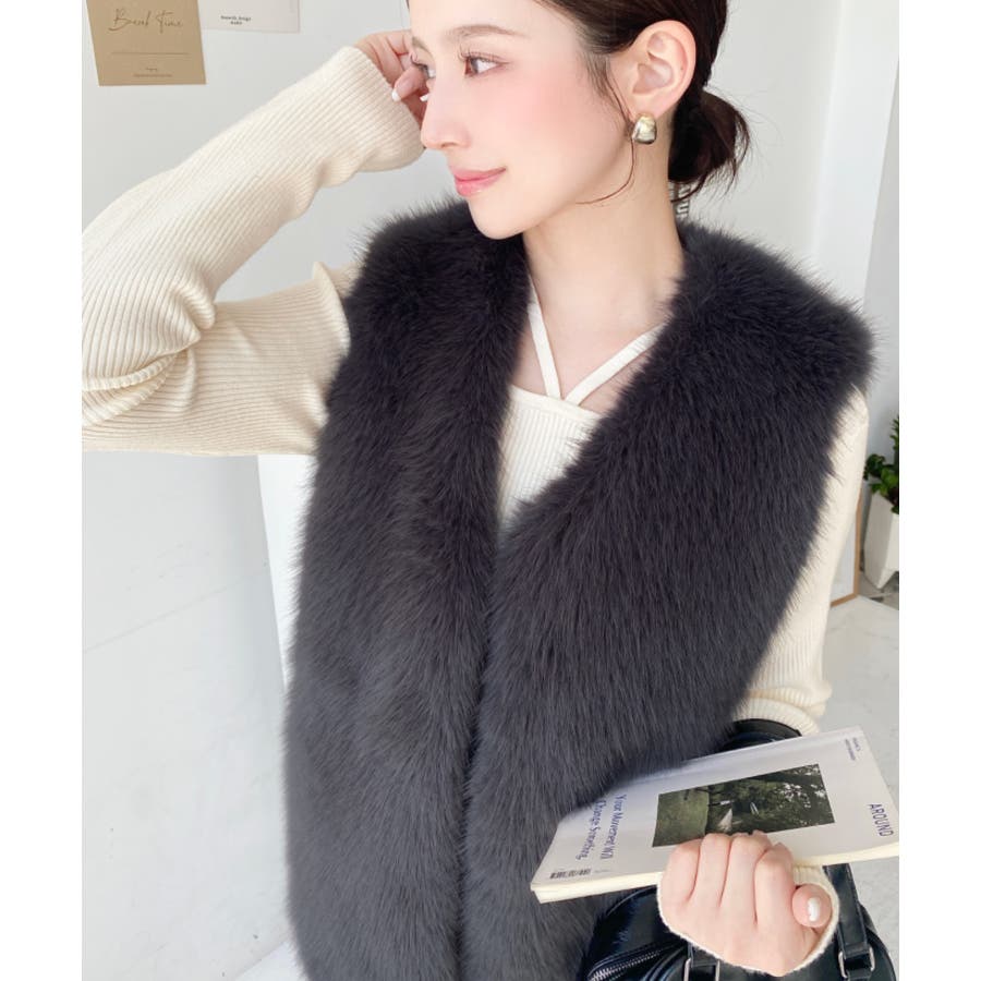 Vネックロングフェイクファーベスト