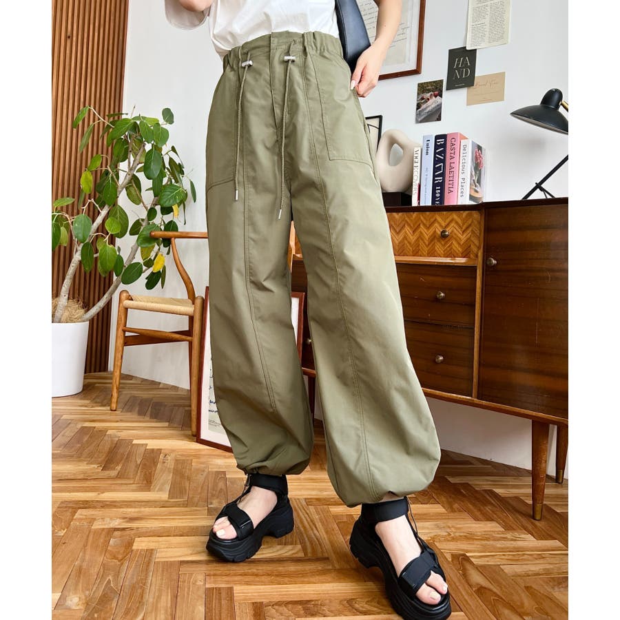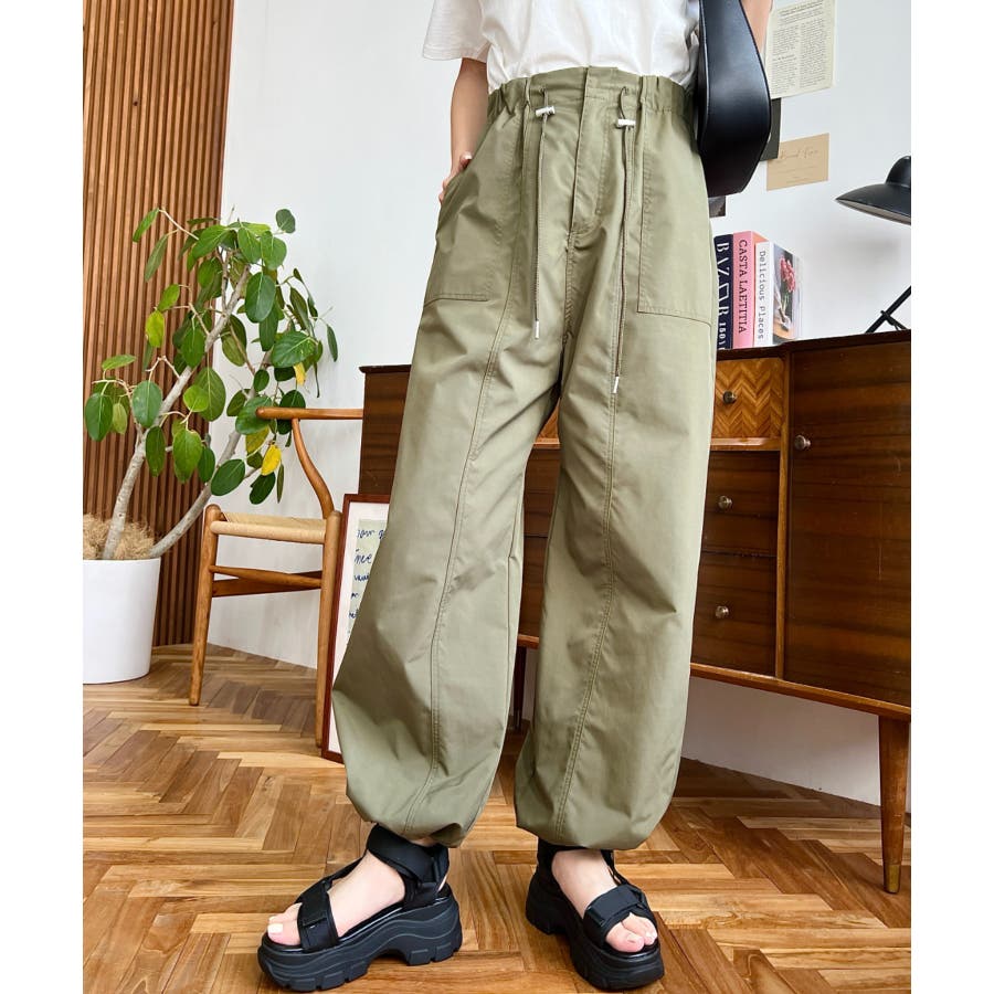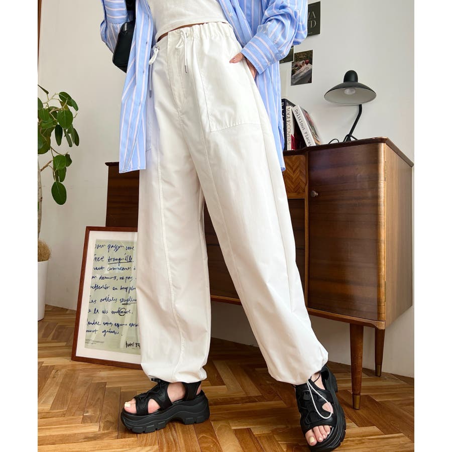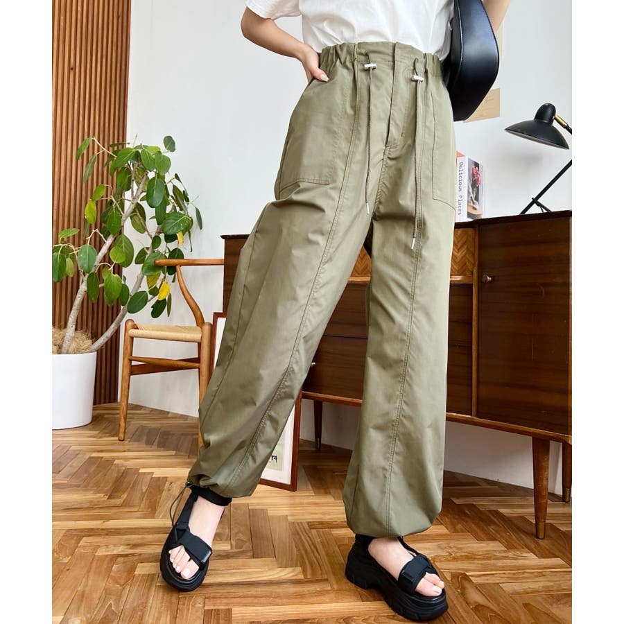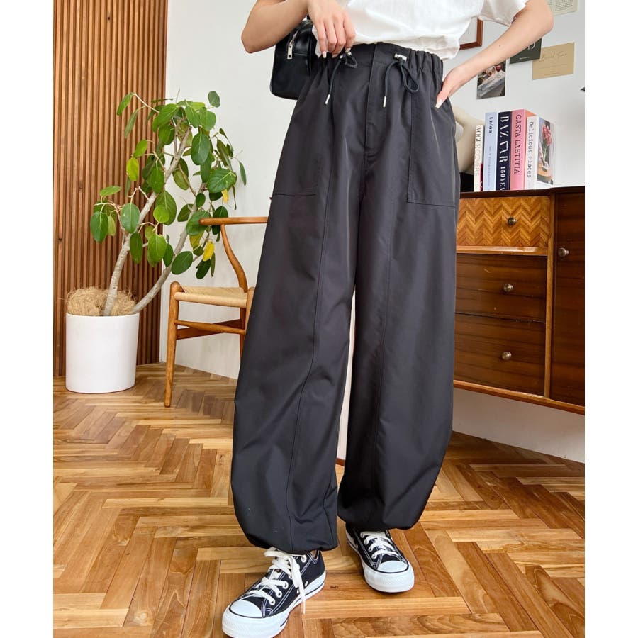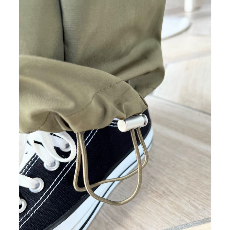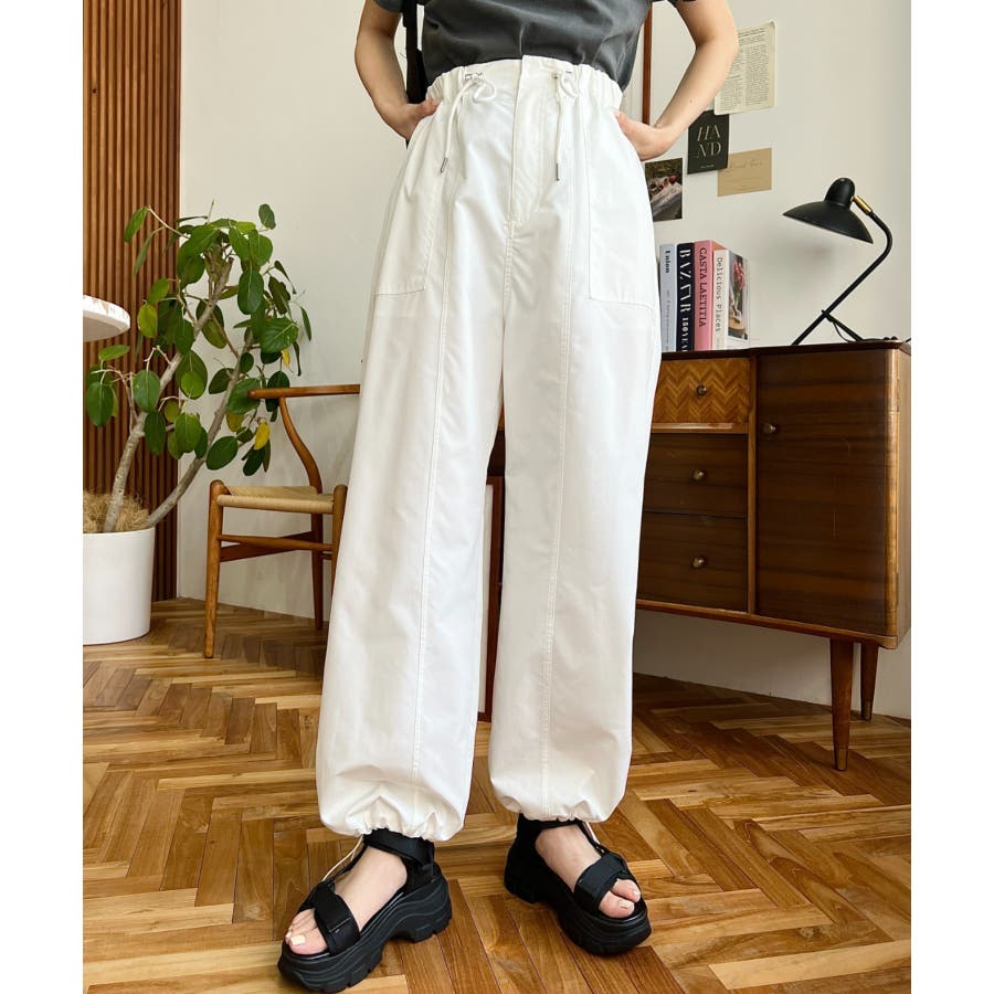 ・裾を絞って楽しめるパラシュートパンツはスニーカーはもちろん、ブーツなどヒール合わせでも◎