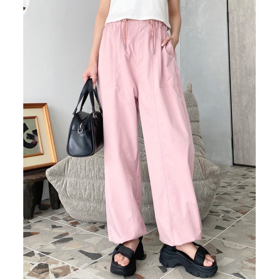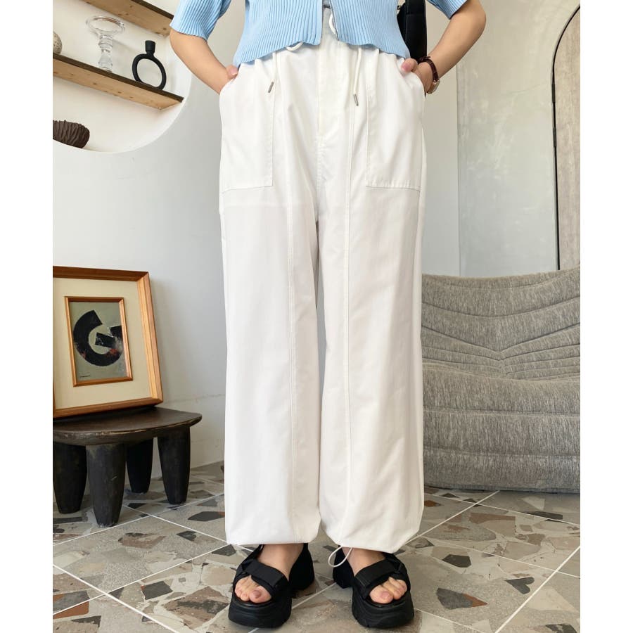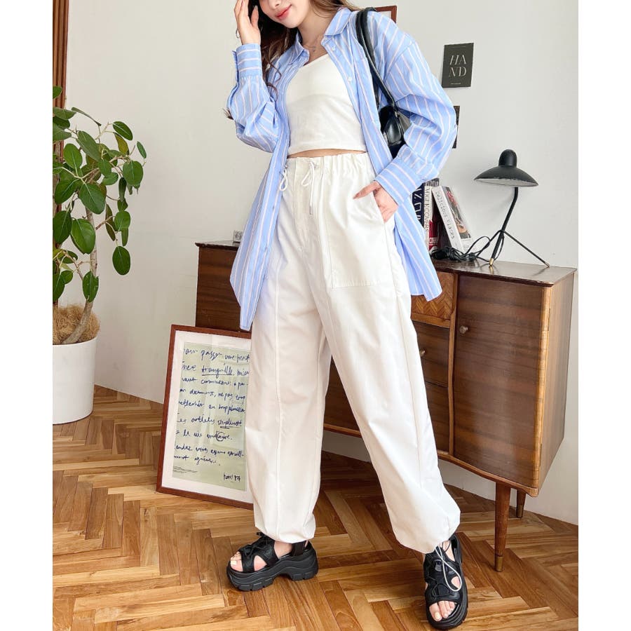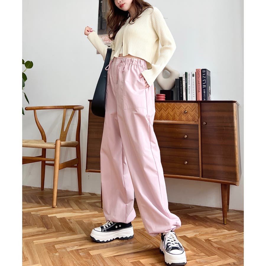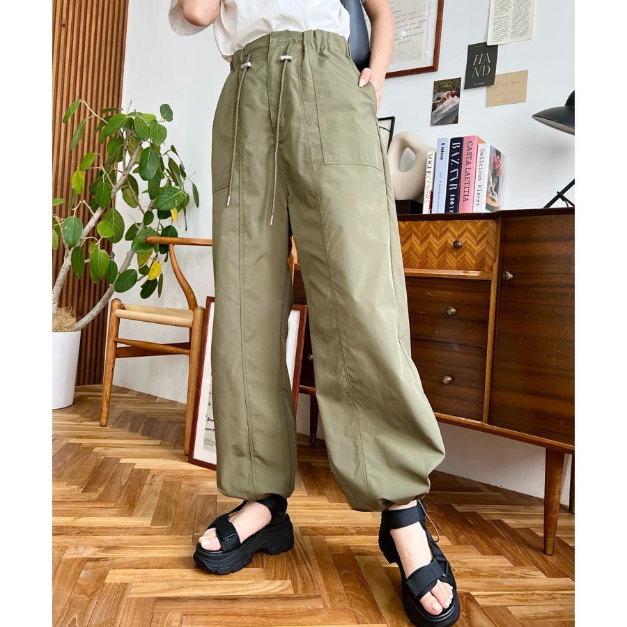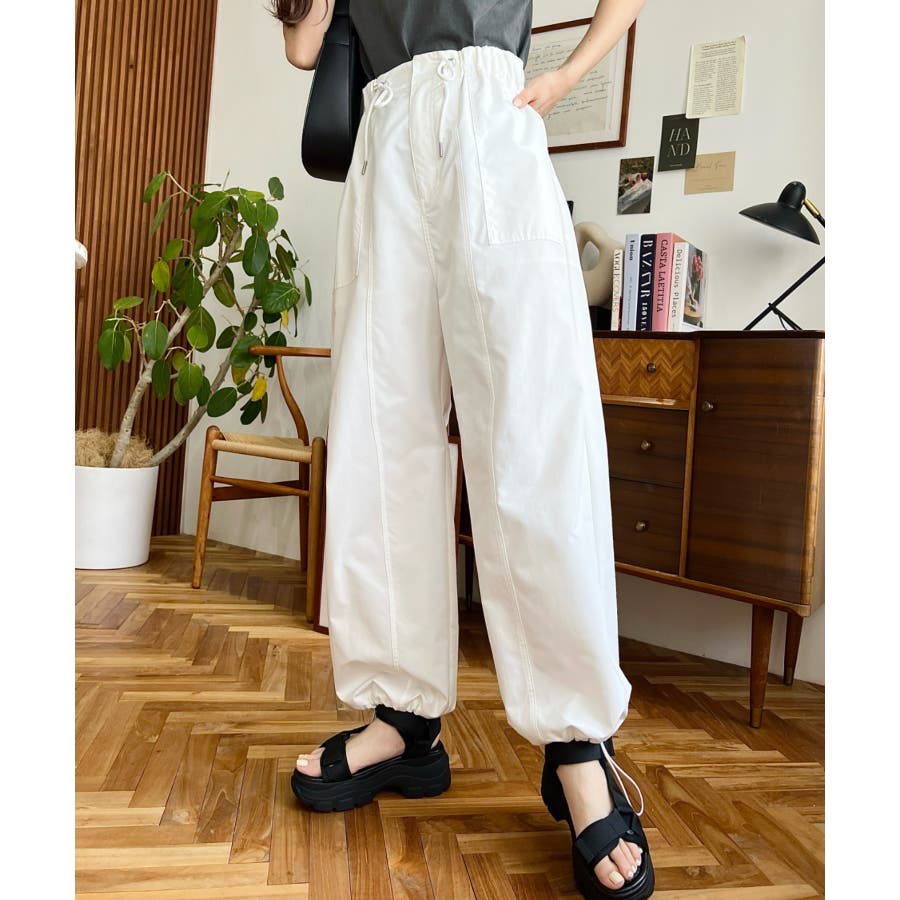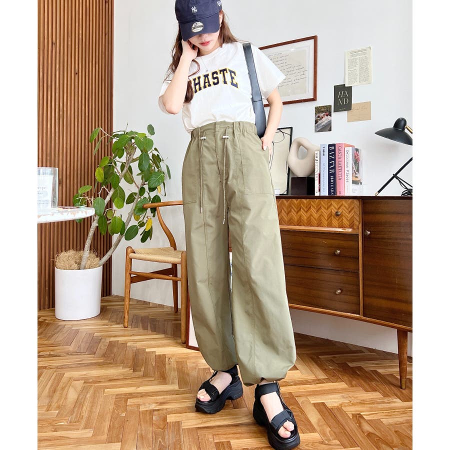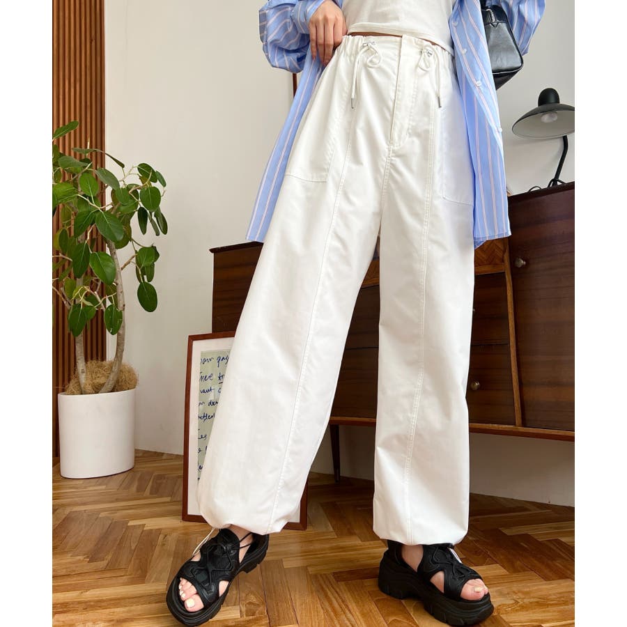 ・裾を絞って楽しめるパラシュートパンツはスニーカーはもちろん、ブーツなどヒール合わせでも◎