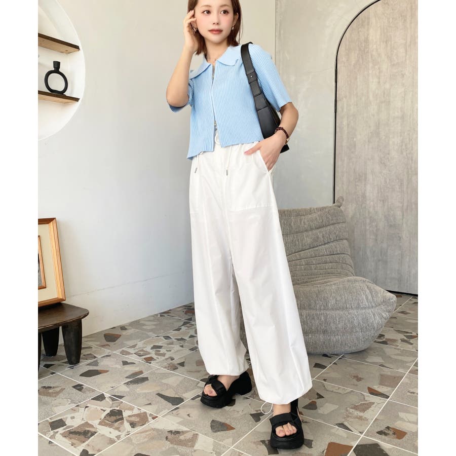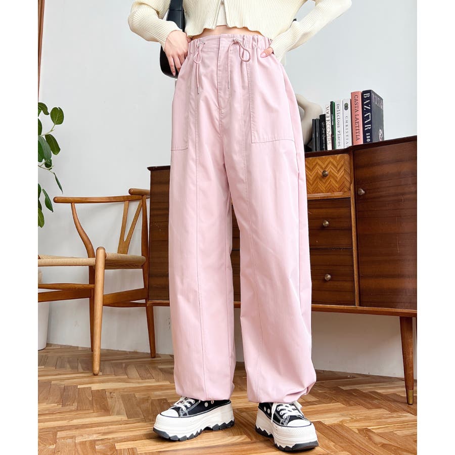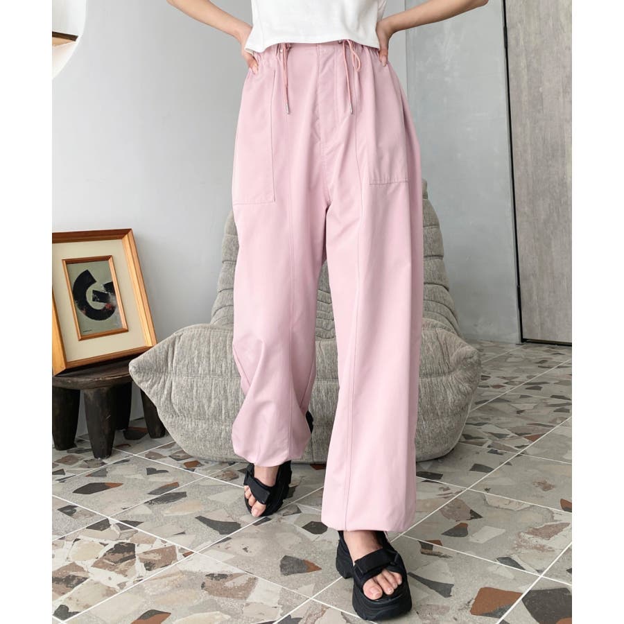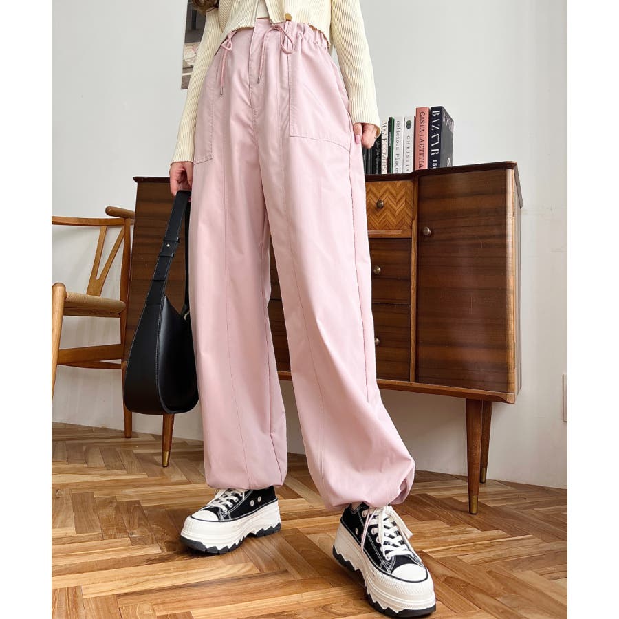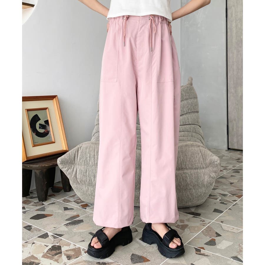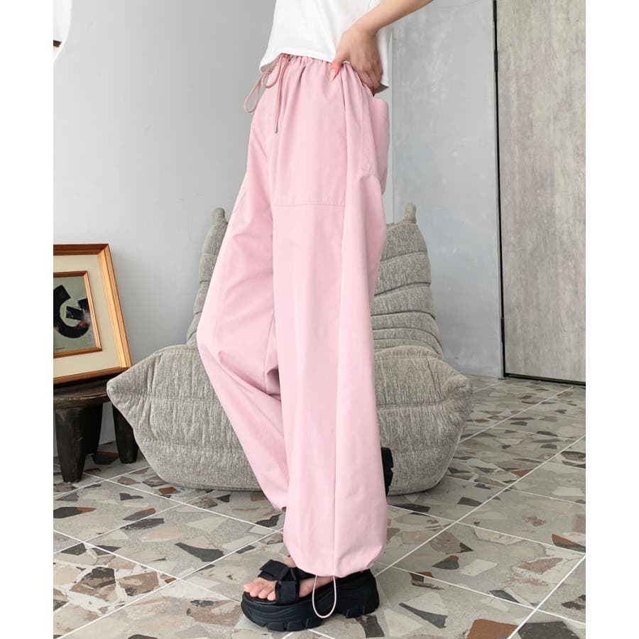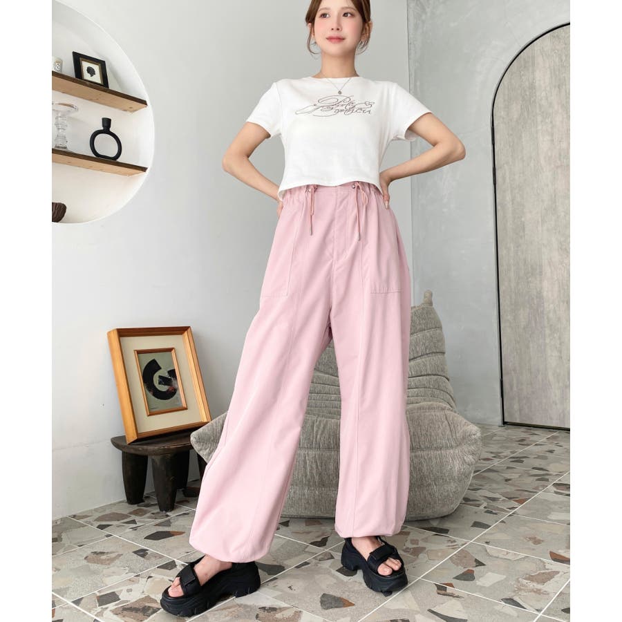・裾を絞って楽しめるパラシュートパンツはスニーカーはもちろん、ブーツなどヒール合わせでも◎