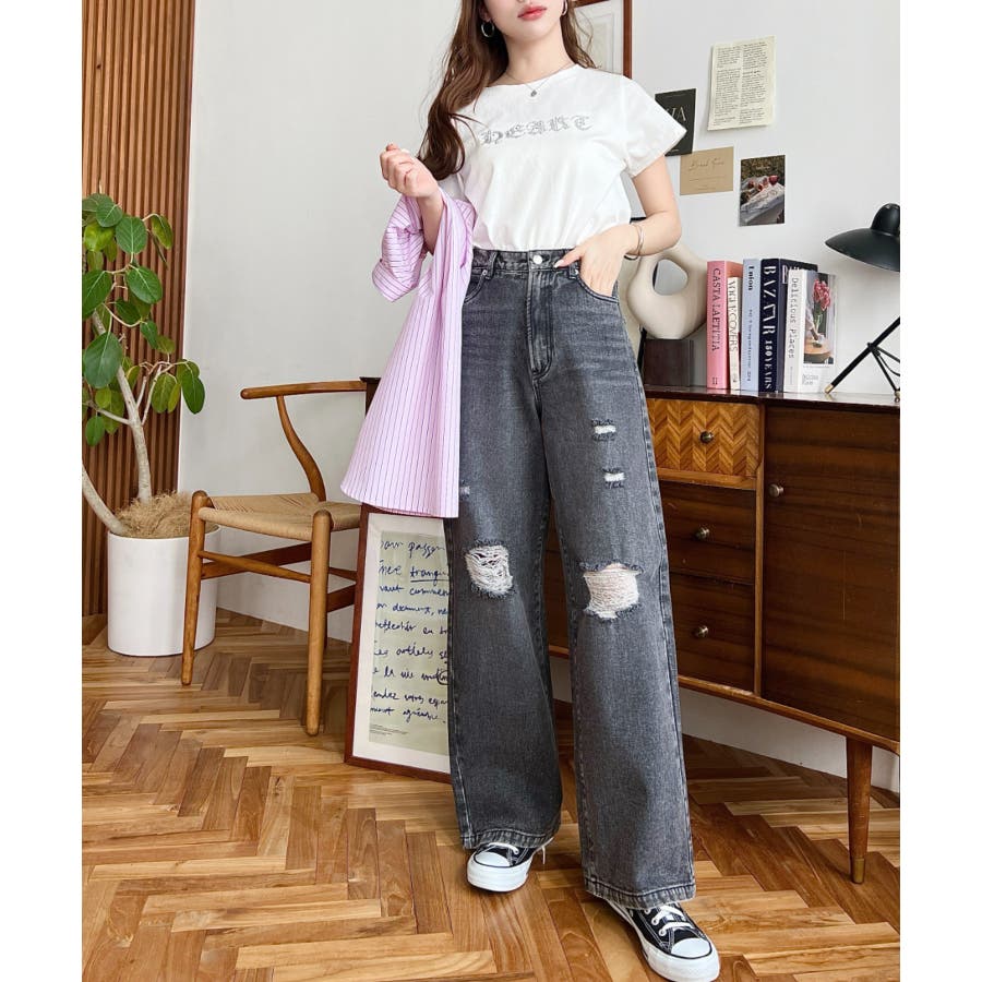 ・お手持ちのベーシックなアイテム合わせでダメージ加工をアクセントに。簡単に印象的なスタイリングへと仕上げます◎