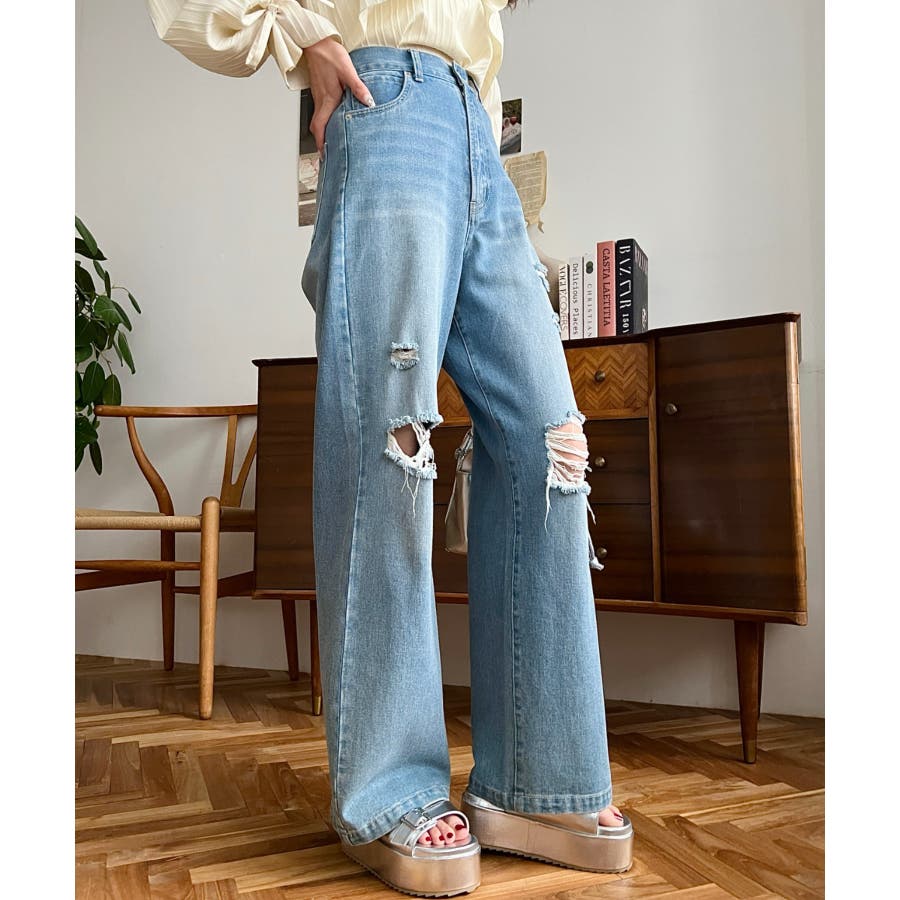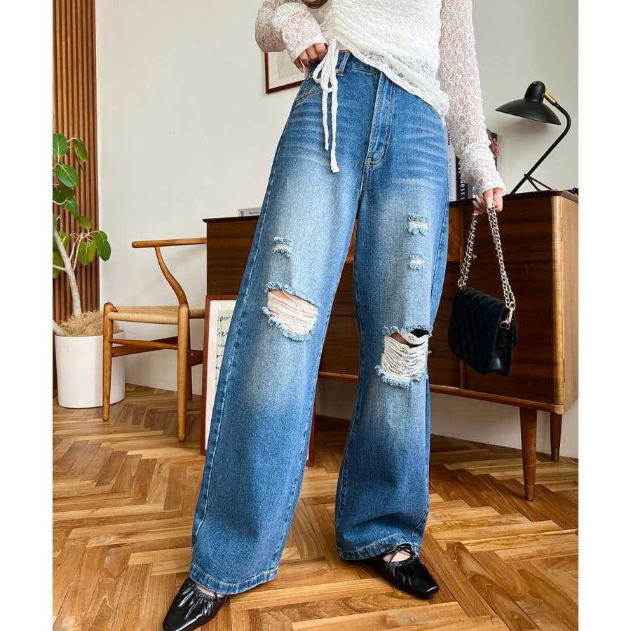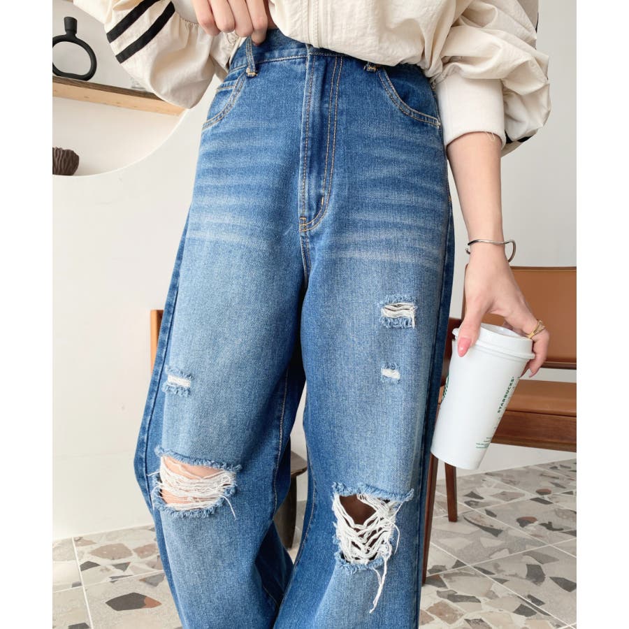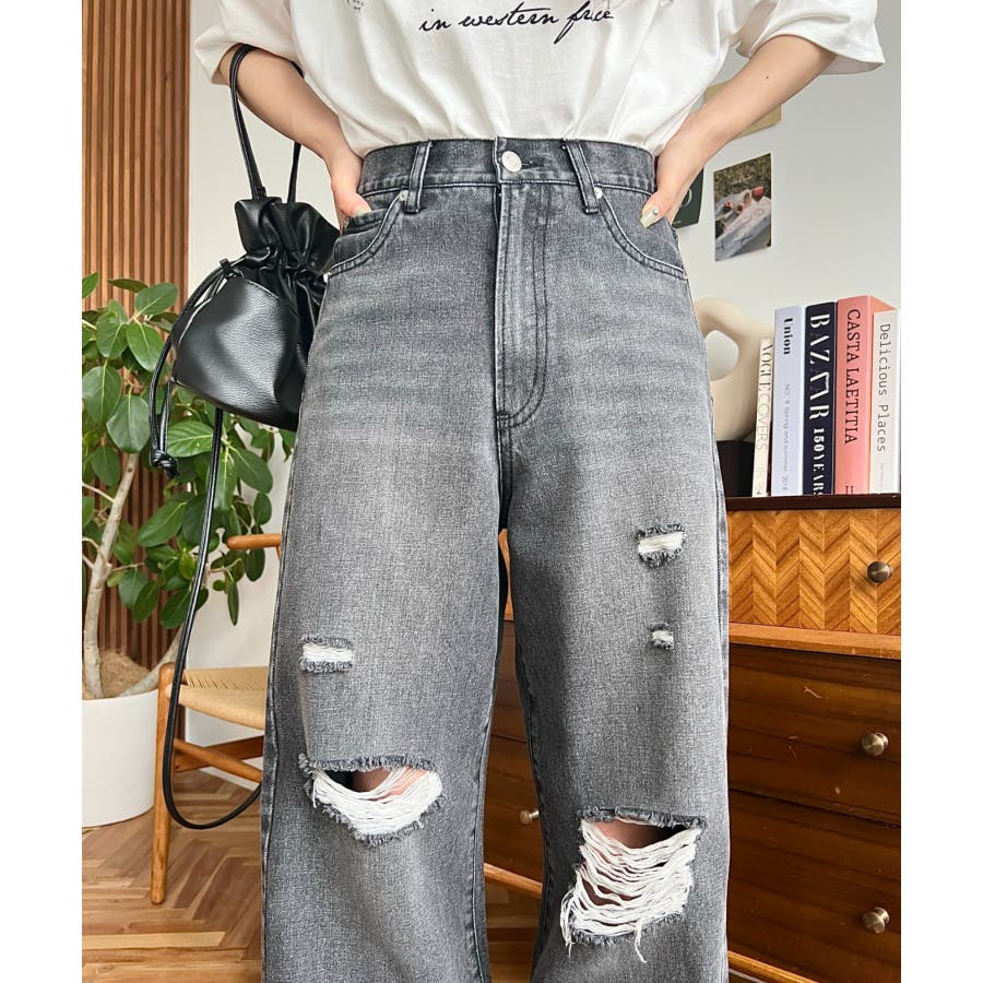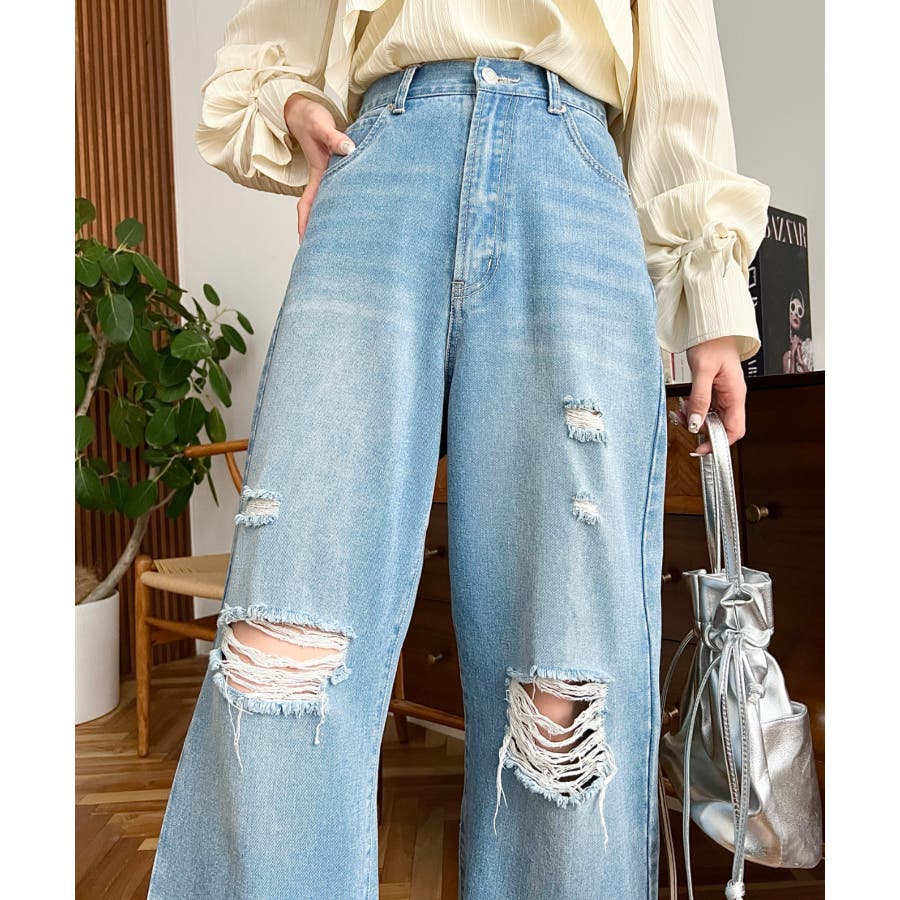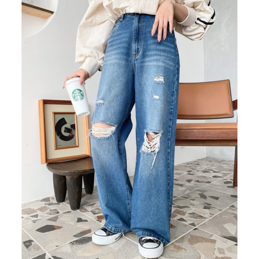 ・ラフなシルエットのセミワイドパンツにクラッシュダメージ加工を施したトレンド感あふれるウォッシュデニム。