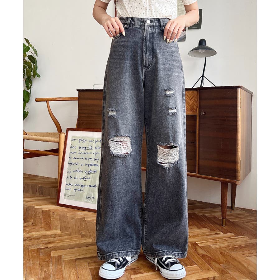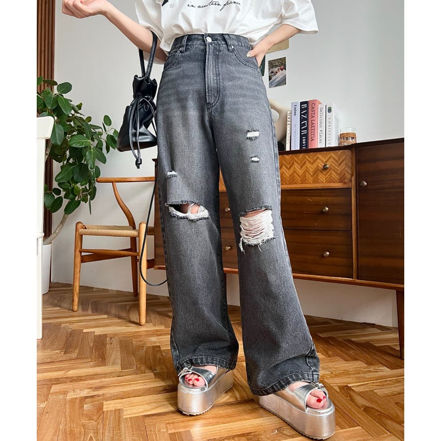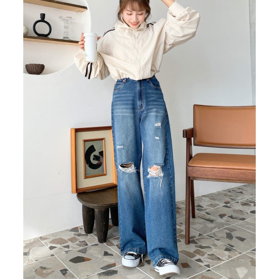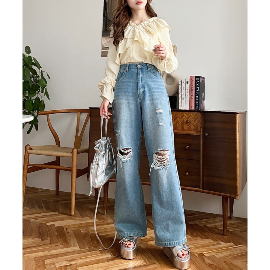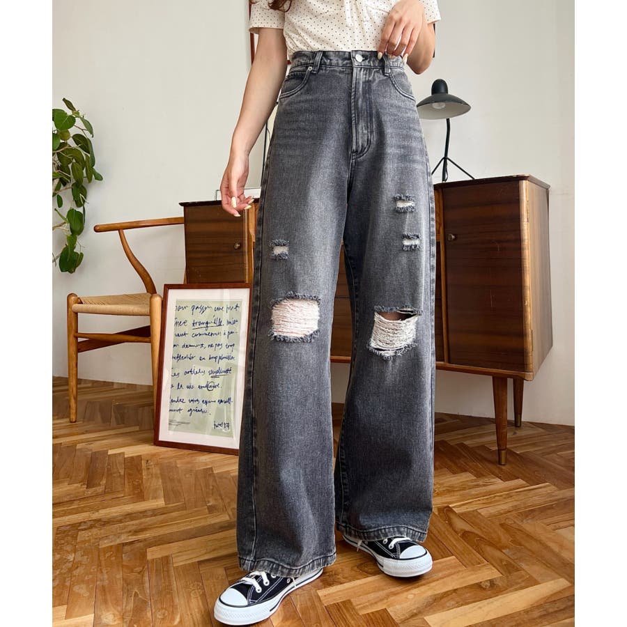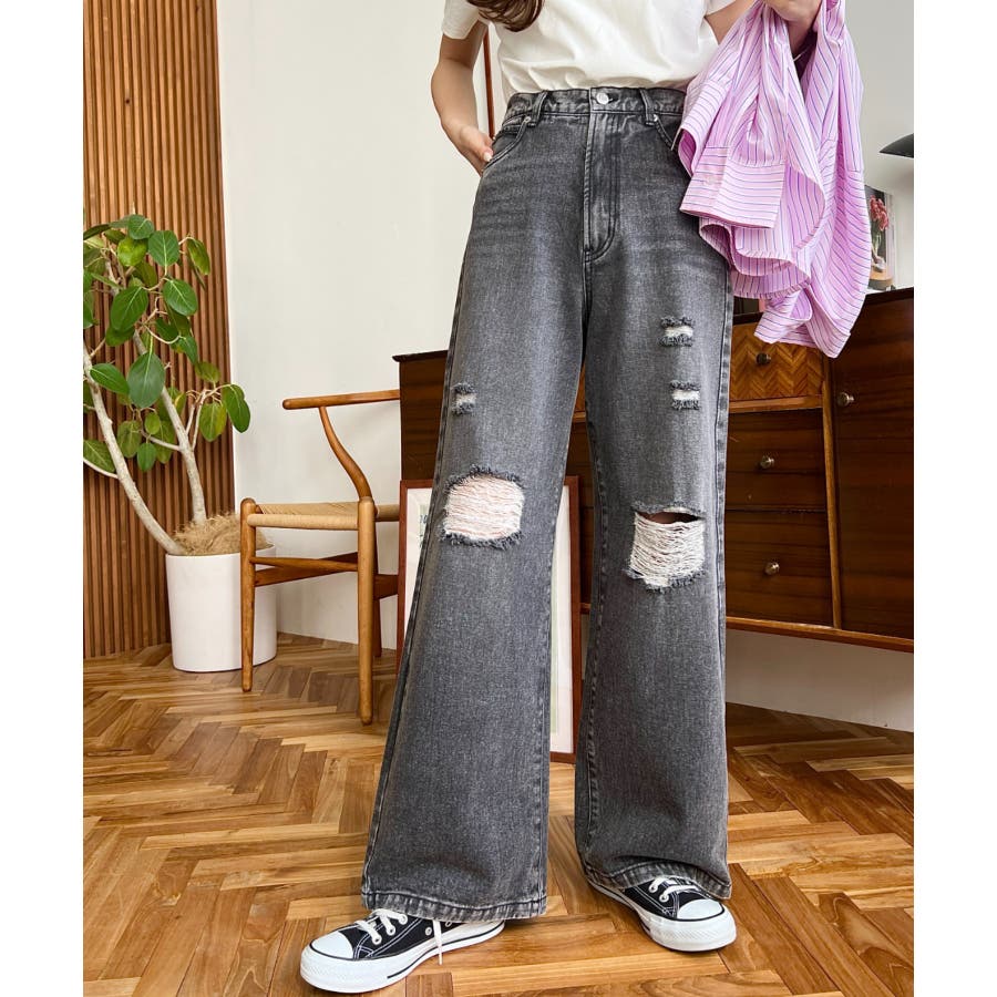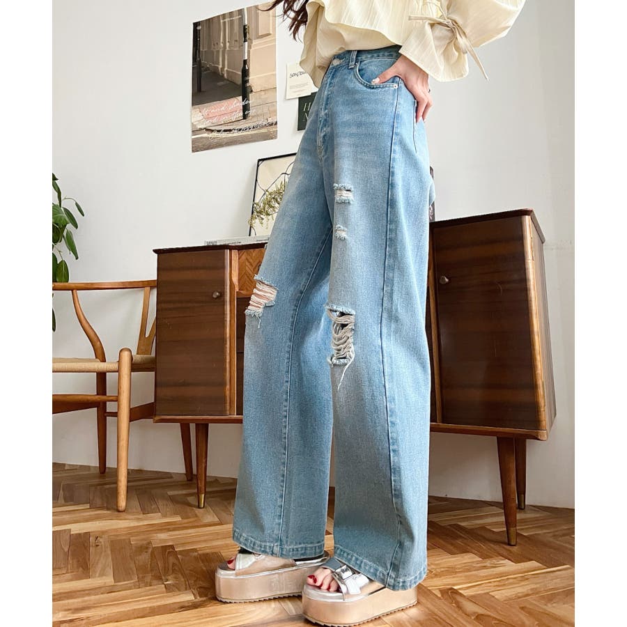 ・ラフなシルエットのセミワイドパンツにクラッシュダメージ加工を施したトレンド感あふれるウォッシュデニム。
