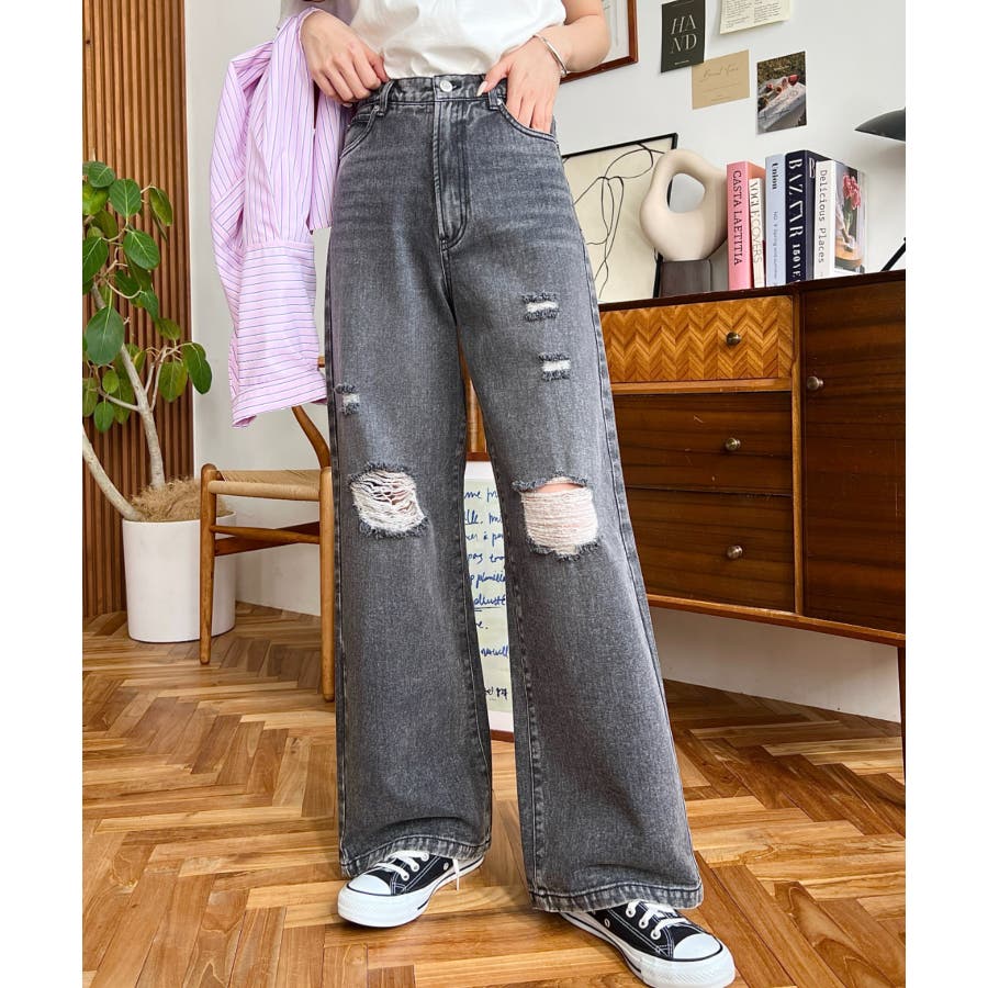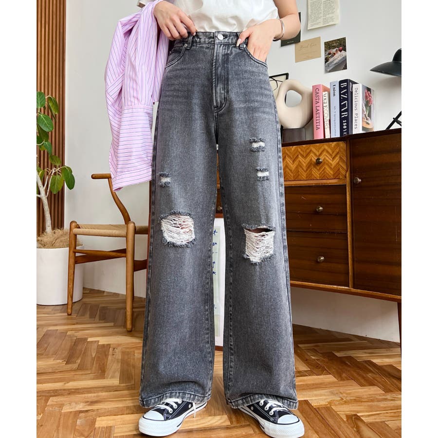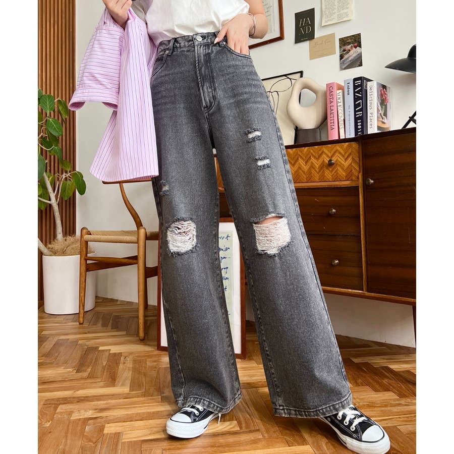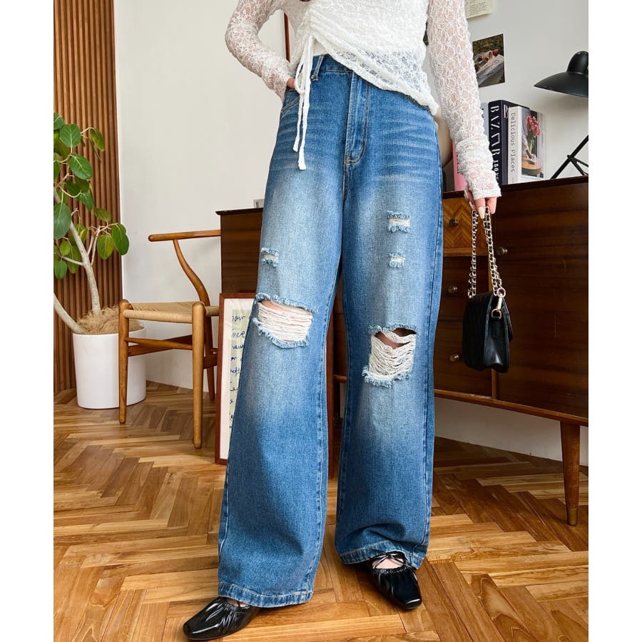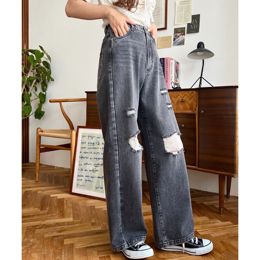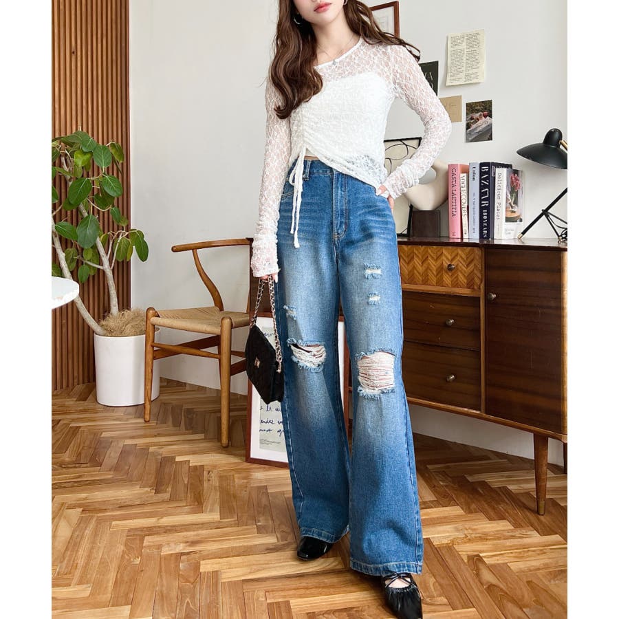 ・ラフなシルエットのセミワイドパンツにクラッシュダメージ加工を施したトレンド感あふれるウォッシュデニム。