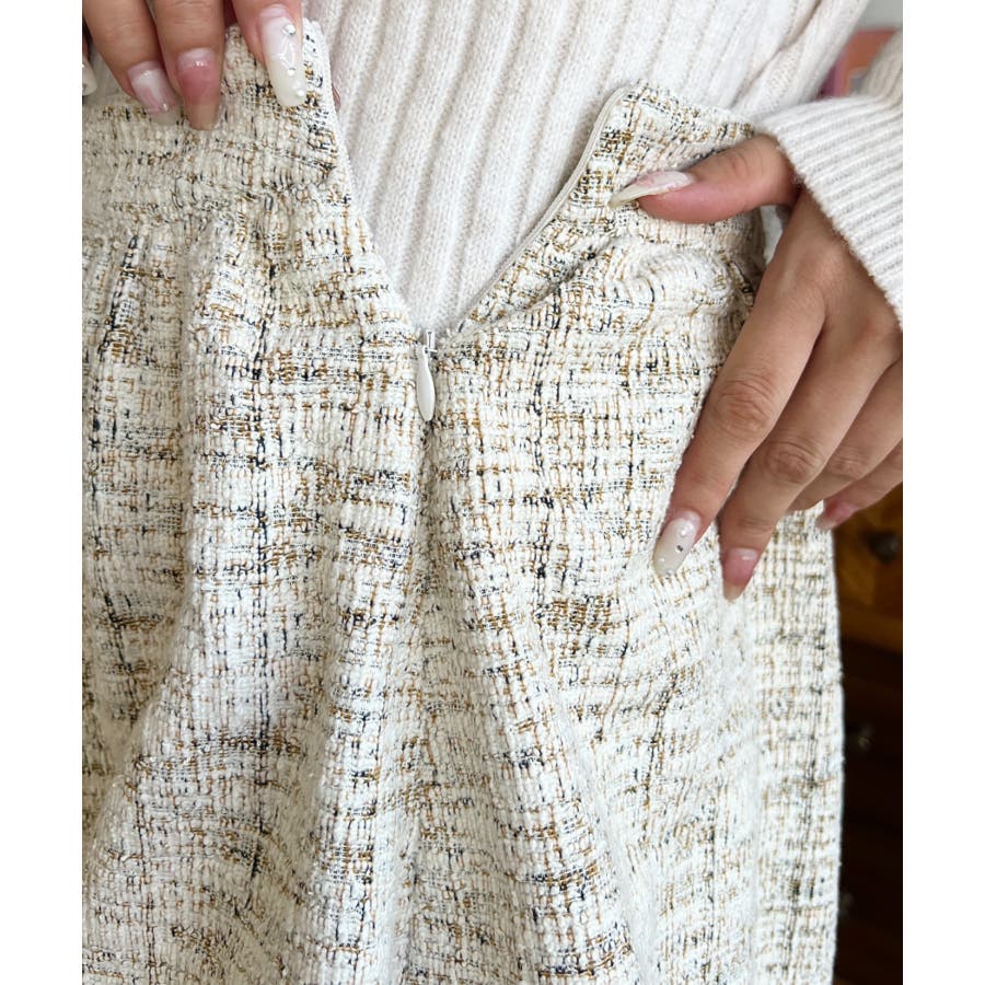 ツイード素材はしっかりしているのに、ウエスト周りも程よくフィットし、座ったり動いたりしても快適な着心地。
