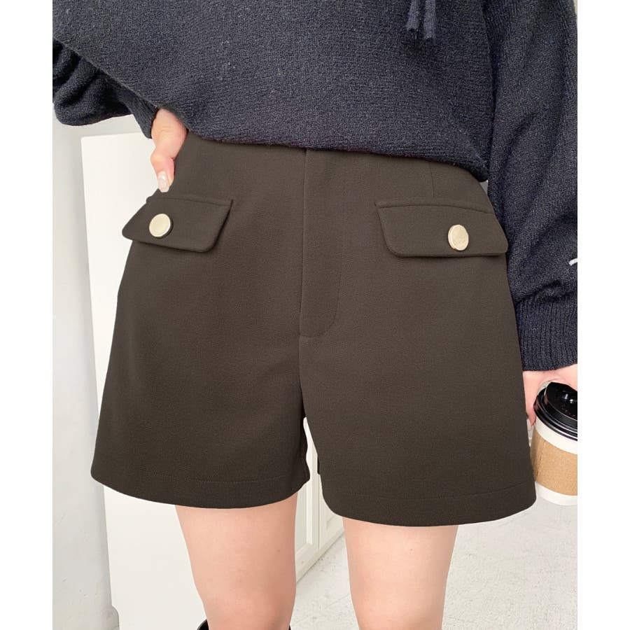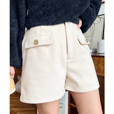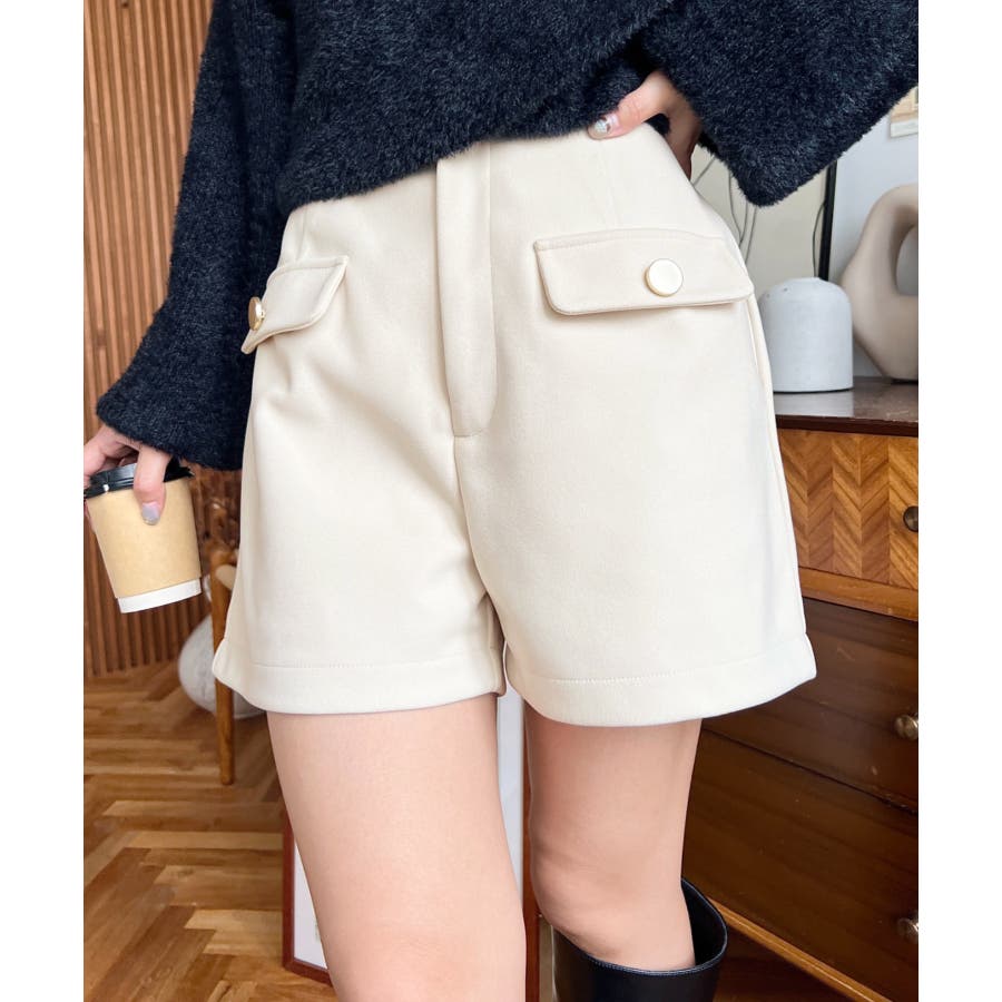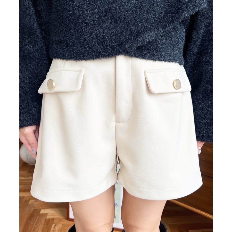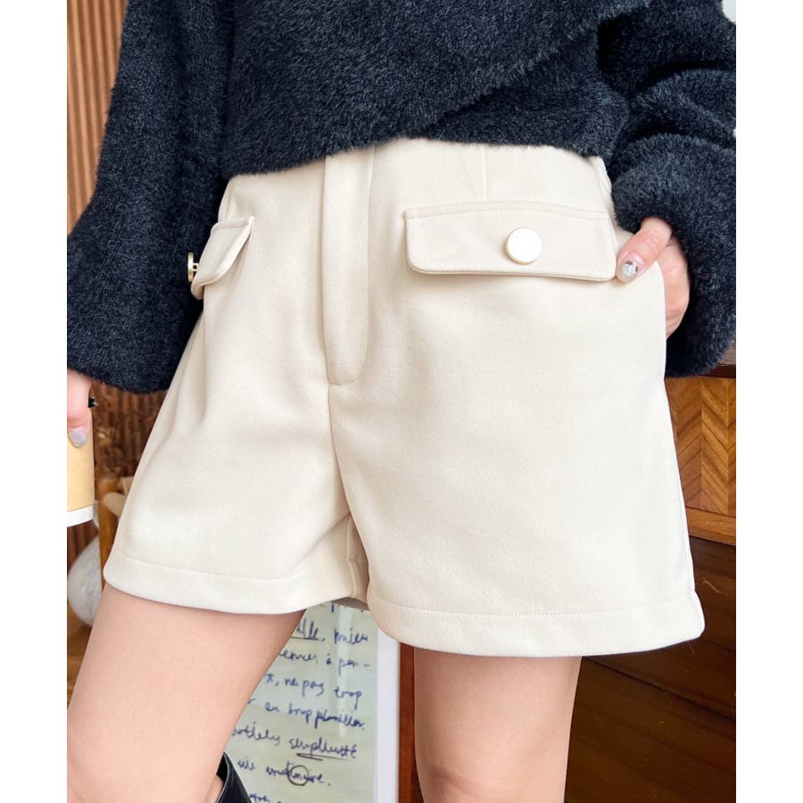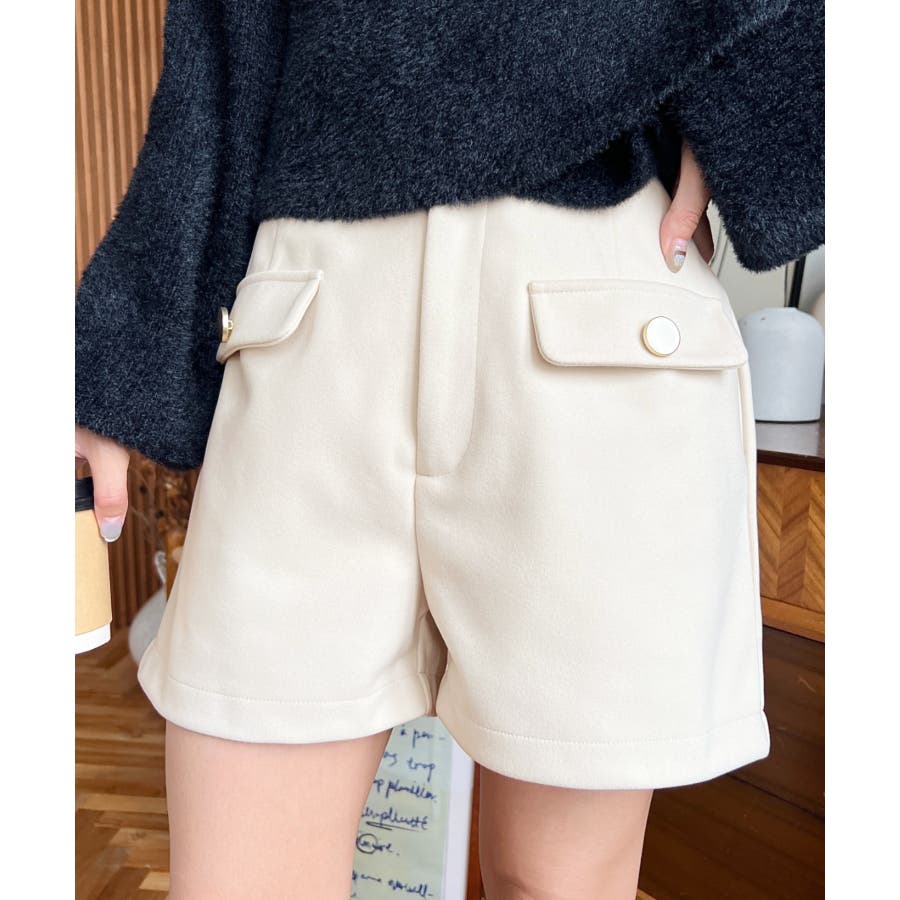 微起毛ウールライク金ボタンフラップショートパンツ