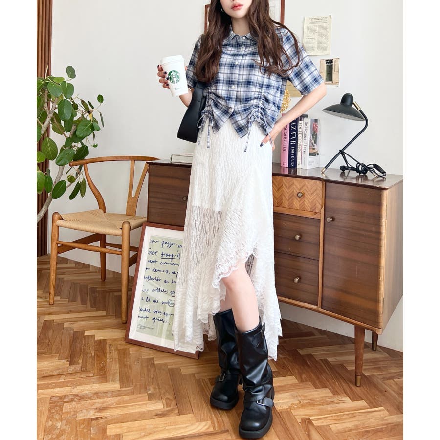 ・ショート丈のトップス×ふわっとレーススカートと合わせ脚長コーデでスタイルアップに◎