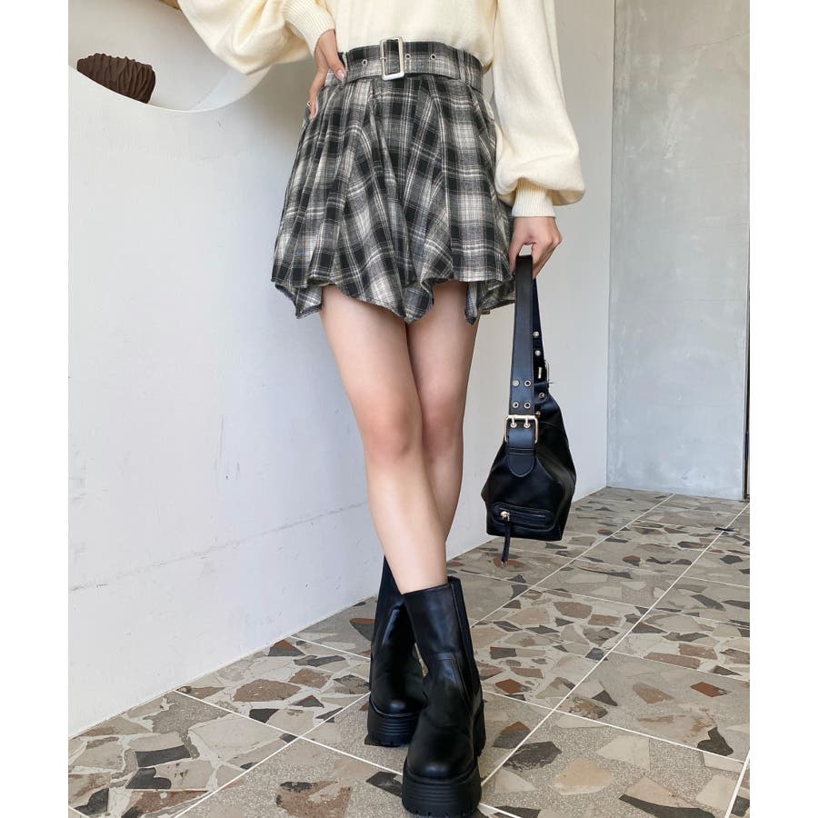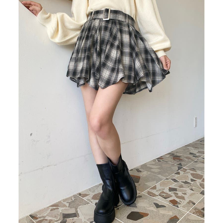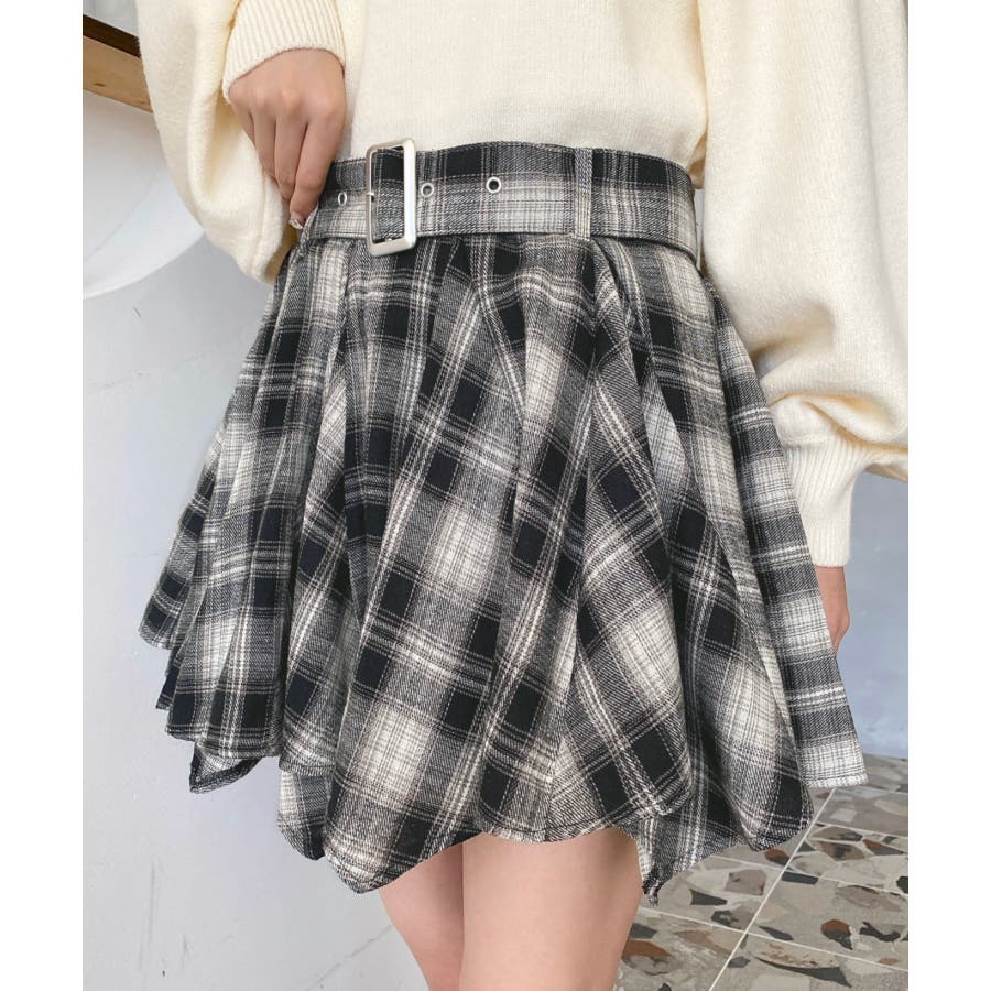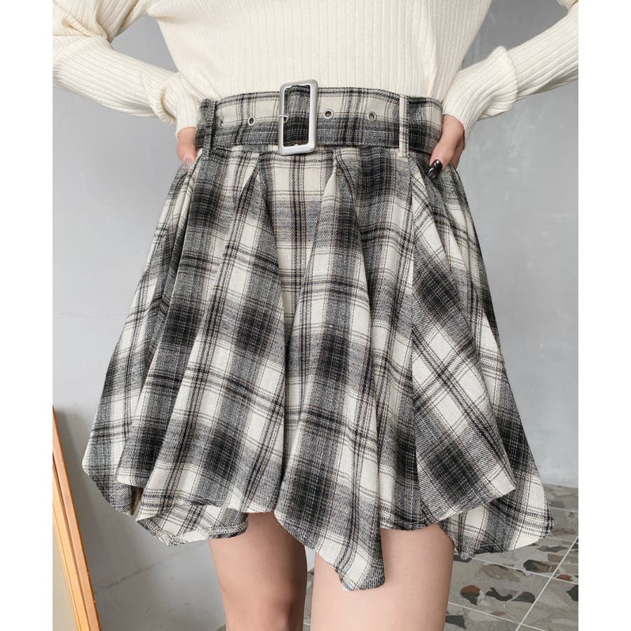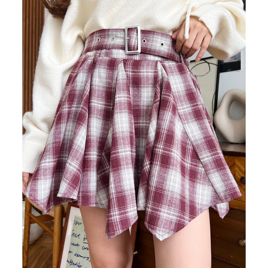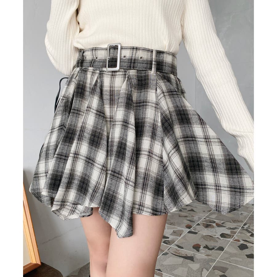 ベルト付きアシメヘムタックプリーツチェック柄ミニスカート