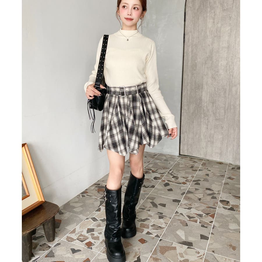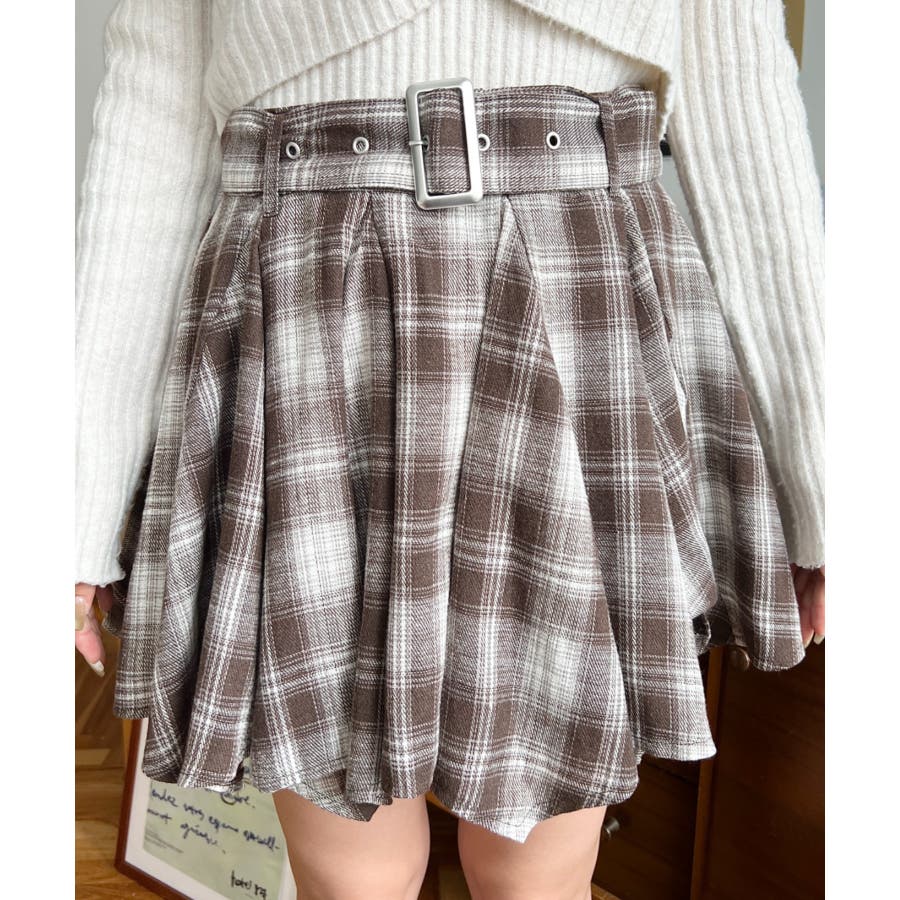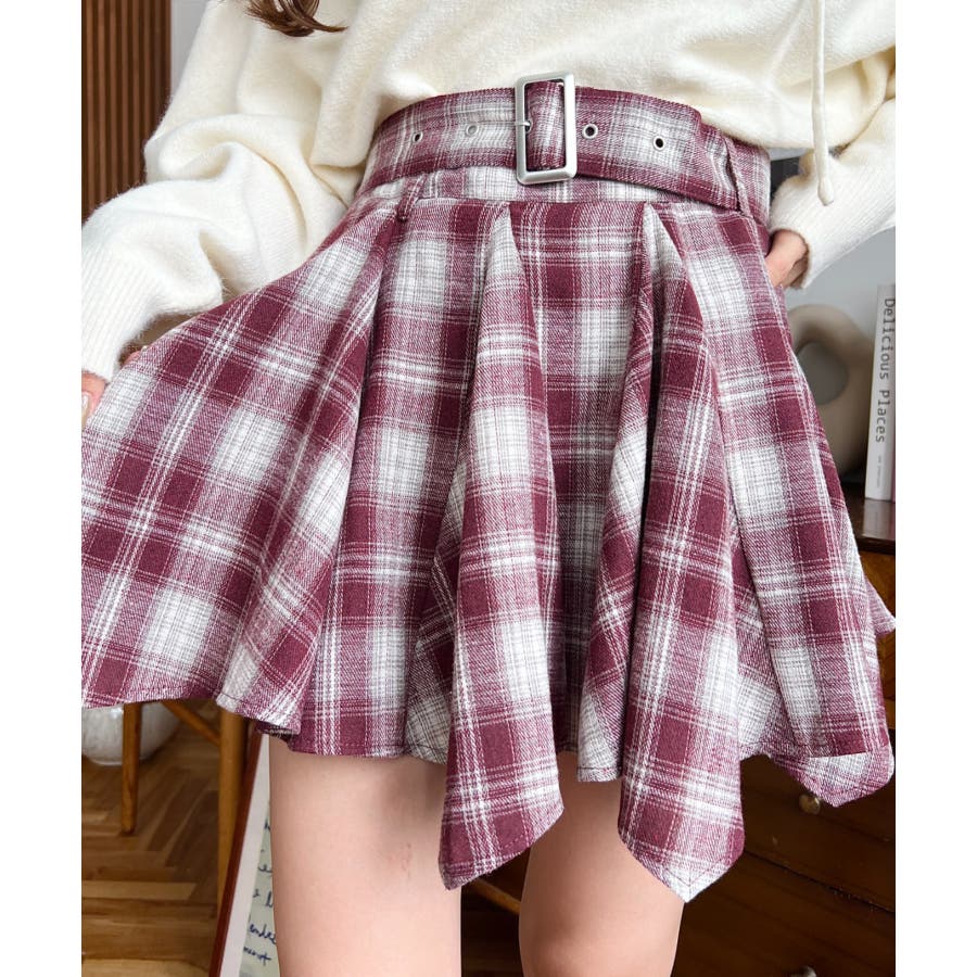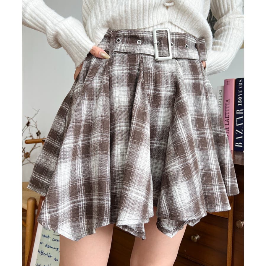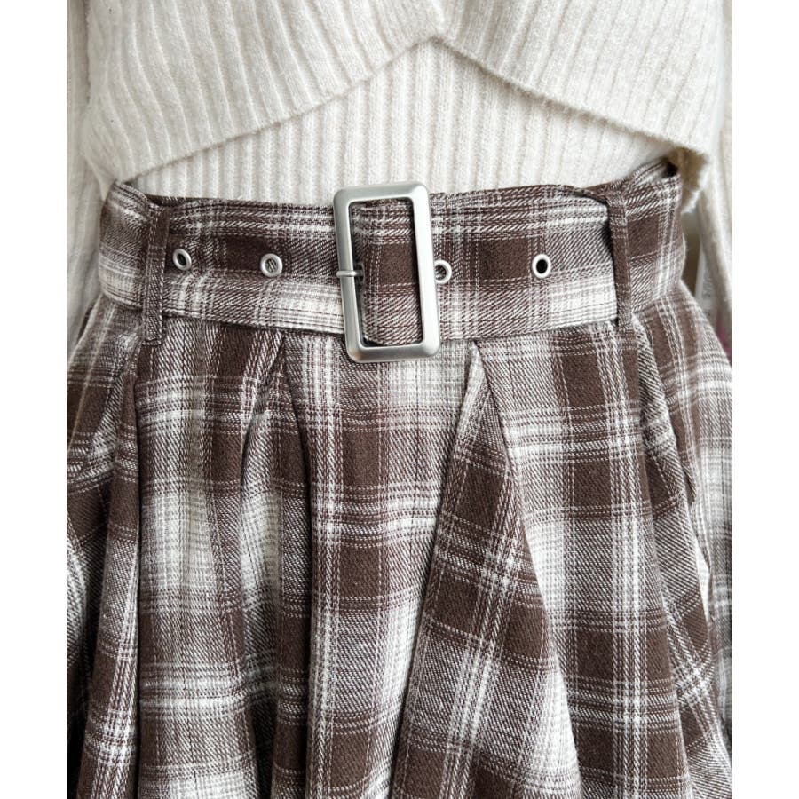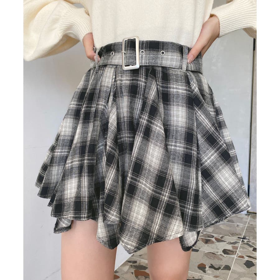 ベルト付きアシメヘムタックプリーツチェック柄ミニスカート