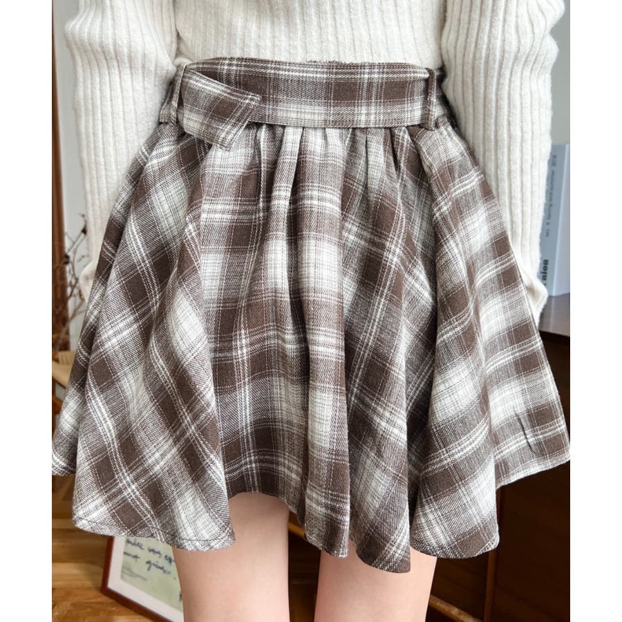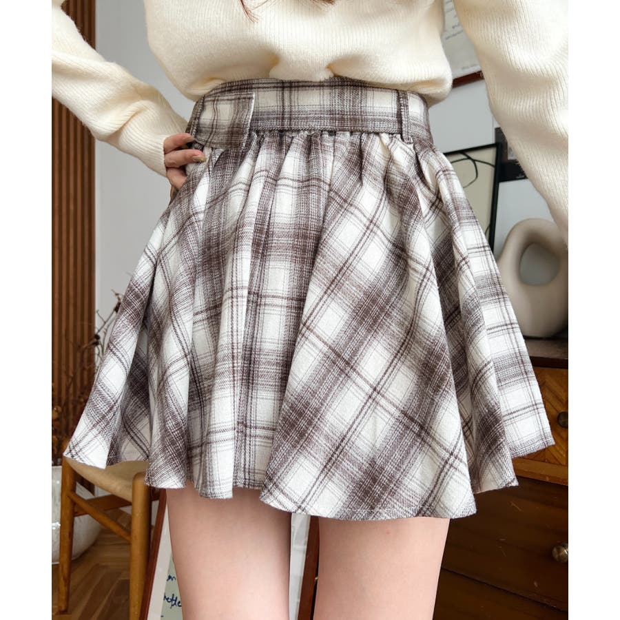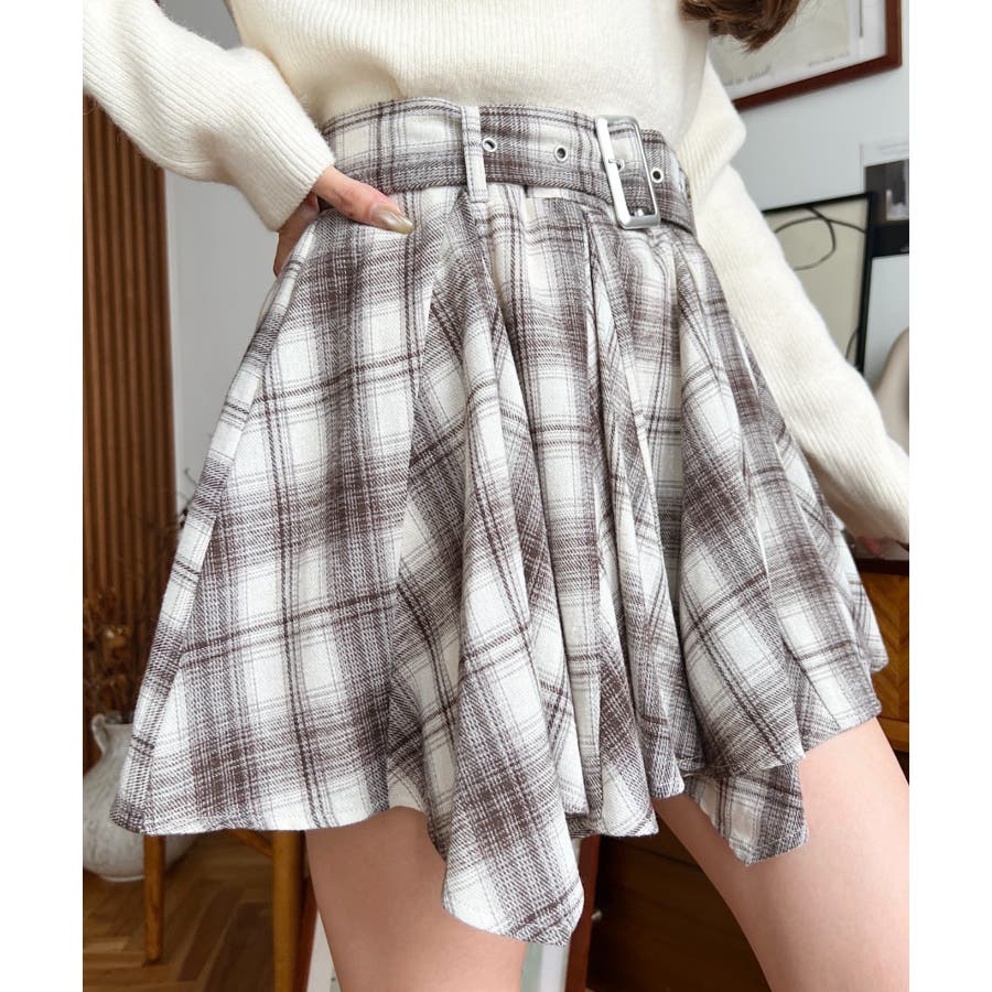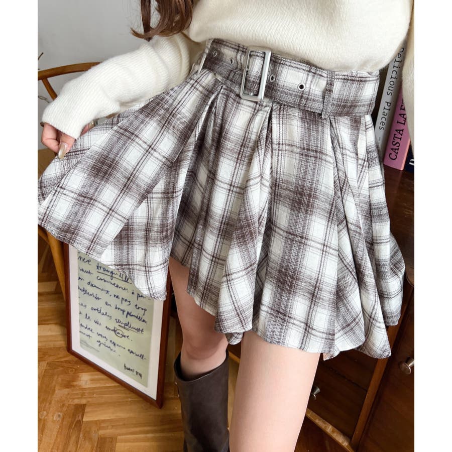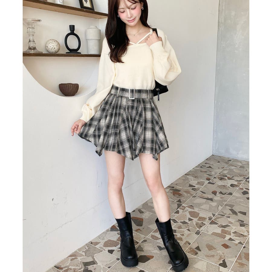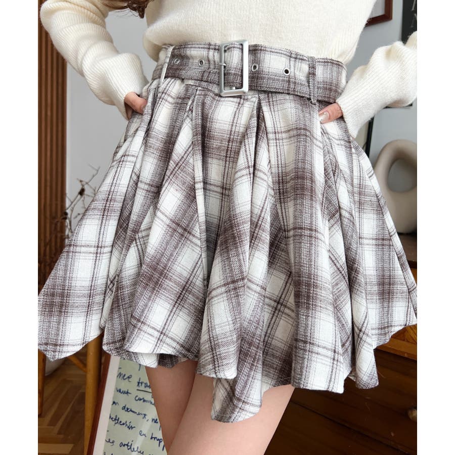 ベルト付きアシメヘムタックプリーツチェック柄ミニスカート