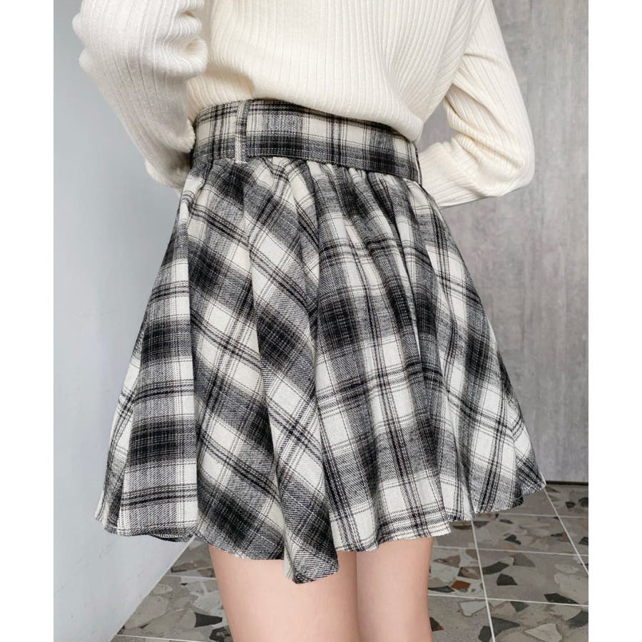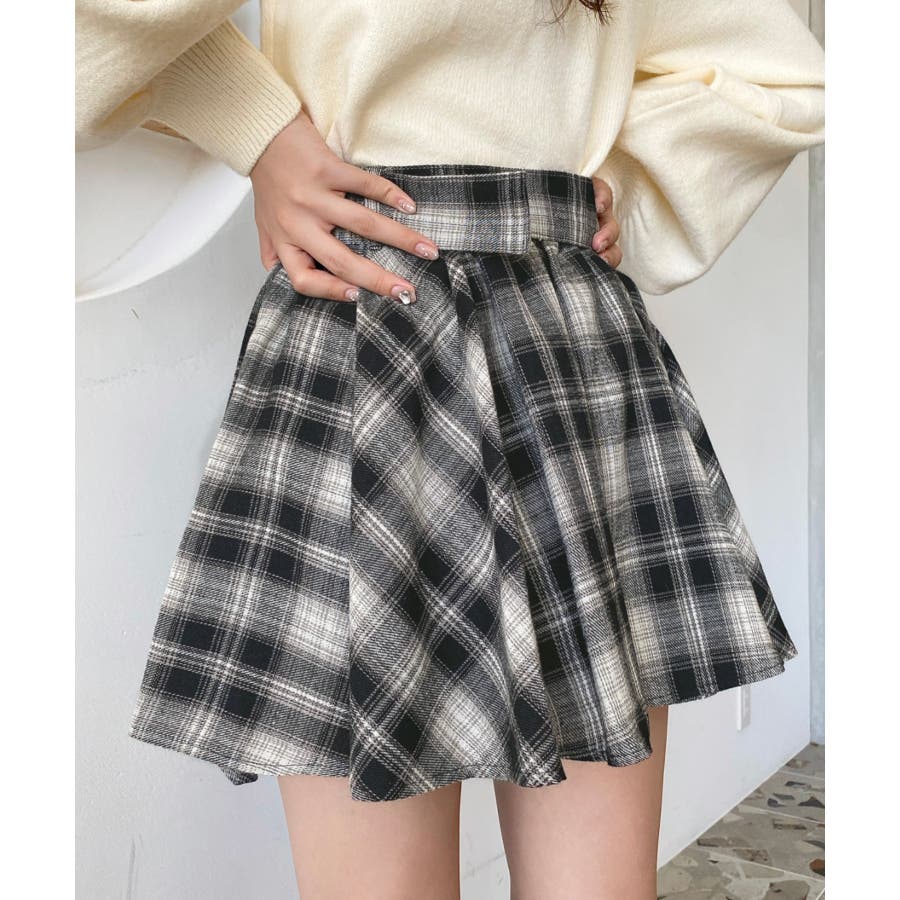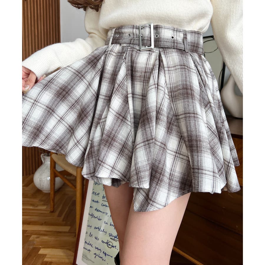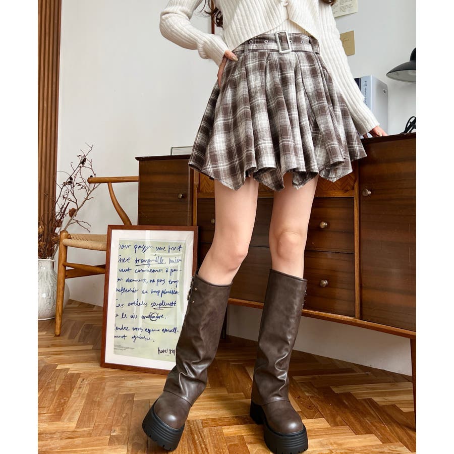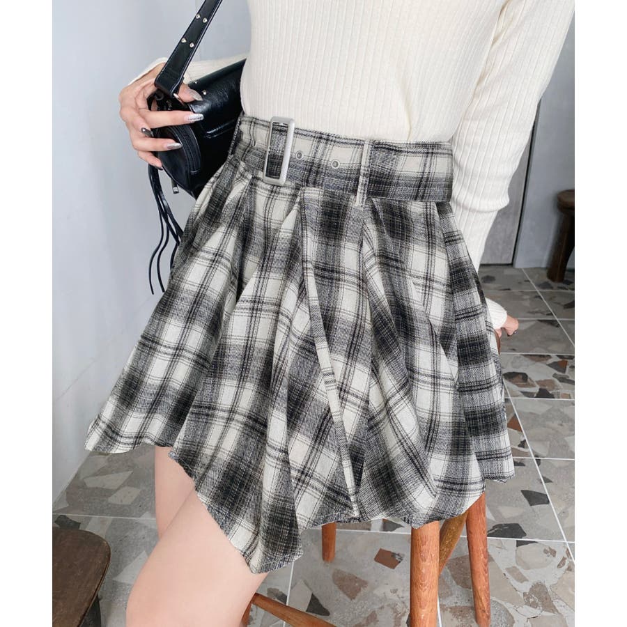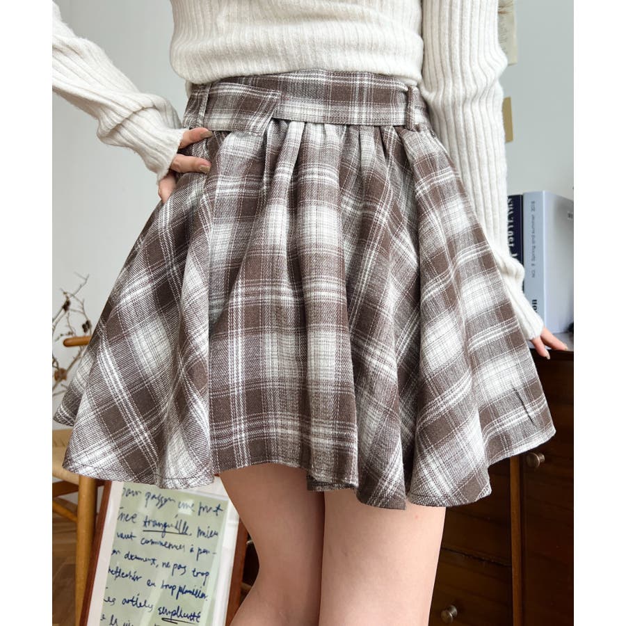 ベルト付きアシメヘムタックプリーツチェック柄ミニスカート
