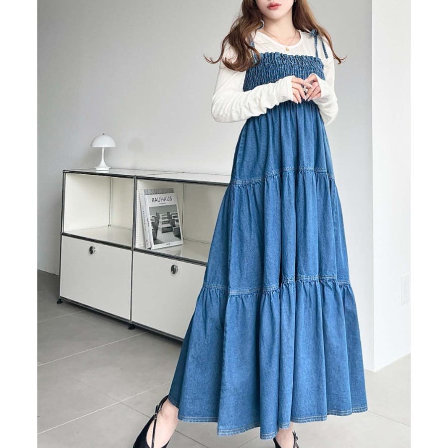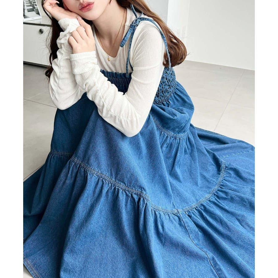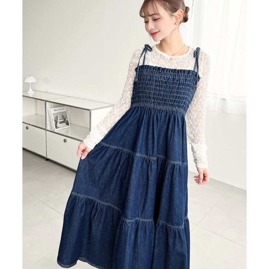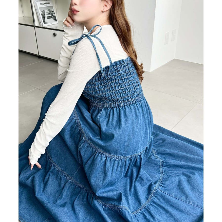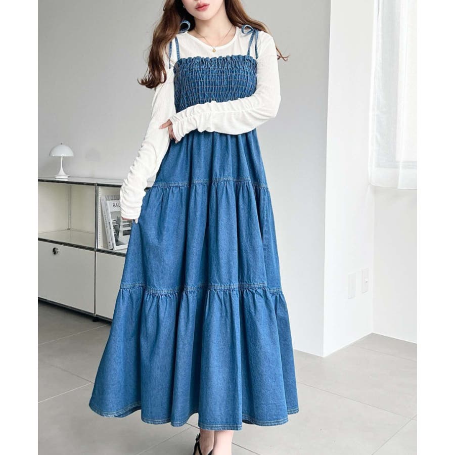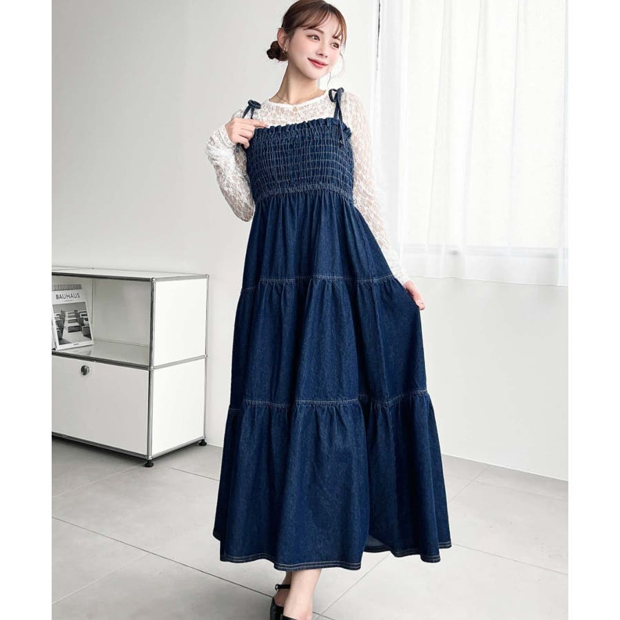 ライトオンスデニムシャーリングティアードキャミワンピース(デニムワンピース)