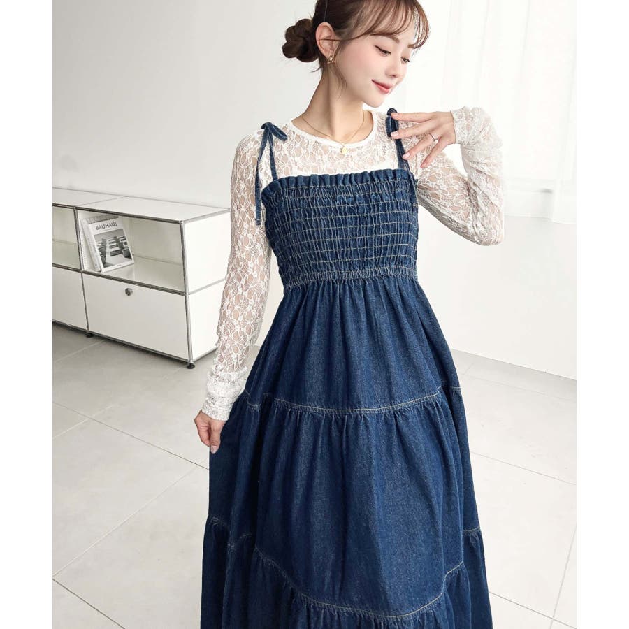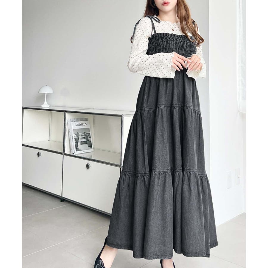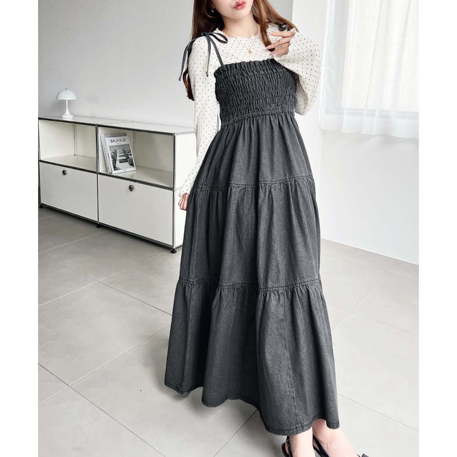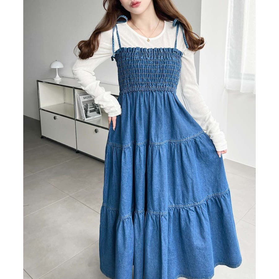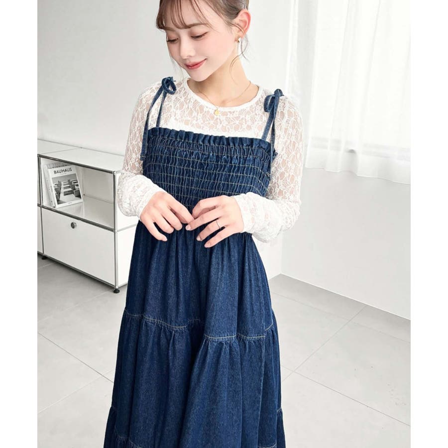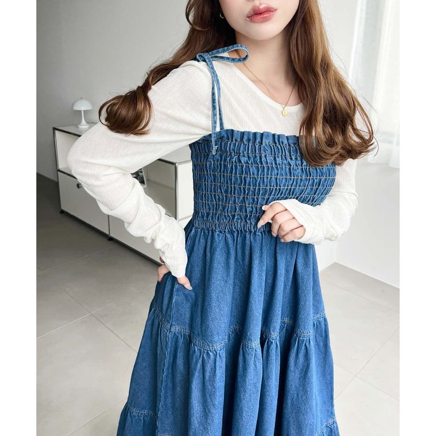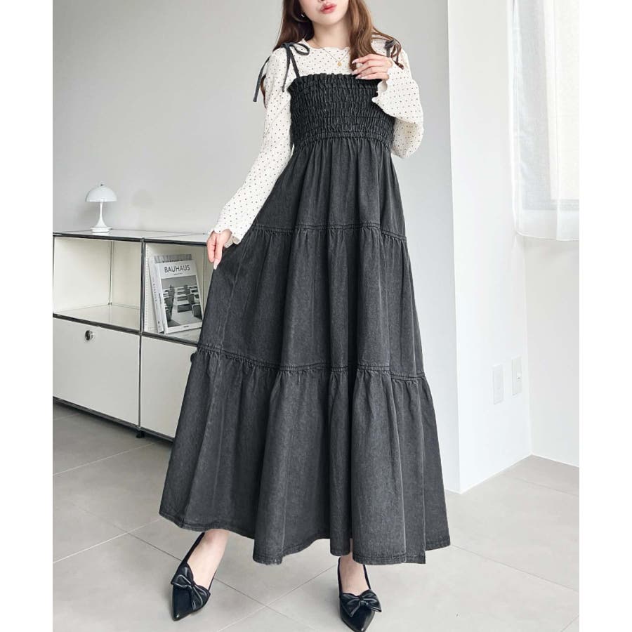 ライトオンスデニムシャーリングティアードキャミワンピース(デニムワンピース)