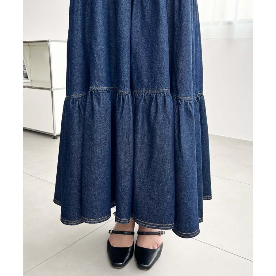 ・デニム素材に甘めなデザインがプラスされトレンド感UP、さらにたっぷり長さがあることで目を惹く一枚です!