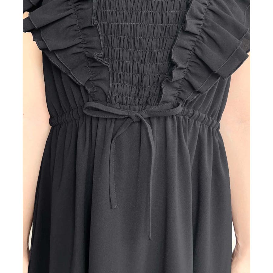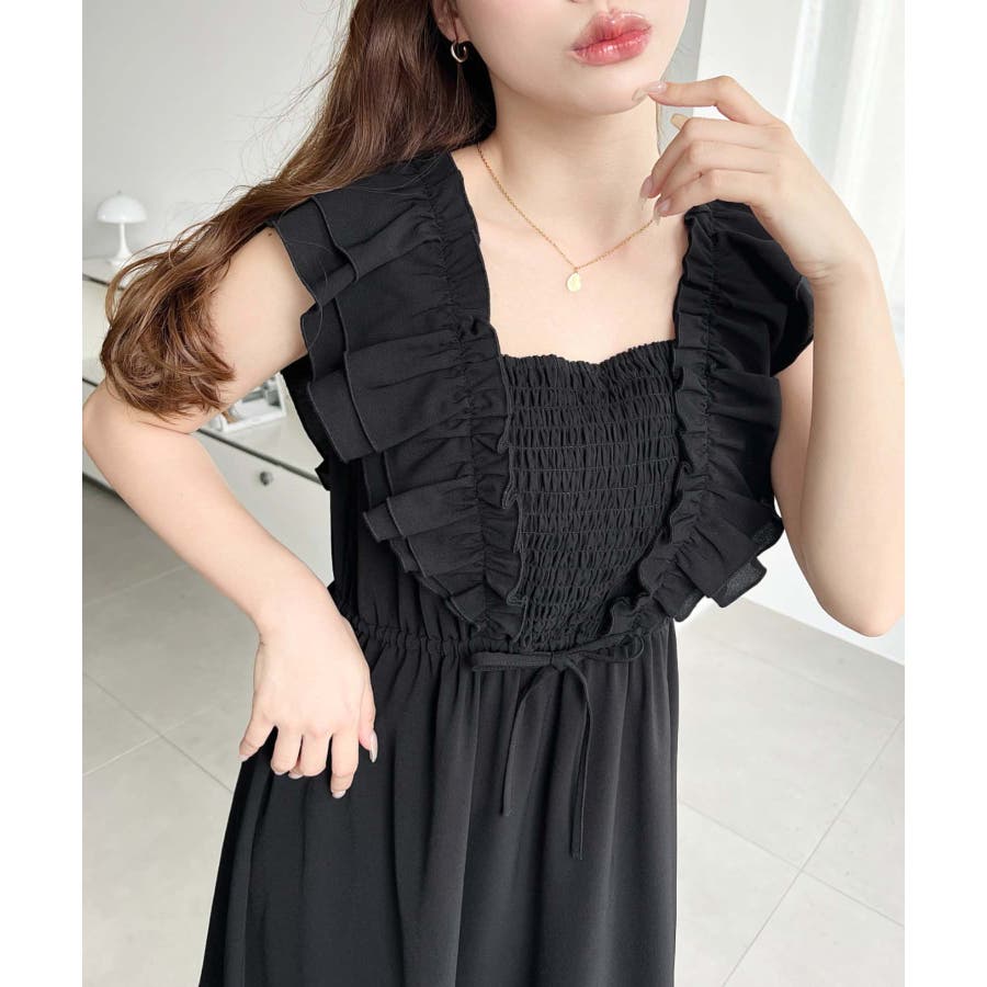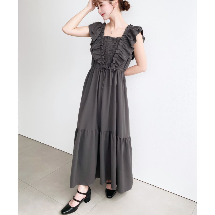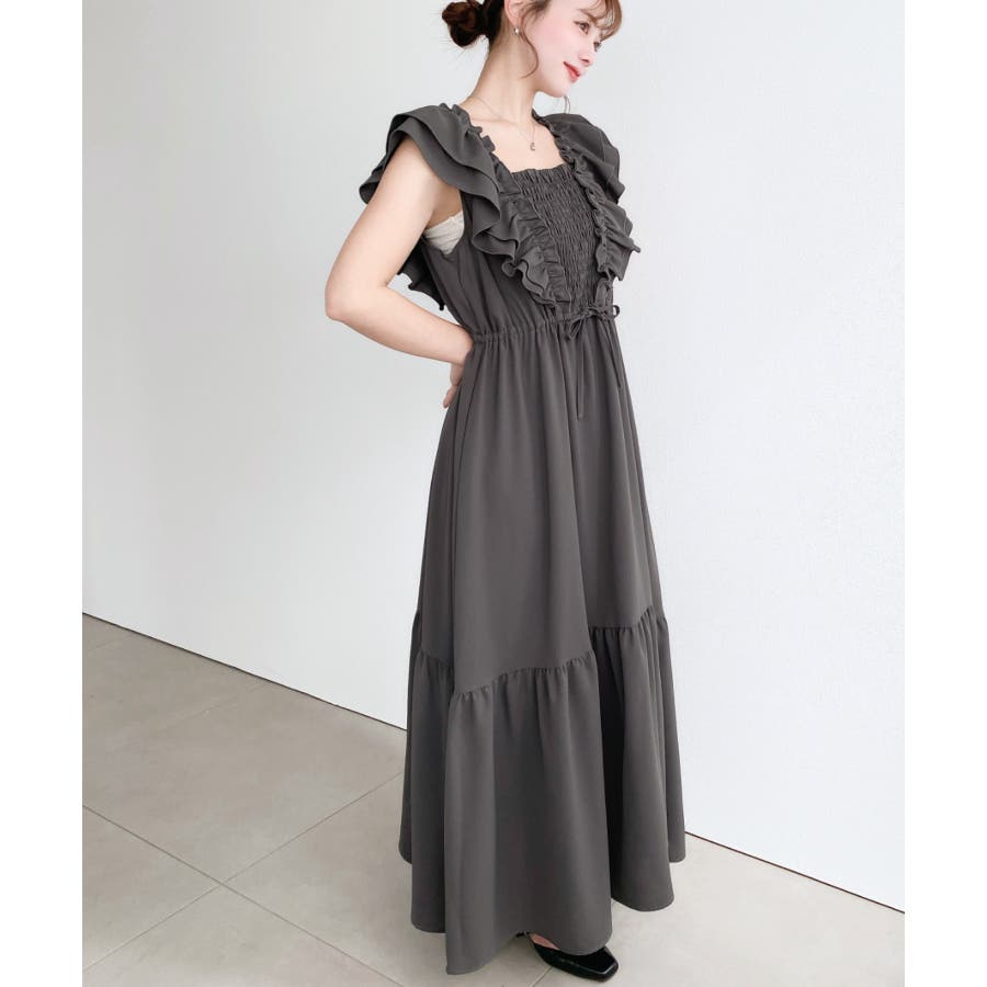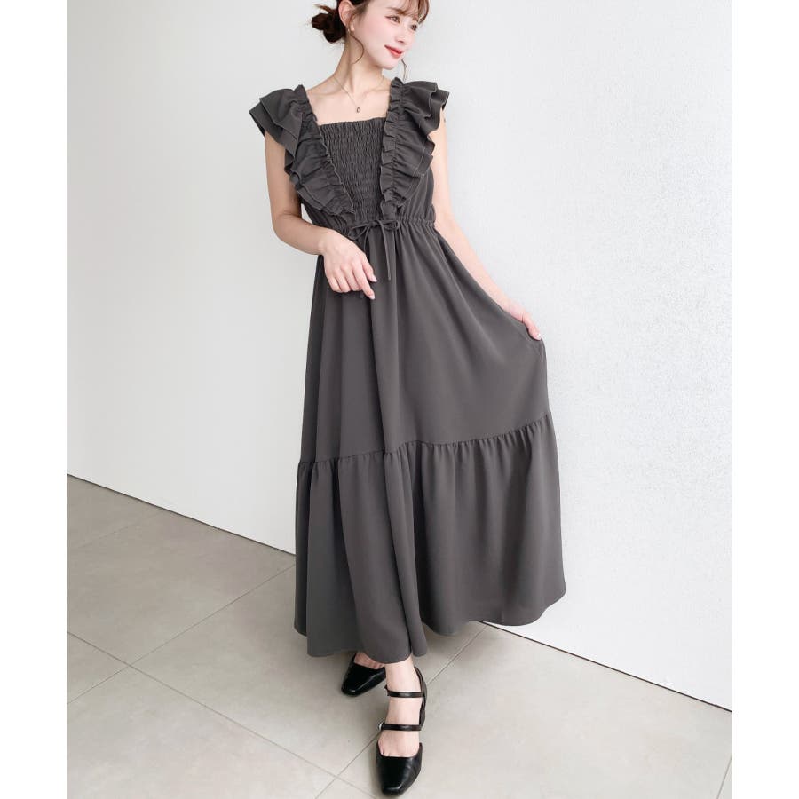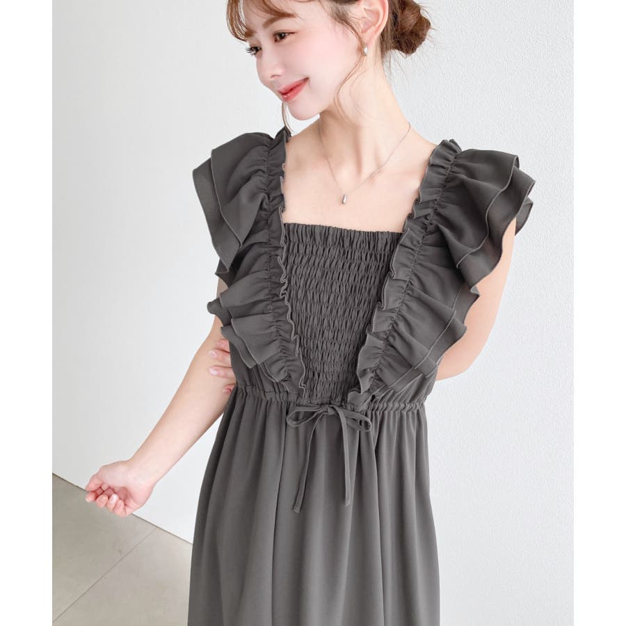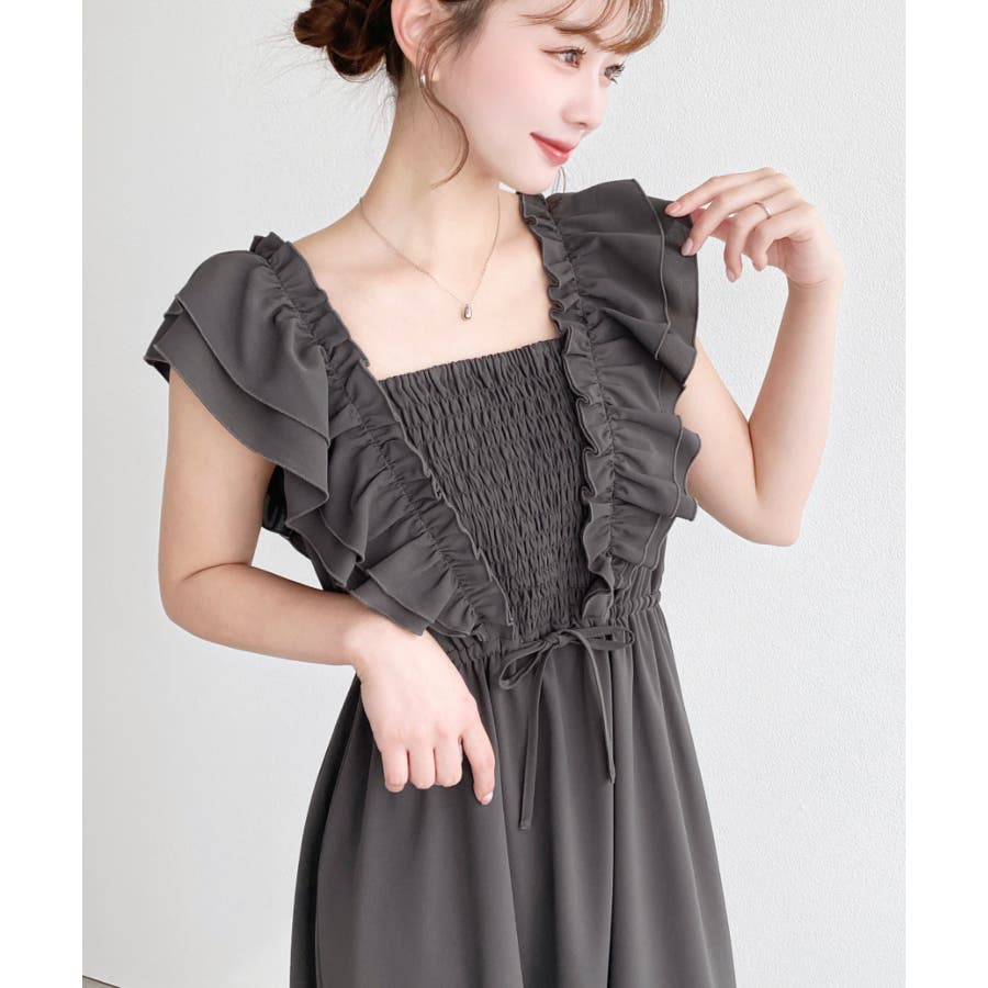 ・フロントのシャーリングデザインが印象的な、1枚で着映えるフリルワンピース。