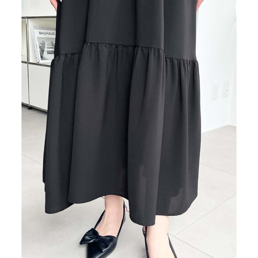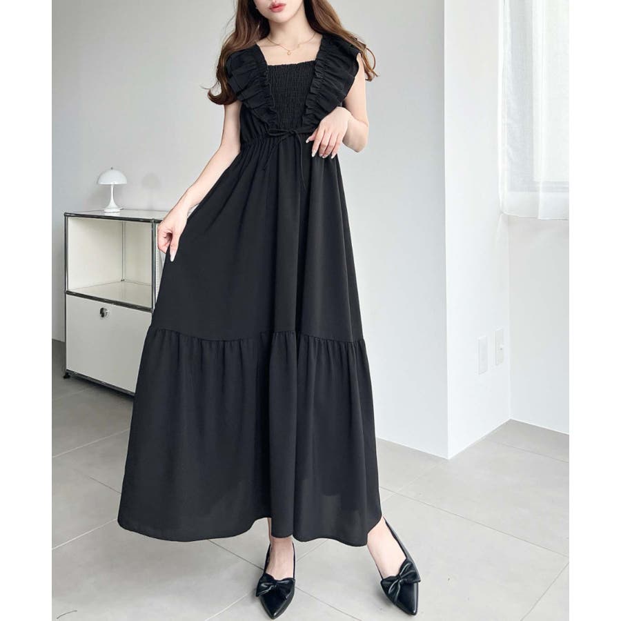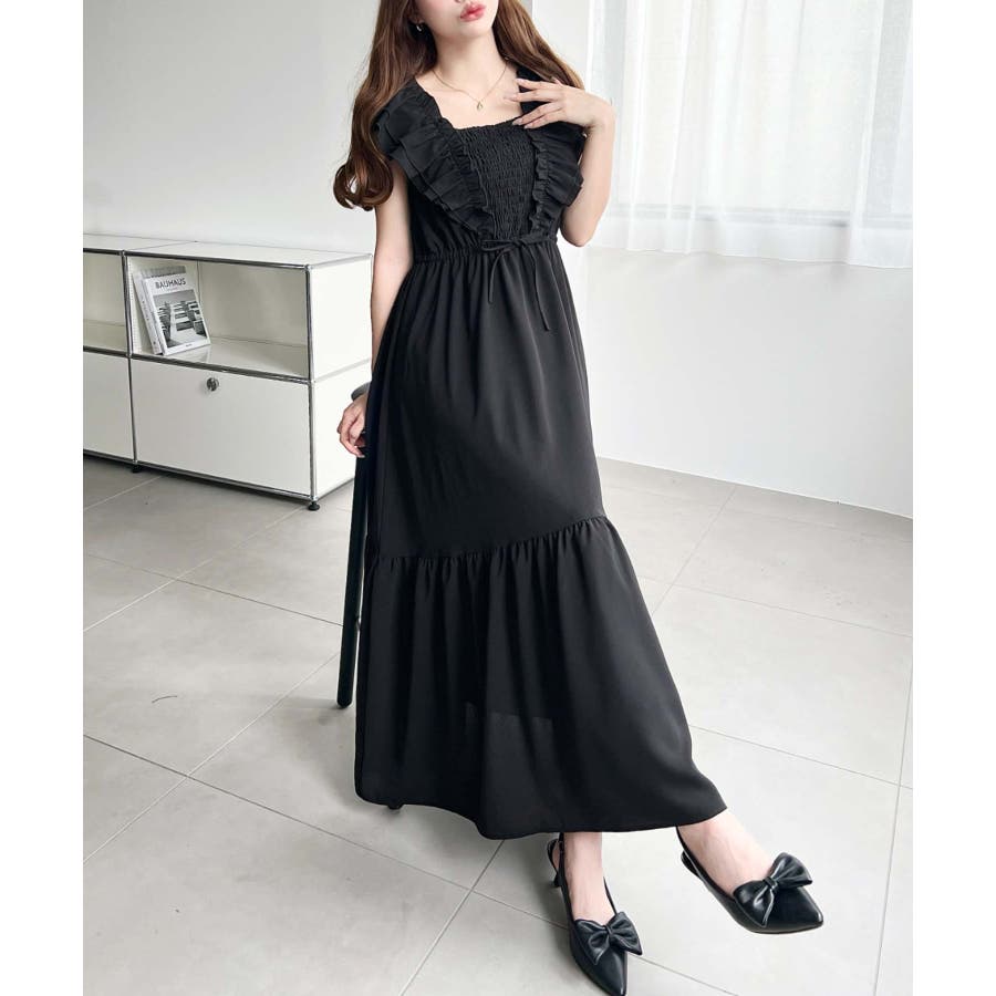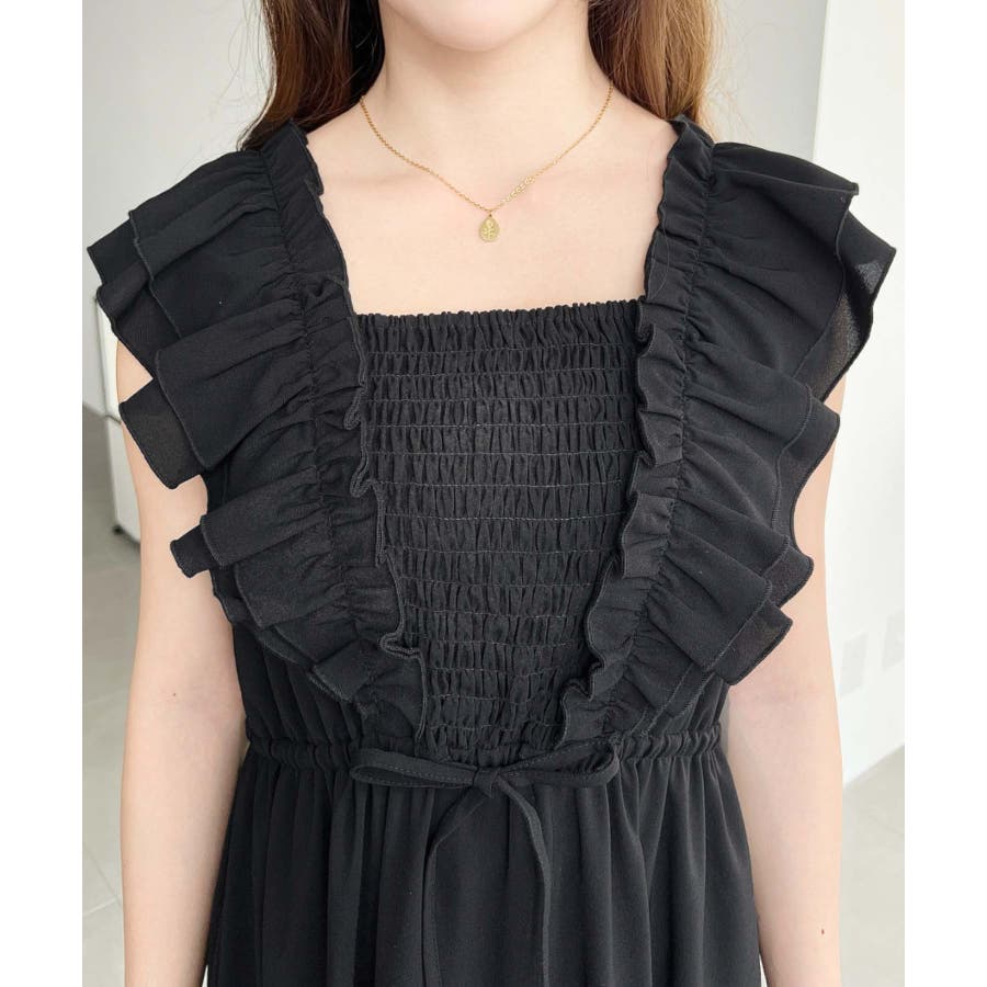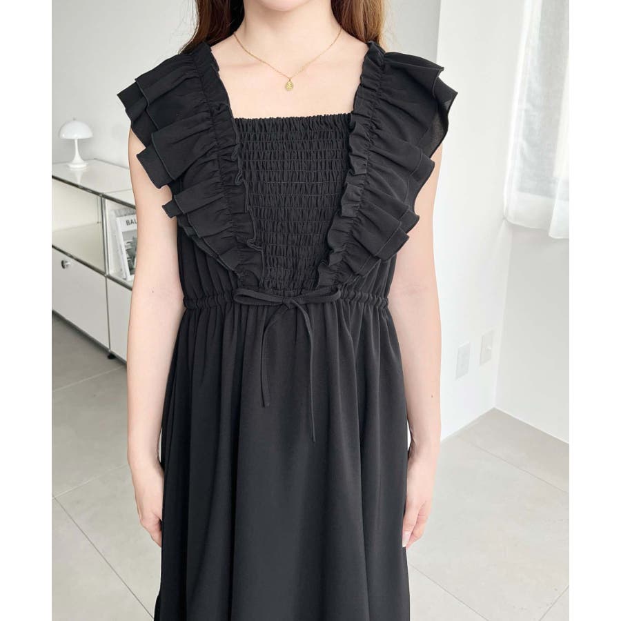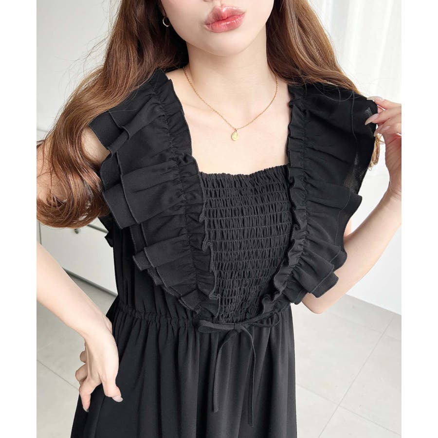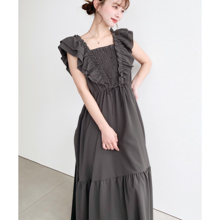 ・フロントのシャーリングデザインが印象的な、1枚で着映えるフリルワンピース。