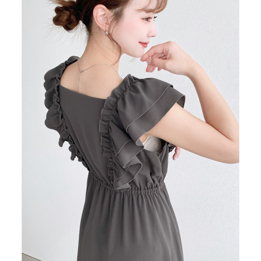 ・重なり合う袖のフリルが動くたびふわっと揺れて華やかな印象に。フレンチスリーブが上品さを保ちつつ、涼しげな抜け感をプラス。