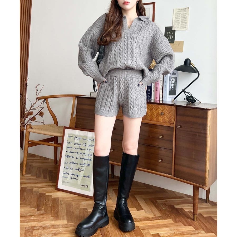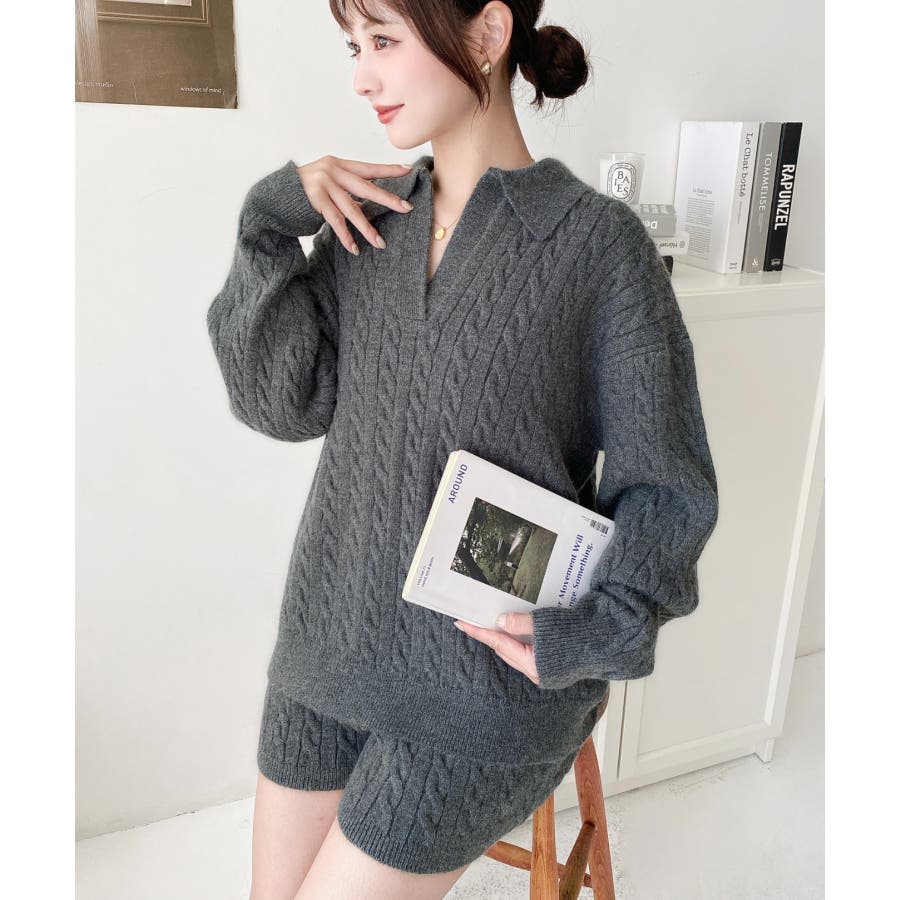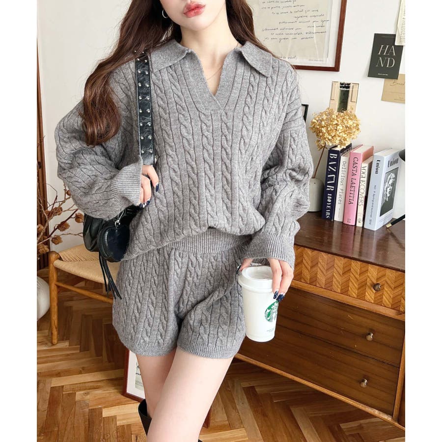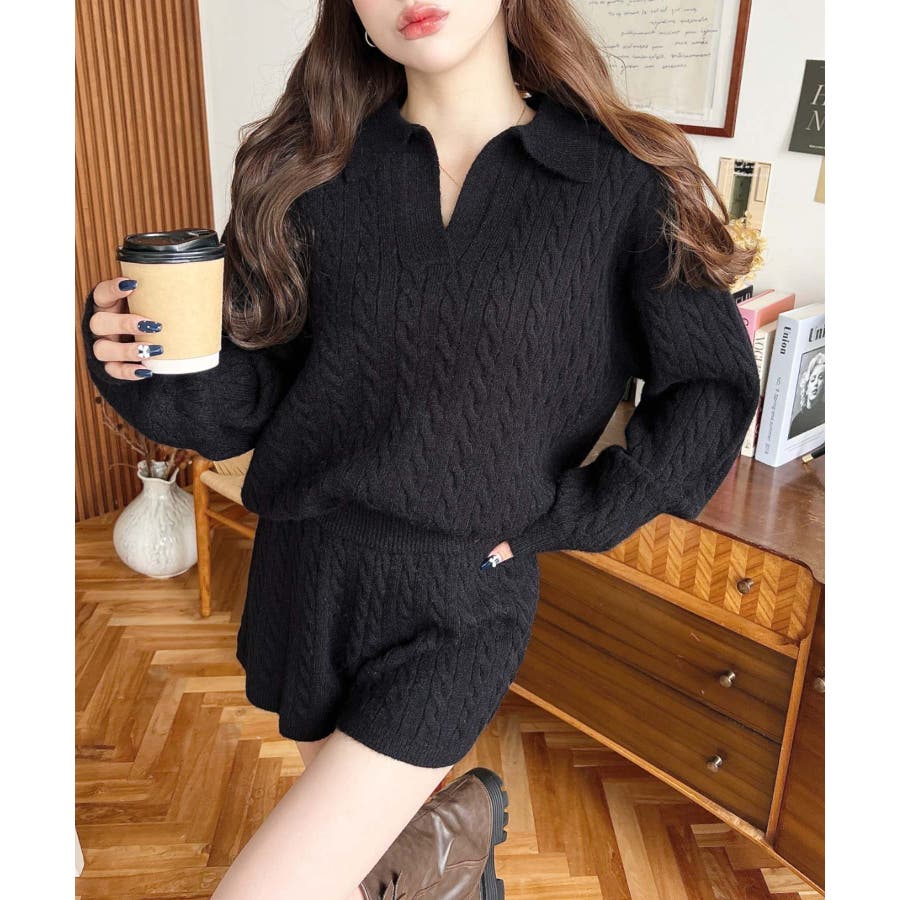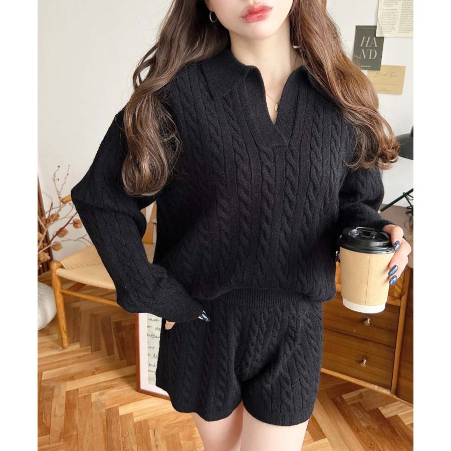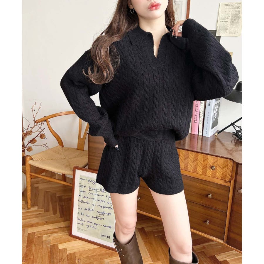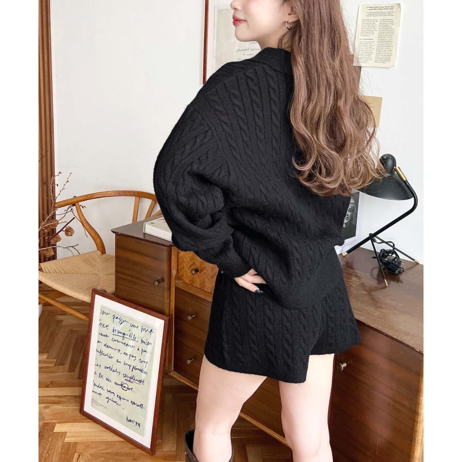 《セットアップ》ケーブル編みポロ&ショートパンツセットアップニット